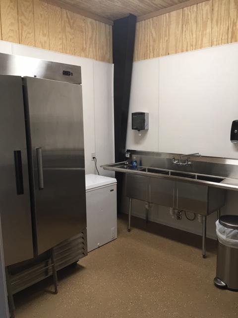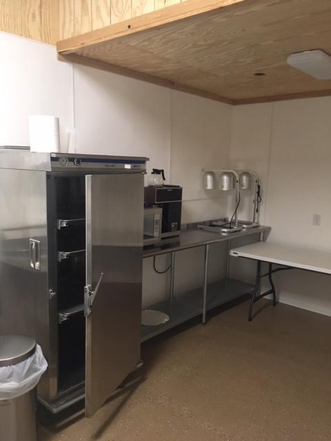 * large refrigerator * freezer * double-basin sink * hot box * microwave * 8' table * air conditioned
