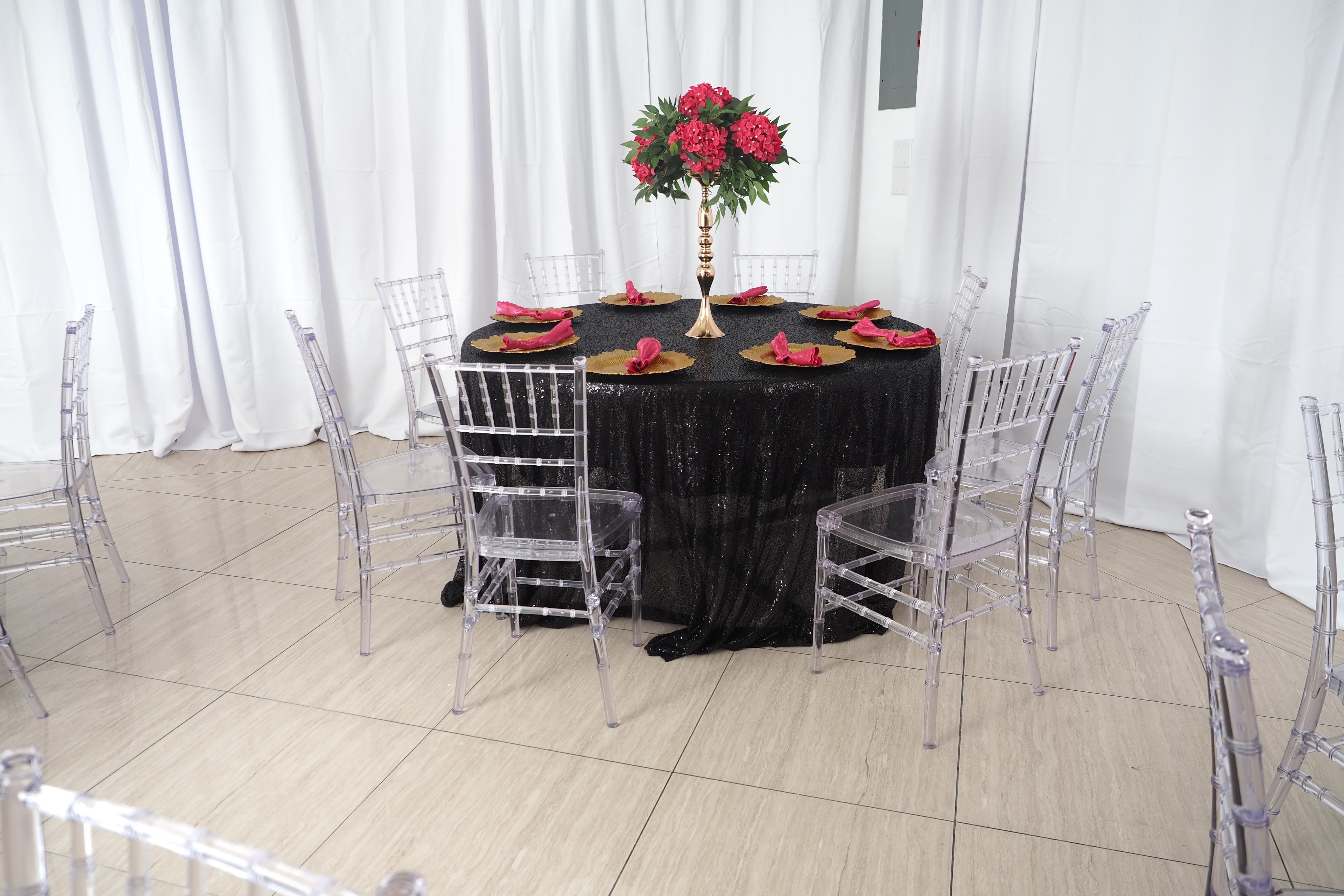 -dimmable lighting -smart tv -food and bar station -Chiavari clear chairs and table