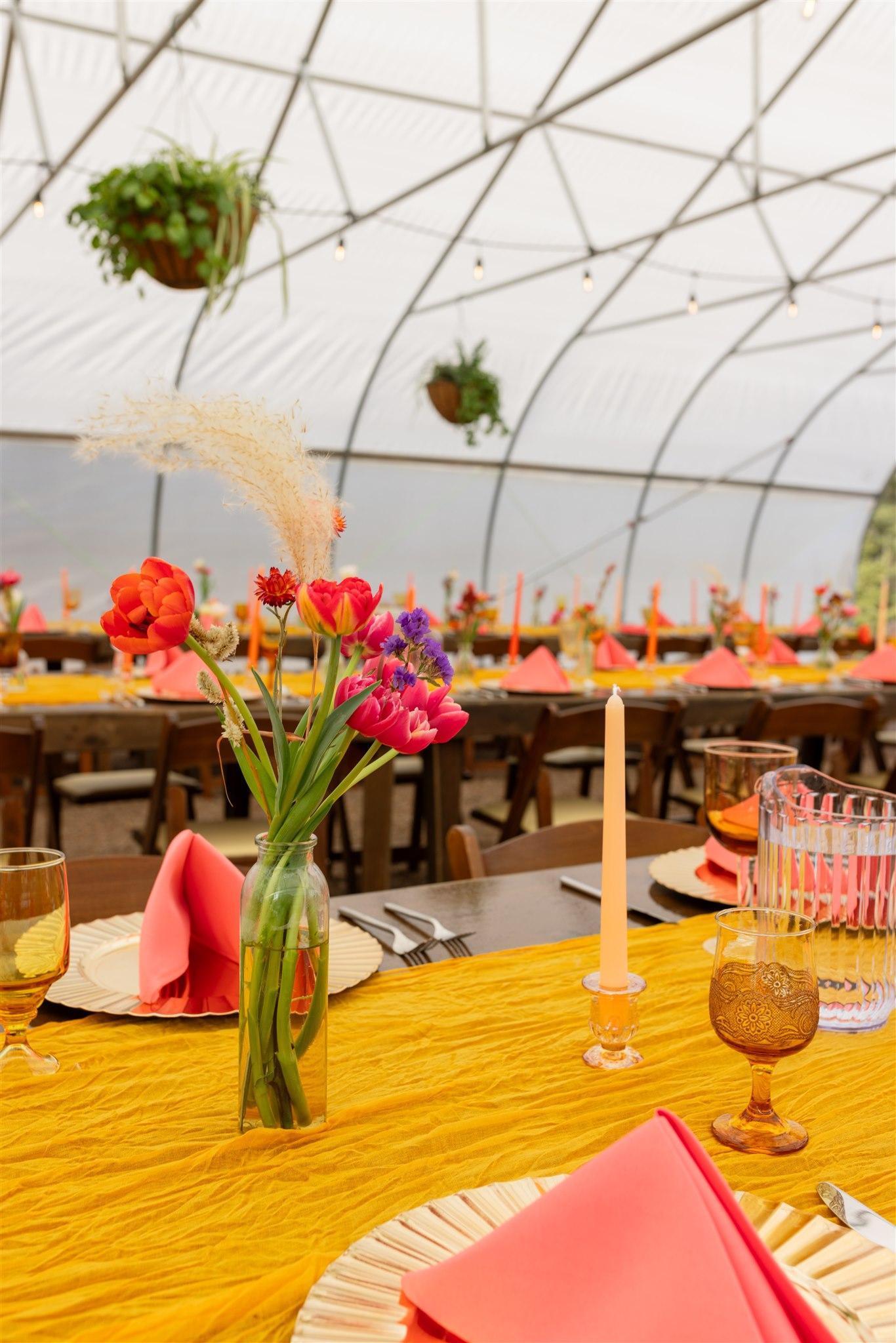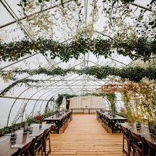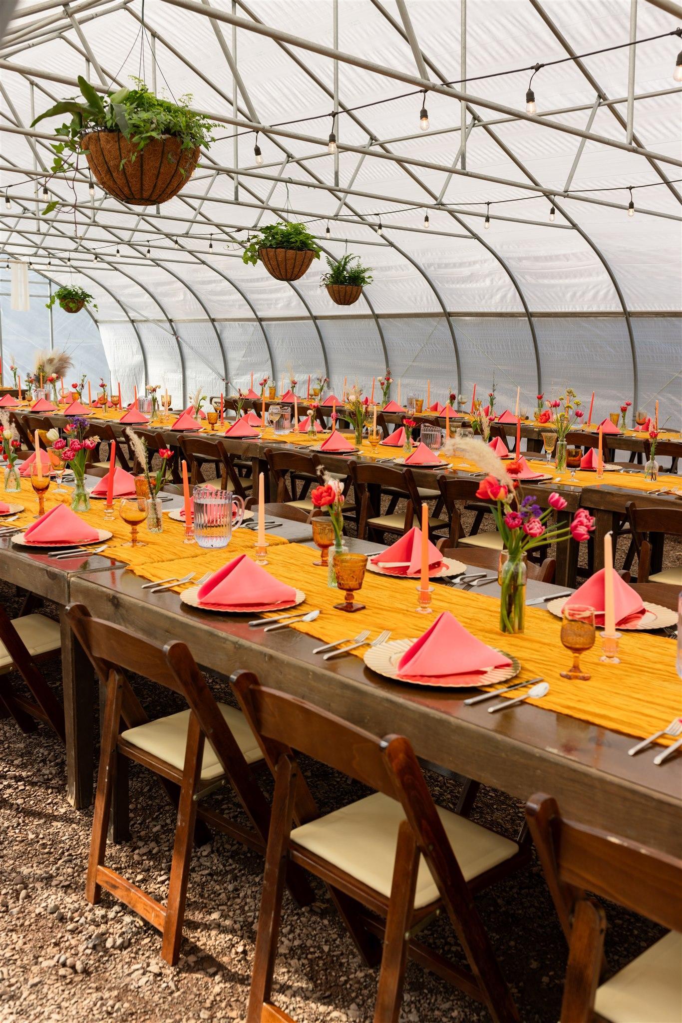 This space is the center of events here at Agate Acres! This 76'x27' hoophouse is our main reception space. With phenomenal lighting, all the greenery growing, wooden floor, and cozy aesthetic, this is the perfect place to have dinner, dance the night away, or use as a rain date ceremony space.