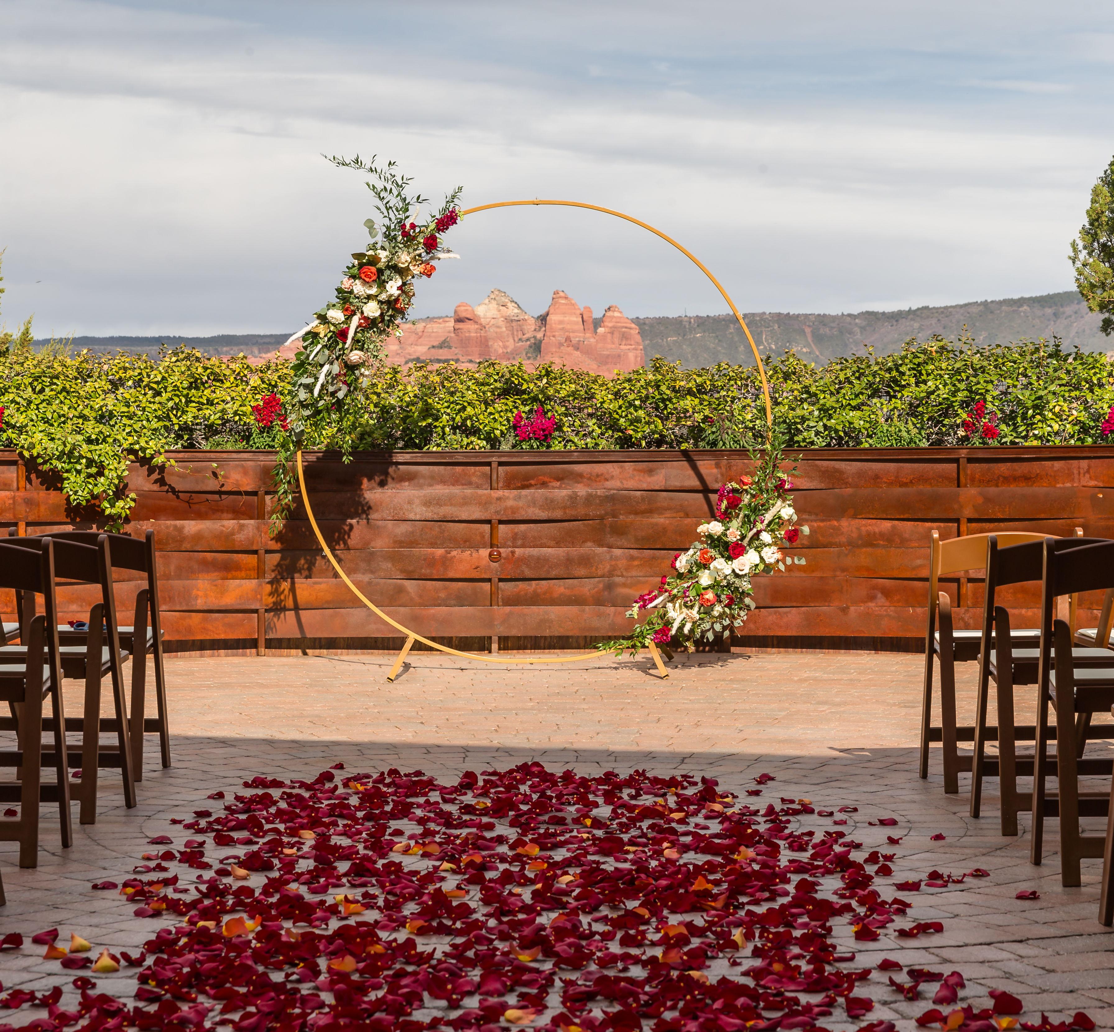 Our Celebration Terrace is just steps away from the Ceremony Terrace and offers you and your guests a shaded, covered area. The Celebration Terrace is enclosed on three sides leaving the North side open to viewing the majestic Red Rock formations of Sedona. Beautiful glass French doors, ceiling fans, and decorative lighting enhance the space. Many of our guests use this area for cocktails and appetizers. This area is also great for small ceremonies and celebrations.