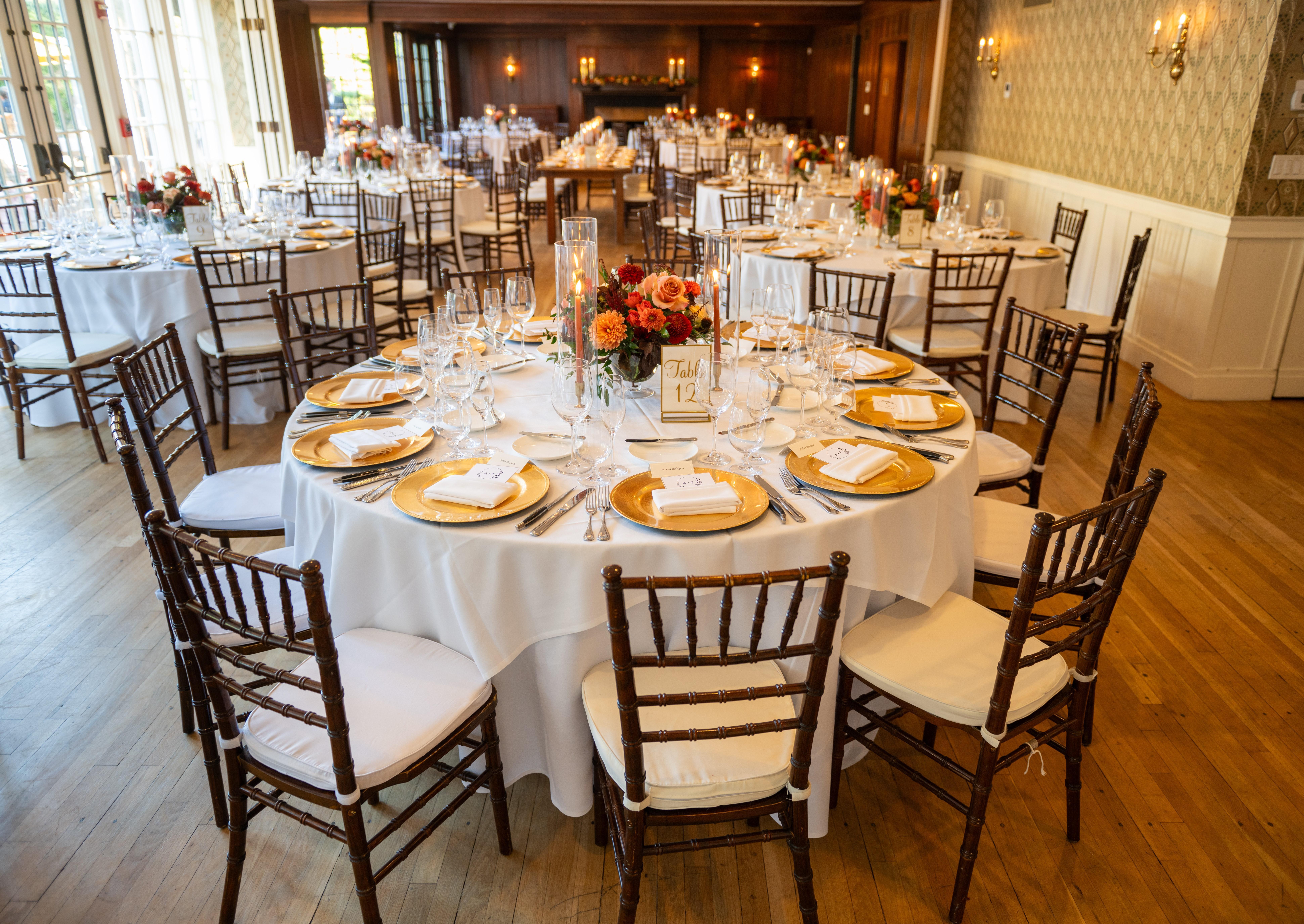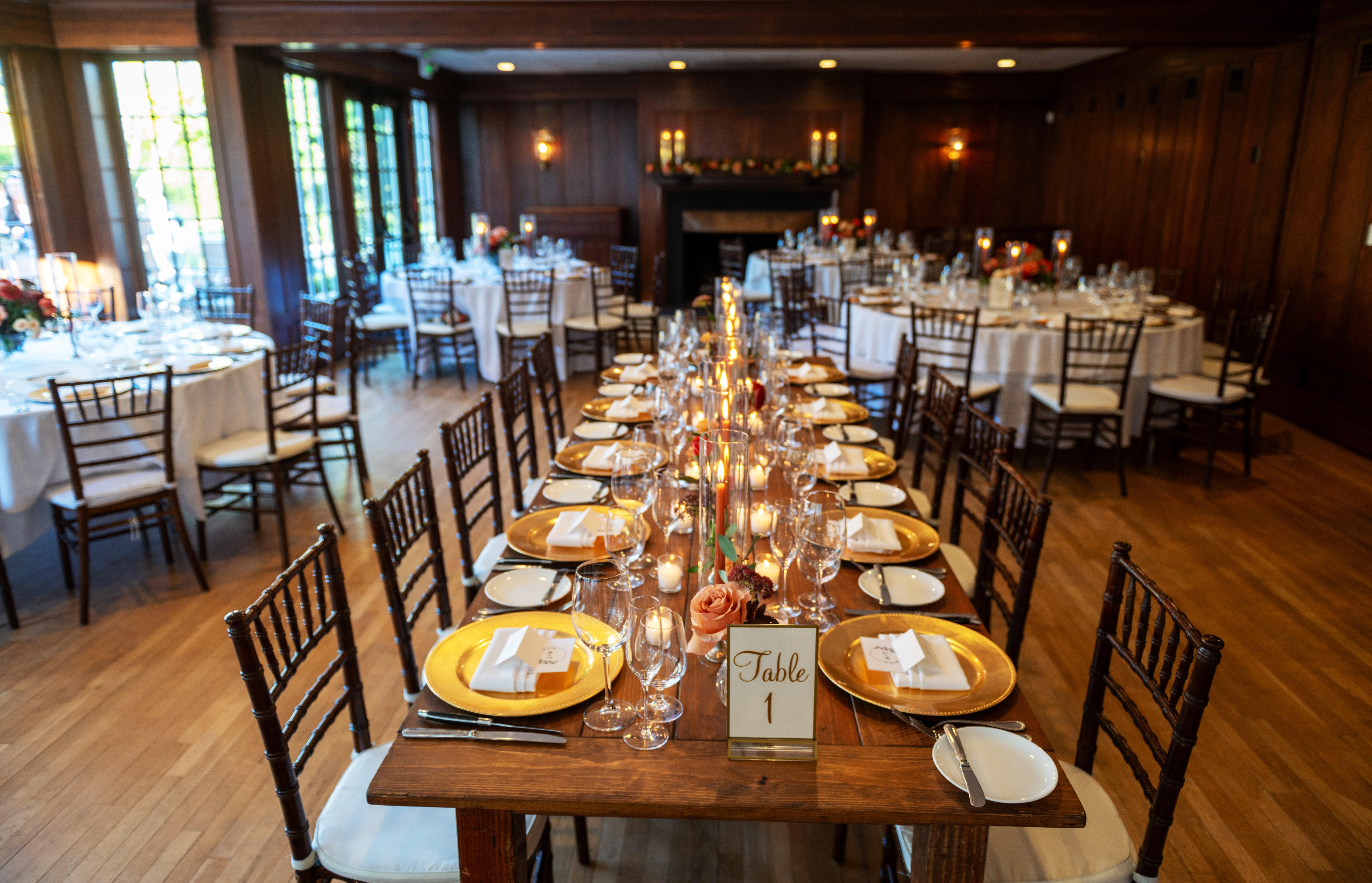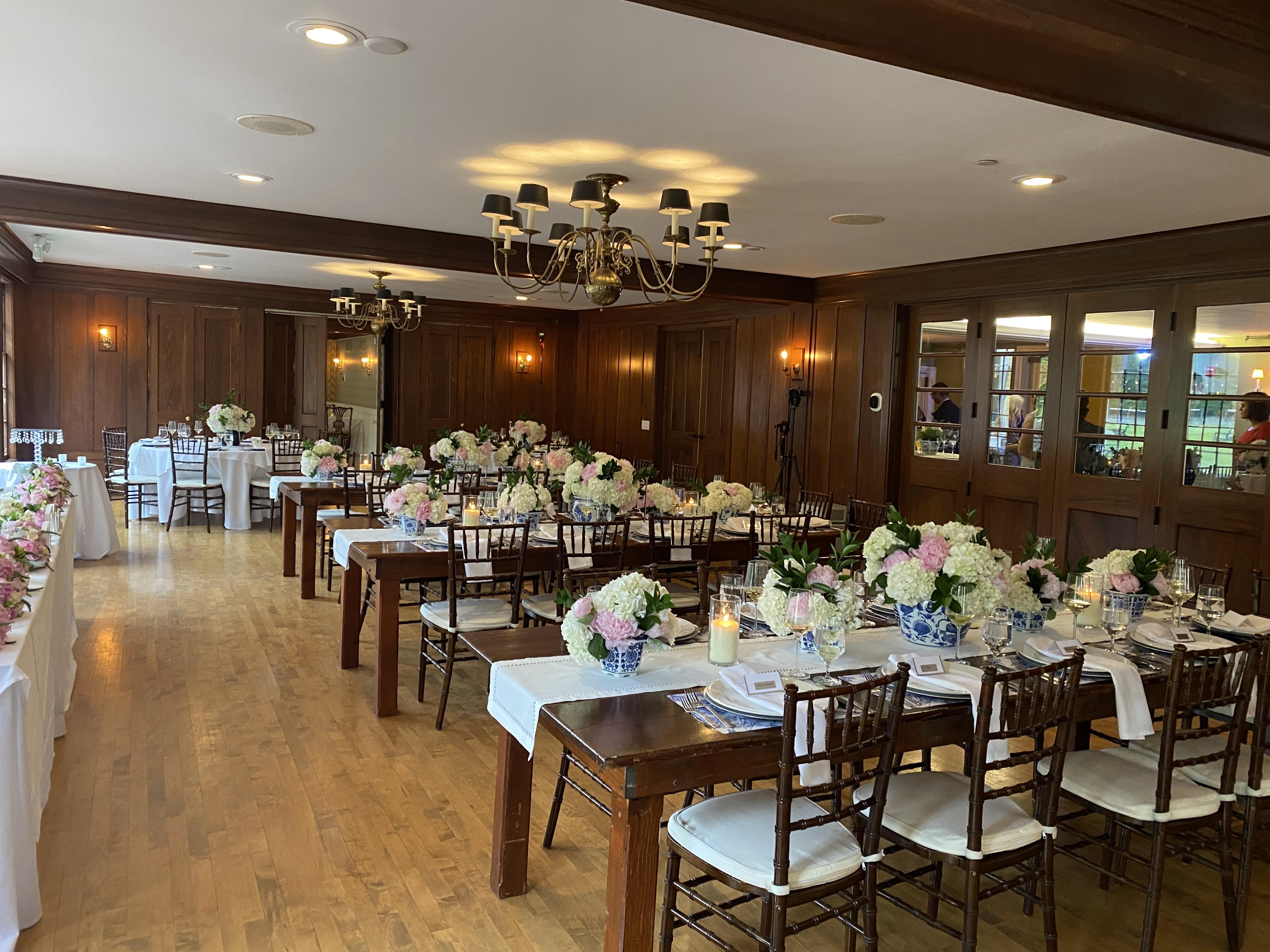 The combination of our Hunt Room and Garden Room offers a classic, elegant, and welcoming space that can accommodate larger wedding receptions and social gatherings. It offers a variety of layouts for dinner and dancing and is a key indoor space within the historic Clubhouse. This room's versatility allows for a seamless transition from a formal dinner to a lively dance floor, all within a beautiful setting.