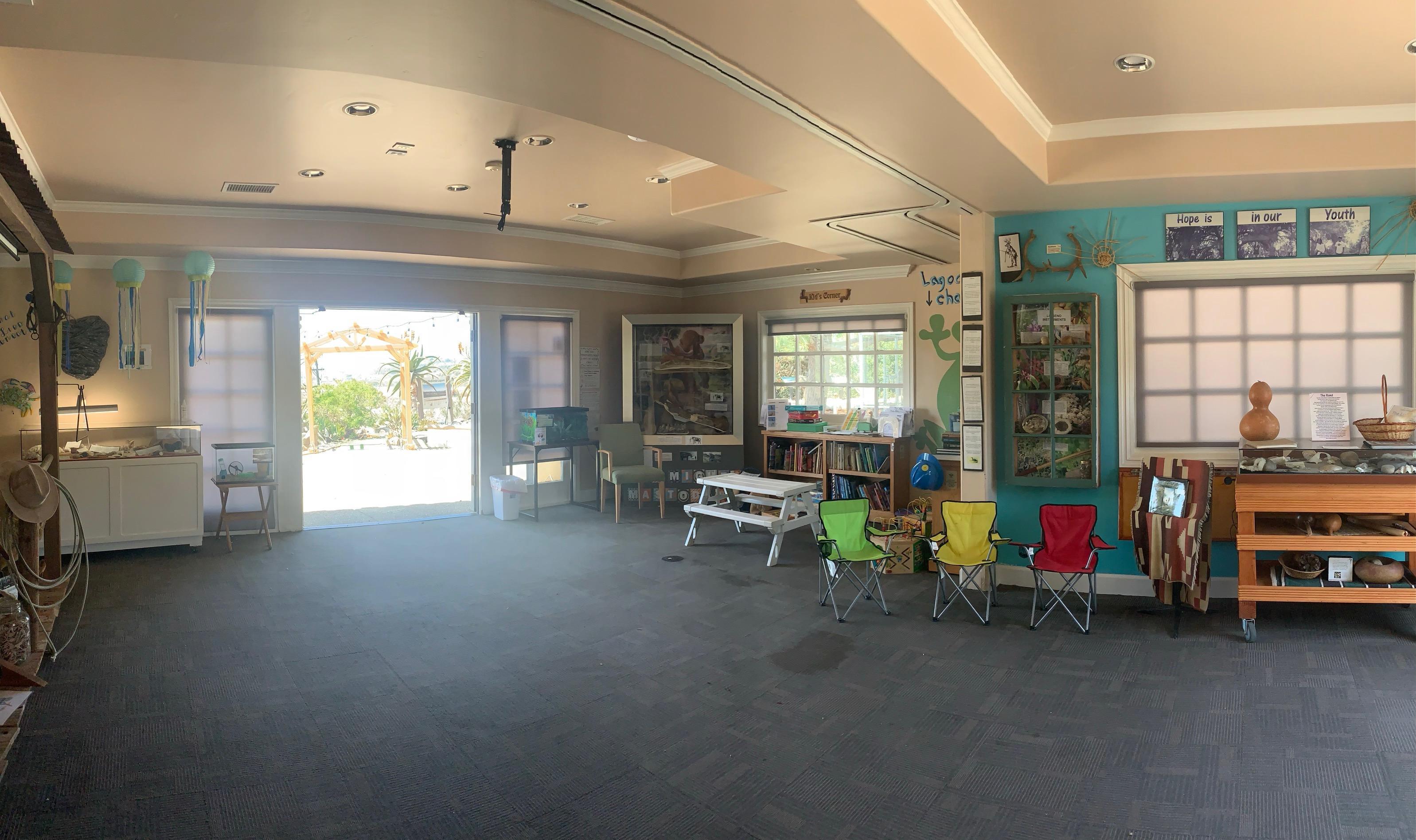 The Great Room is a 338 square foot open space (dimensions: 22.5 feet by 15 feet). The room features three sets of glass double doors, which open to the back patio, front sidewalk entrance and main building. The Great Room is decorated in white and beige and is carpeted. This room has been used for business meetings, birthday parties, lectures and educational opportunities. Lagoon Fact! Deer grass is one of the materials used by the Luiseño Indians to weave baskets.