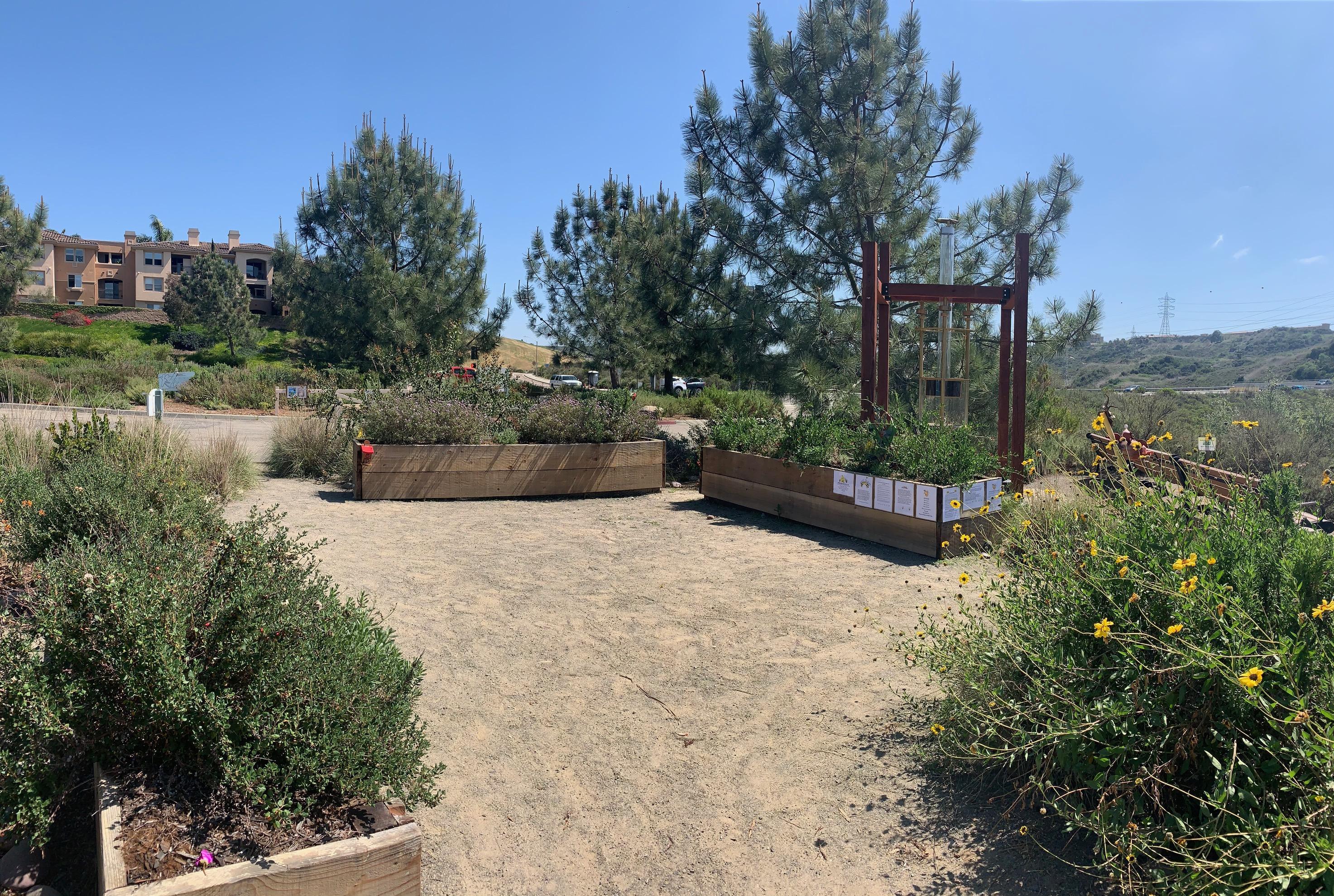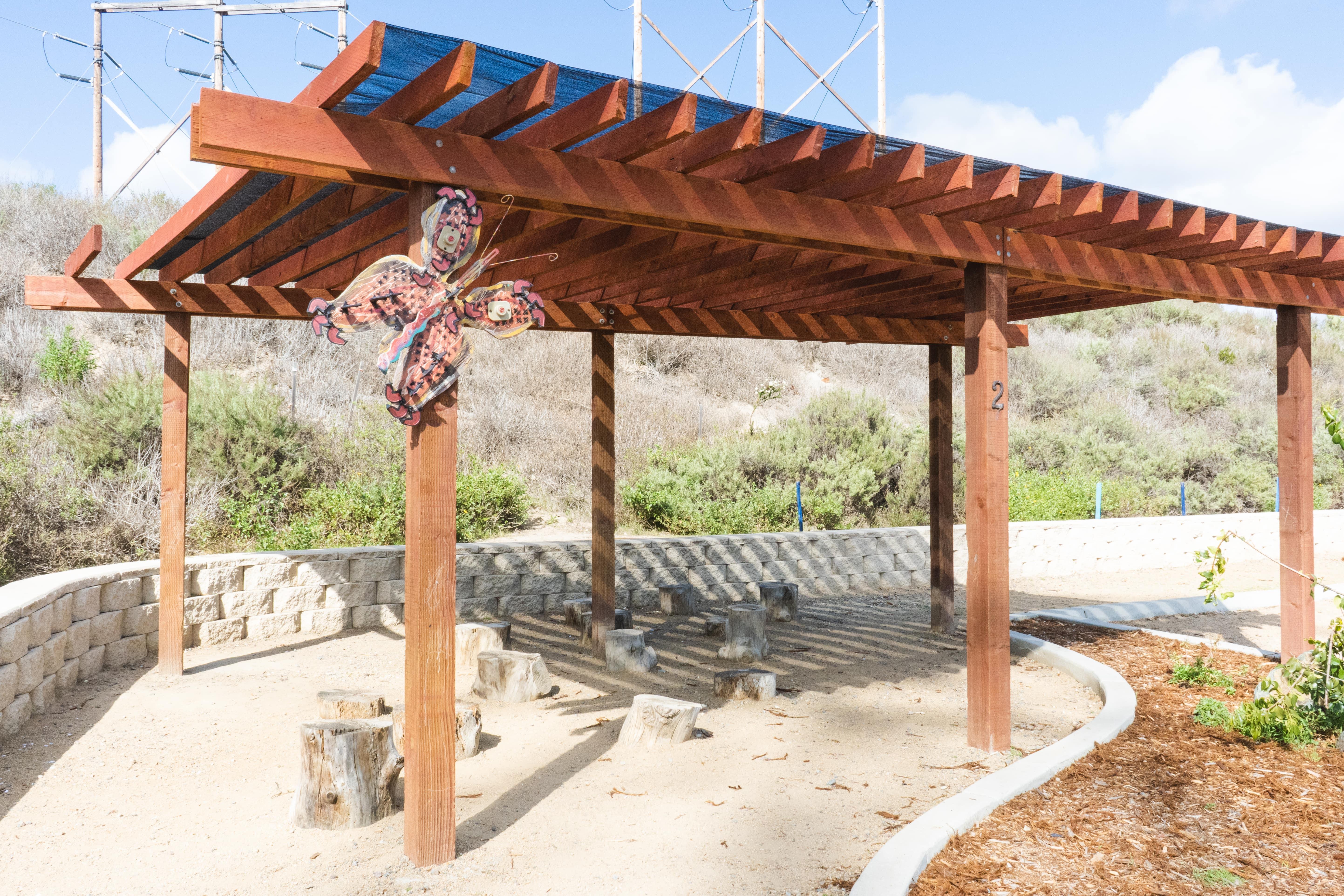The outdoor educational spaces feature a variety of natural seating areas such as stones, wood benches and tree stumps. Each node is shaded and perfect for a small gathering of up to 12 people.
