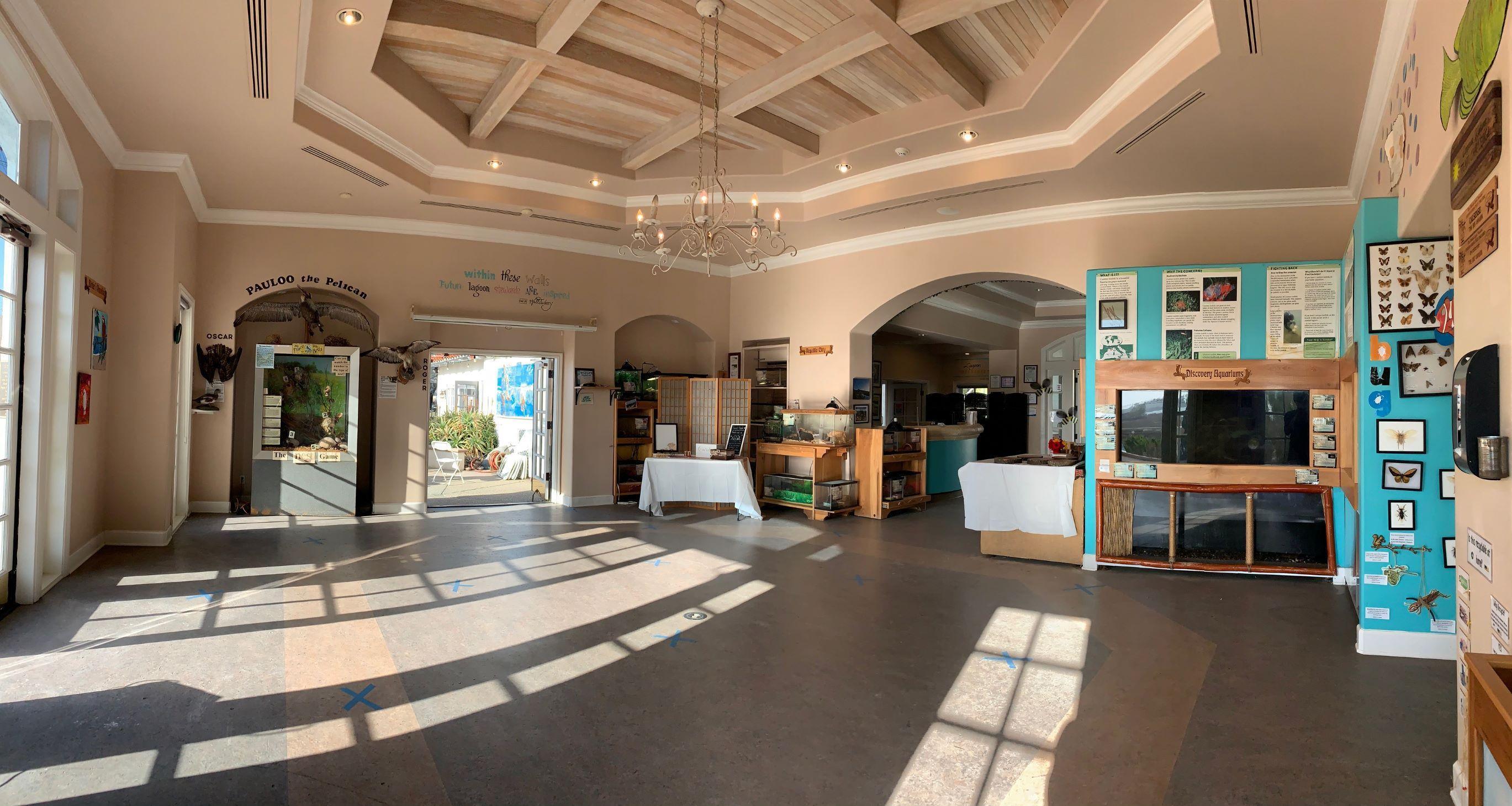 An outdoor space on the southernmost point of the building featuring a line of benches overlooking the lagoon and cleared space. This outdoor area is great for a cocktail before the big event, or a small gathering of up to 20 people. This area features a new exhibit – an observation “Bee-Aquarium”.
