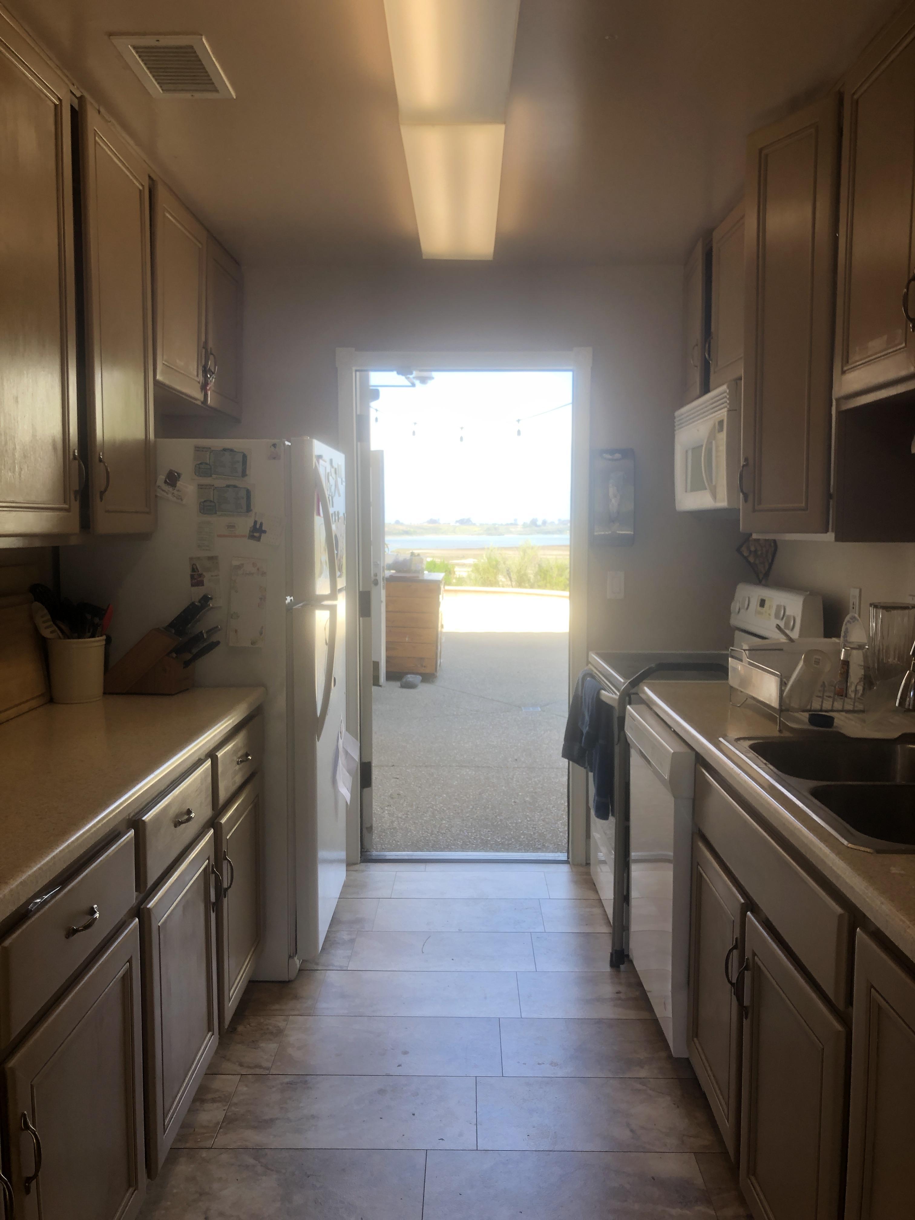 Appliances available in the kitchen include a glass-top four-burner stove, oven, microwave, dish washer, refrigerator/freezer, and stainless-steel double sink with a U-shaped faucet.