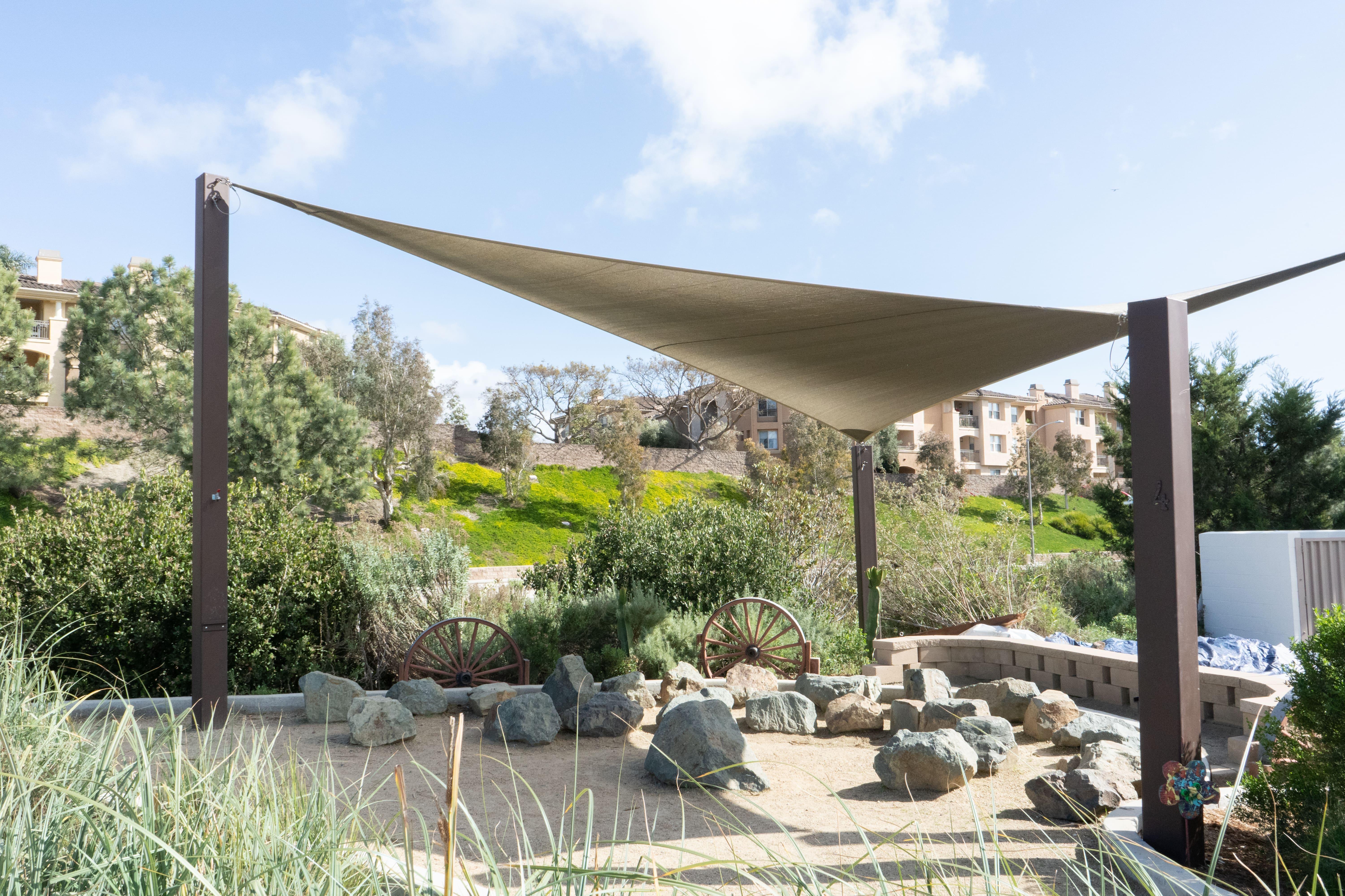 Special Features: Shazeebo brand shade sails cover the entirety of this space with market lights strung across and views of the lagoon in the distance.