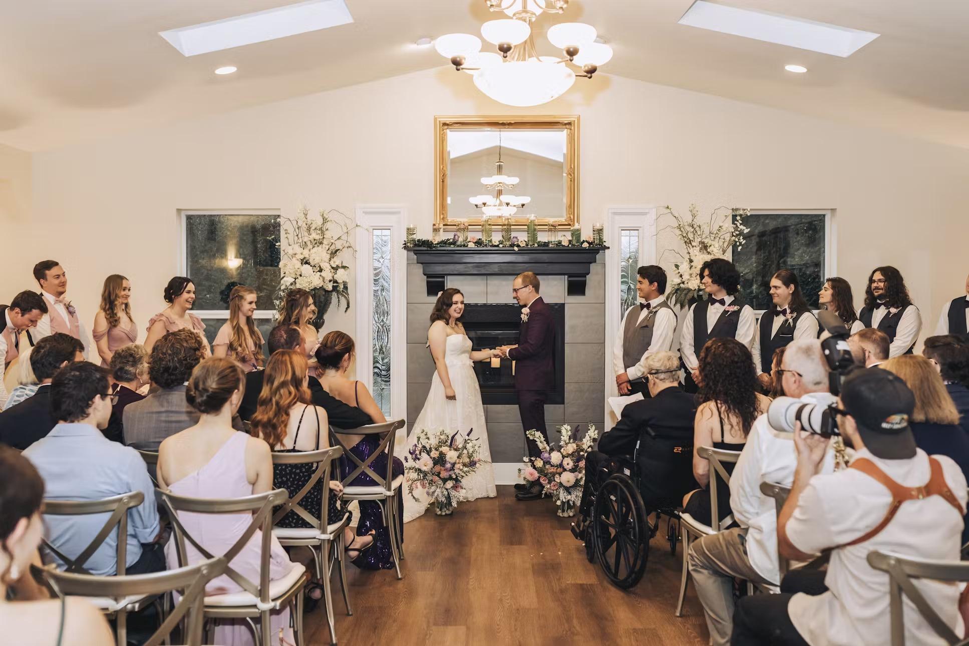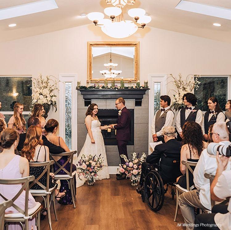 Indoor wedding ceremonies at the Ainsworth House & Gardens are performed in The Fireside Room. After the ceremony, the full group picture can be taken outside (weather permitting), and cocktails and appetizers can then be served in The Garden Room. During this time, the wedding party can retreat for private or group photos near The House or in The Grove while the venue and catering staff will reset The Conservatory and Fireside Rooms for dinner.