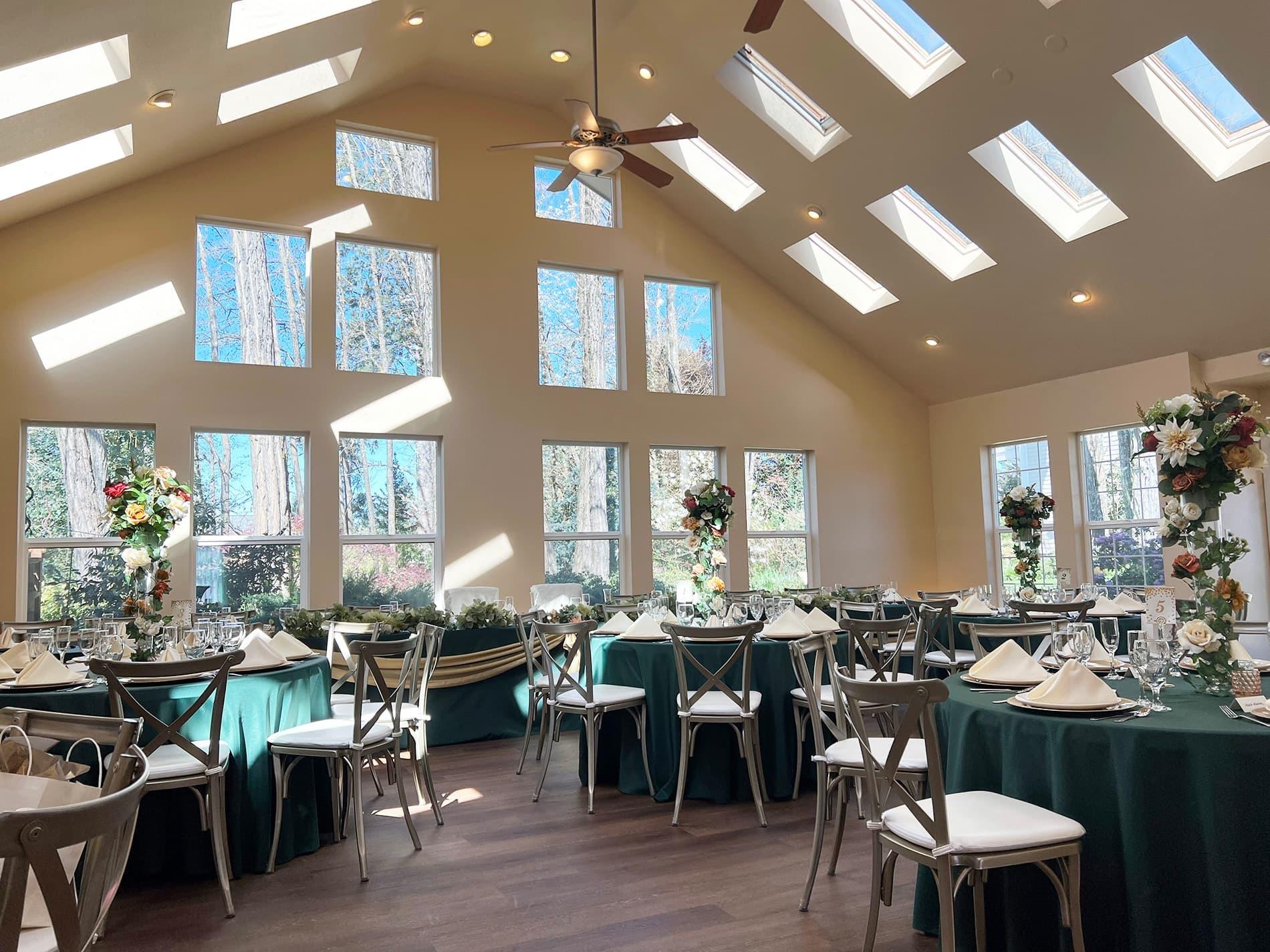 Full of natural light and always hospitable, regardless of the weather, our nearly 3,000-square-foot Reception Facility is used by all our events for dinner and dancing. With a maximum capacity of 125, Ainsworth House & Gardens includes a great selection of in-house linens, napkins, and table centerpieces as part of your booking. We will do all the setup and cleaning, as well as coordinate with you and your vendors on all the special décor items you might wish to incorporate.