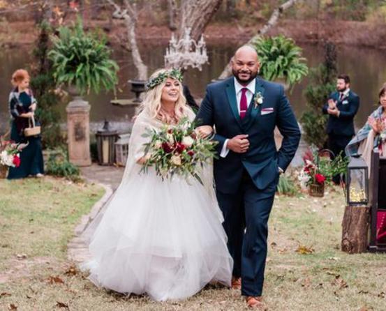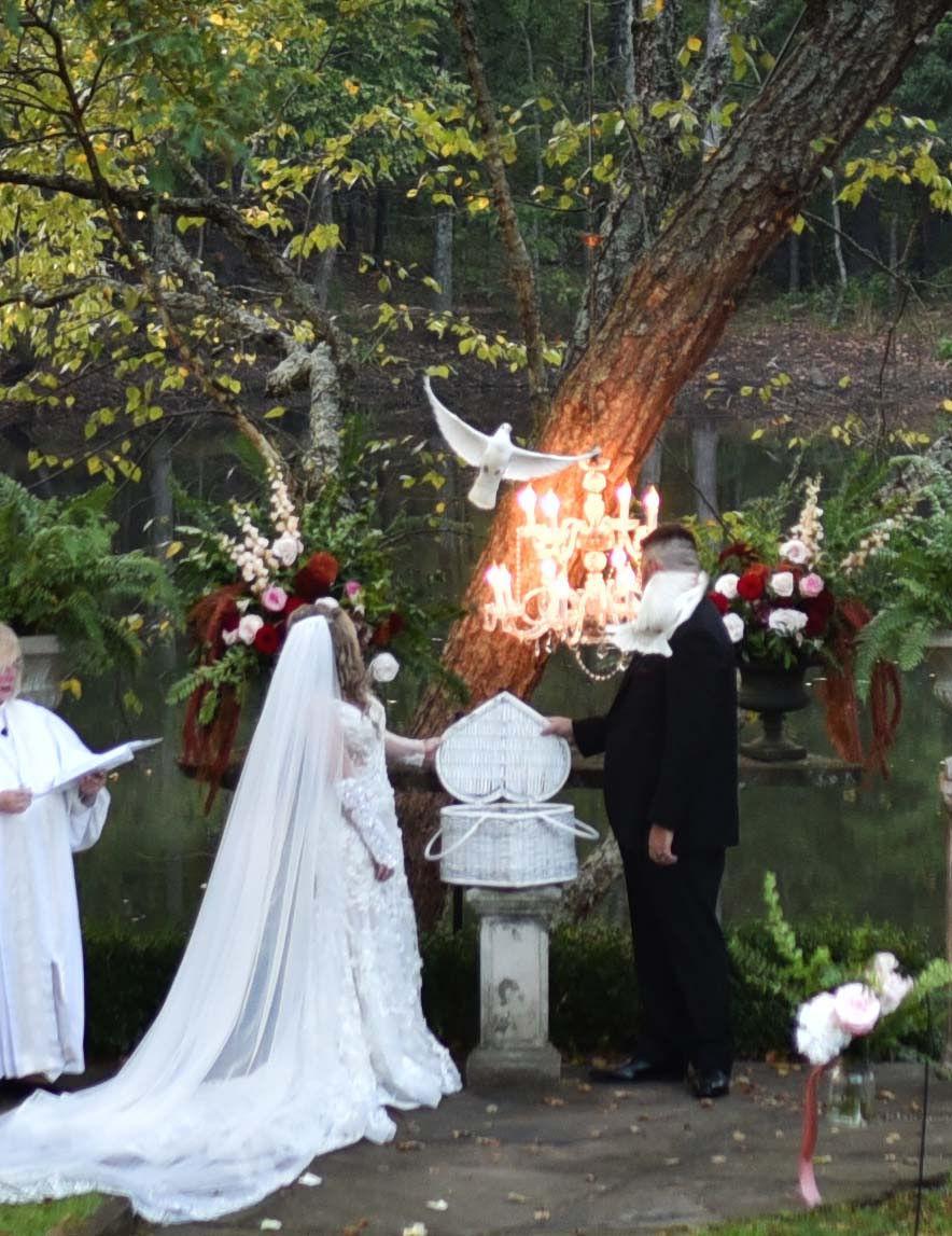 The romantic stone altar by the lake includes a White Dove Release ceremony. Unique to our Southern setting is our own horse and wedding carriage to "present" the bride as guests watch from across the lake. If the groom so desires, he may arrive to the altar by canoe as guests watch!! The covered reception area overlooks the lake. All this and more is included with the venue. Destination weddings are our specialty as we are all inclusive, and can plan from afar for a perfect celebration. The Moon Dock is covered and full of twinkle lights overlooking the lake. Tables and chairs are included with the venue for your guests. Our heated and cooled Magnolia Venue and Veranda for receptions has linens are included as well. Our Grand Swing is for a unique bridal portrait or engagement portrait of the couple,and is complimentary with booking.