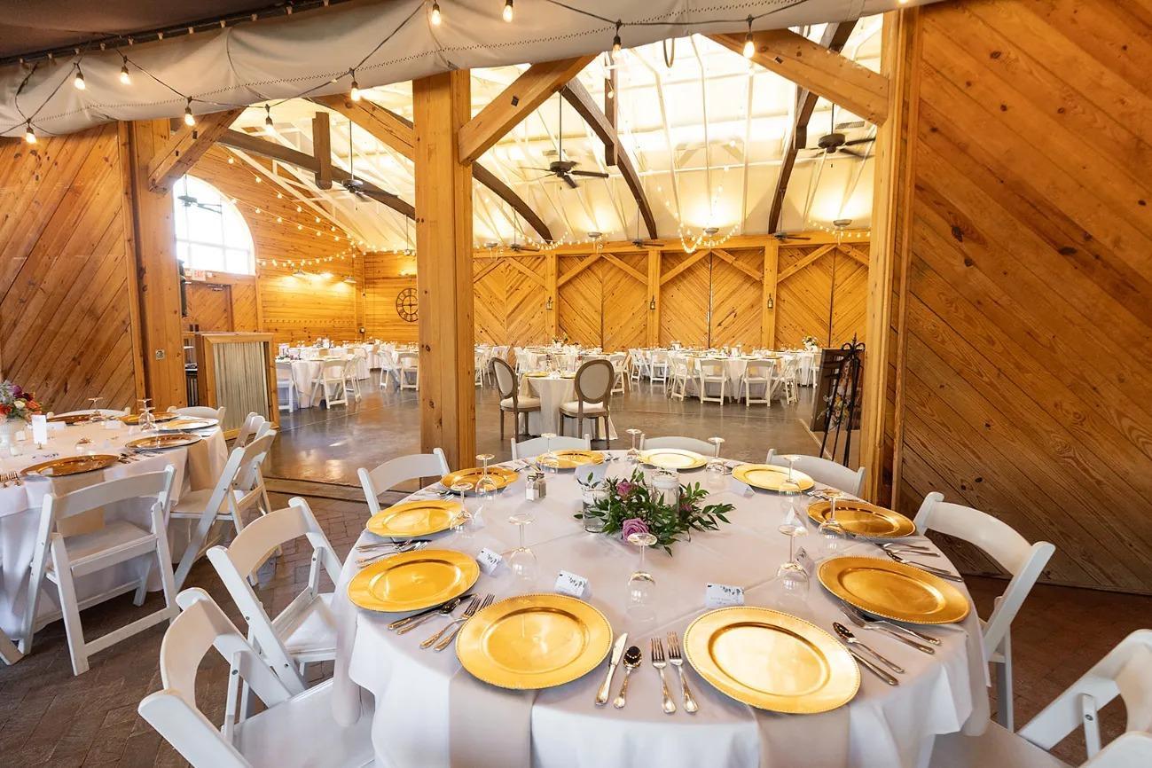 Our timber-framed barn is where rustic warmth meets elegant sophistication. Dine beneath twinkling string lights and exposed wooden beams that create an enchanting atmosphere for your special day. Our venue features gorgeous herringbone wood walls, polished concrete floors ideal for dancing, and ample space for your guests to celebrate.