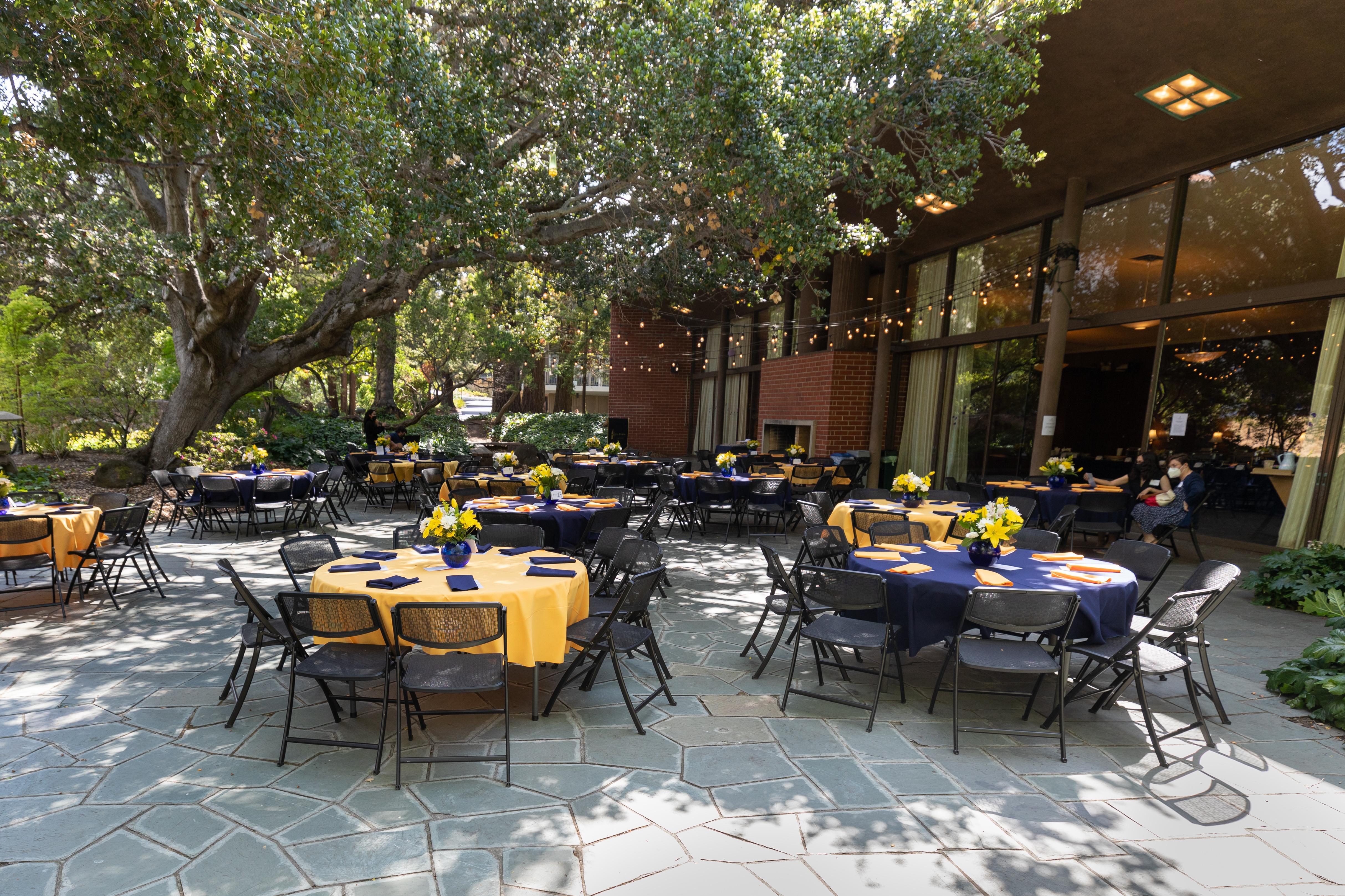 Our venue is centered in the heart of the UC Berkeley Campus. Built in the 1950's, Alumni House has a cozy and warm atmosphere, ready to welcome all alumns, friends, and newcomers to campus. The event space consists of both indoor and an outdoor areas. The Toll Room is a large open space preserved in its original mid century modern aesthetic with a full wall of sliding glass doors. It opens on to the patio surrounded by mature trees that create a charming canopy decorated with string lights. Surrounded by towering red woods, and a trickling creek, you can have the best of both worlds: an outdoor space with the convenience of being close to the city. Our wedding package includes access to entire event space including an indoor event space, patio, and kitchen.