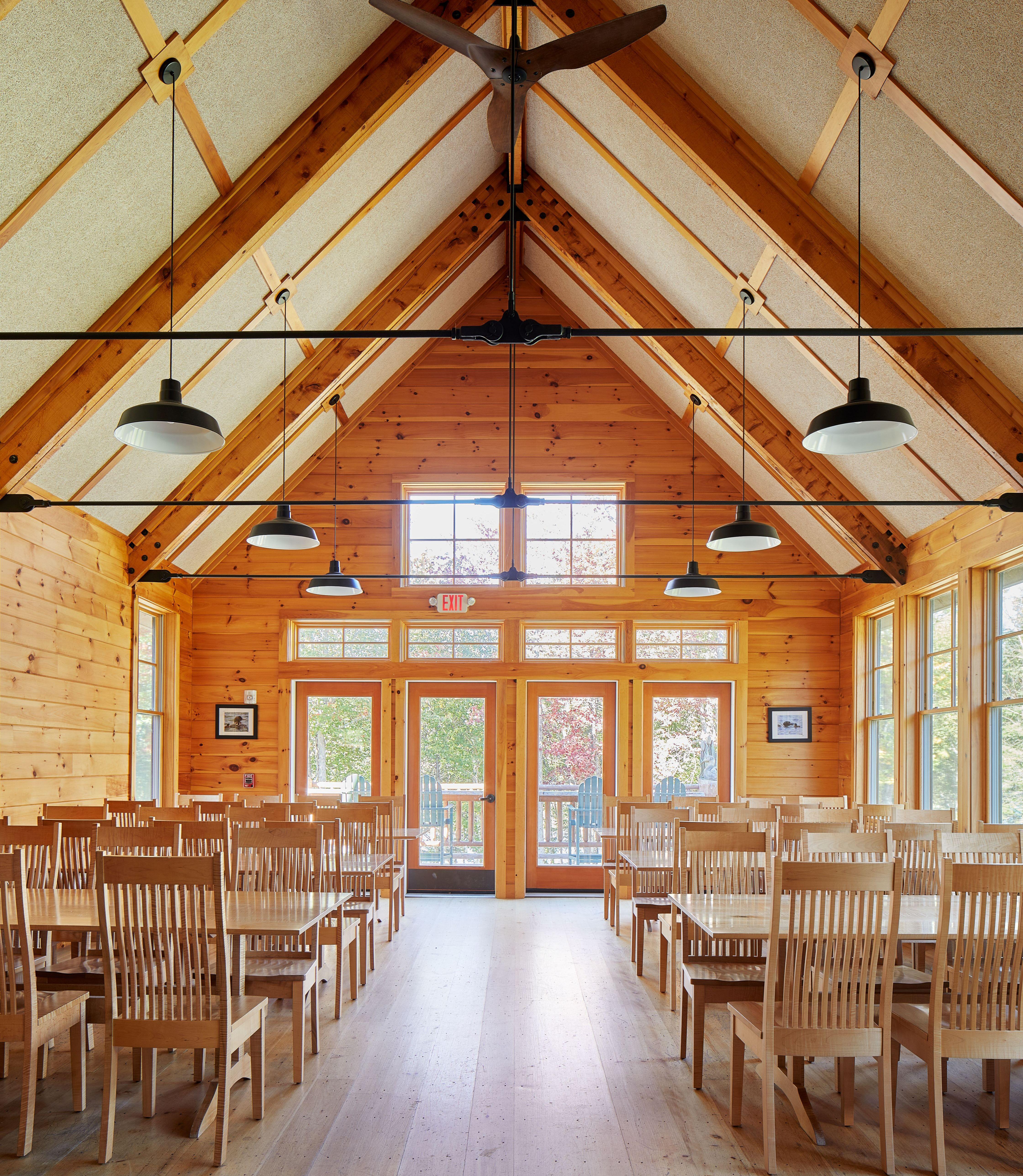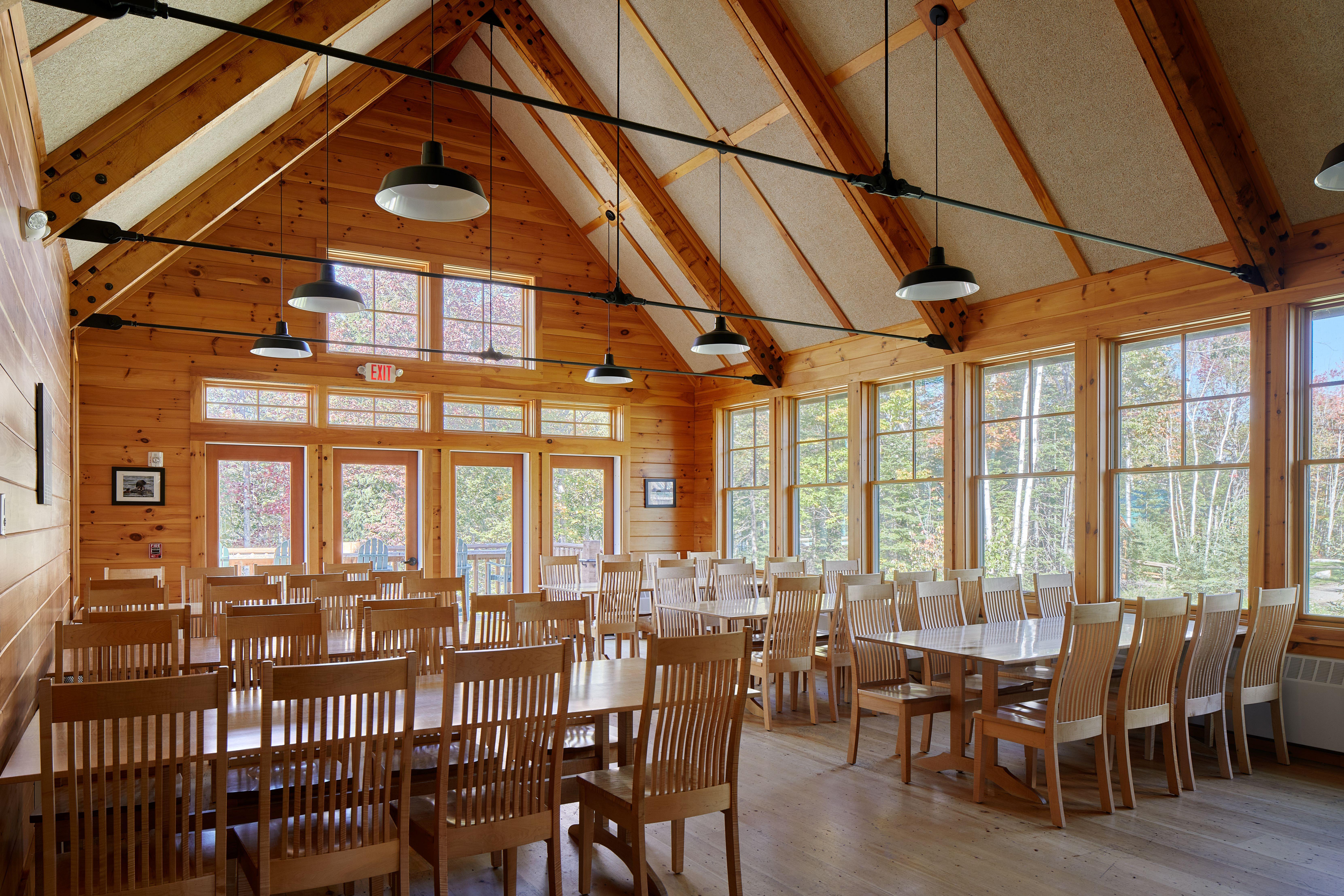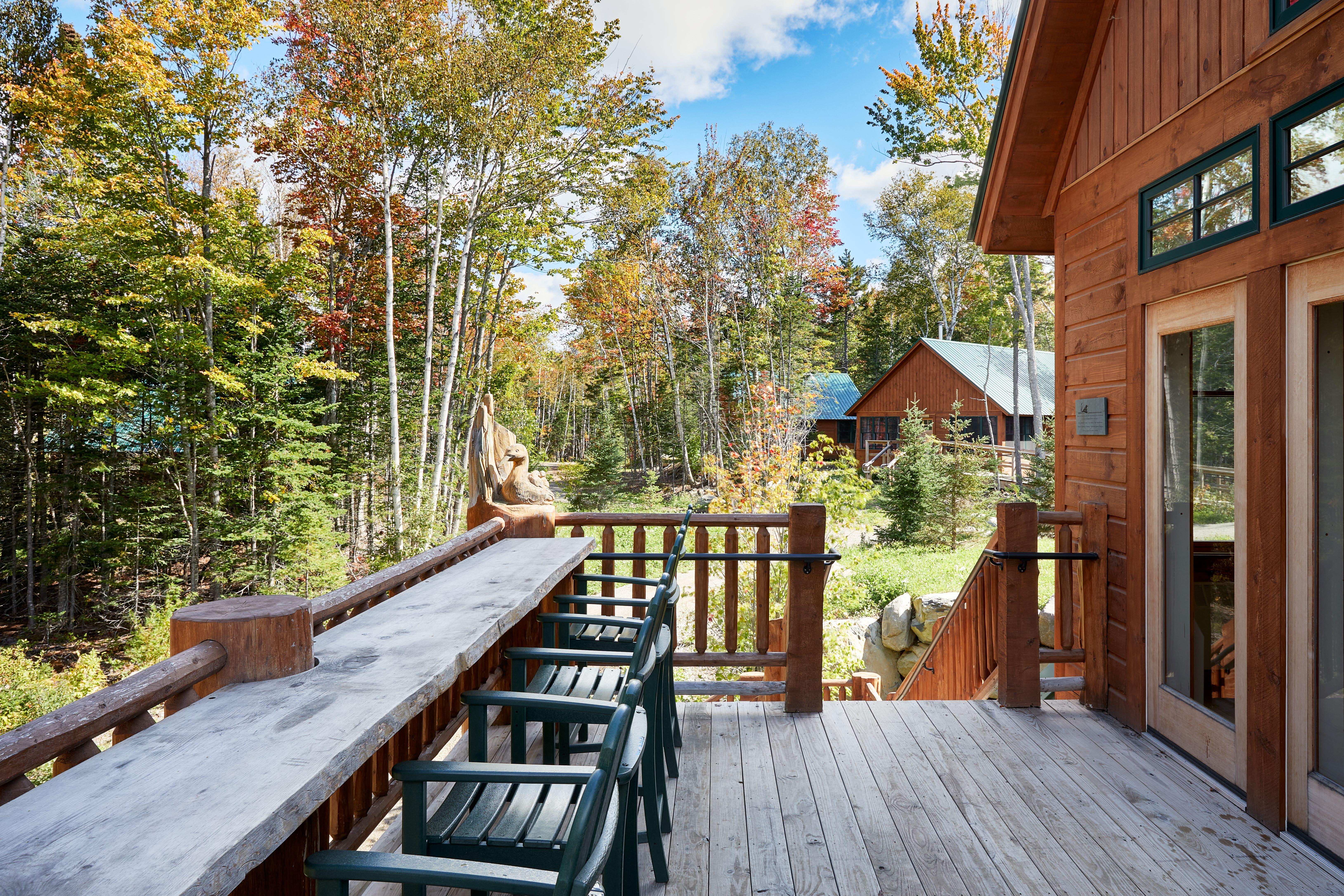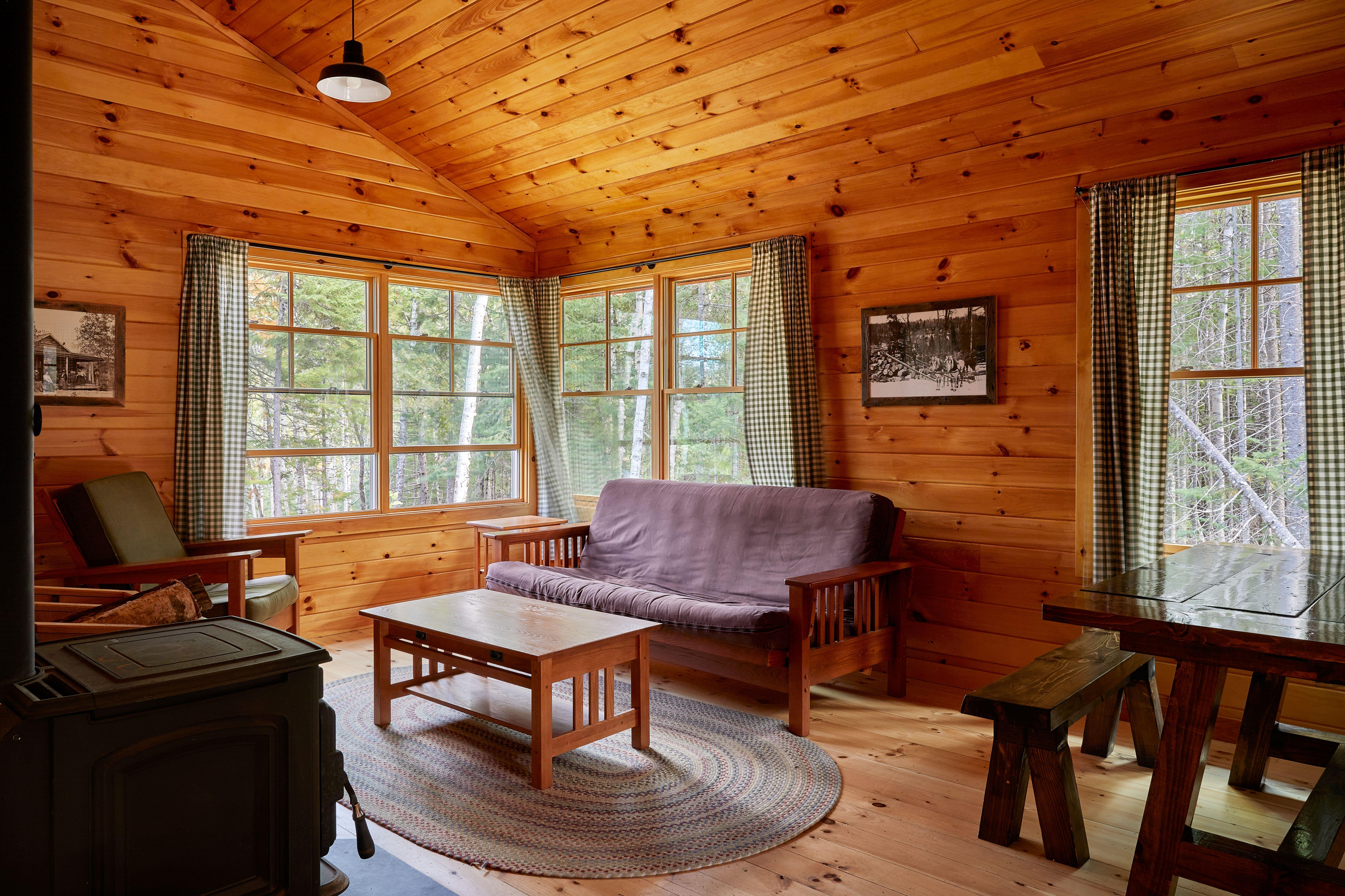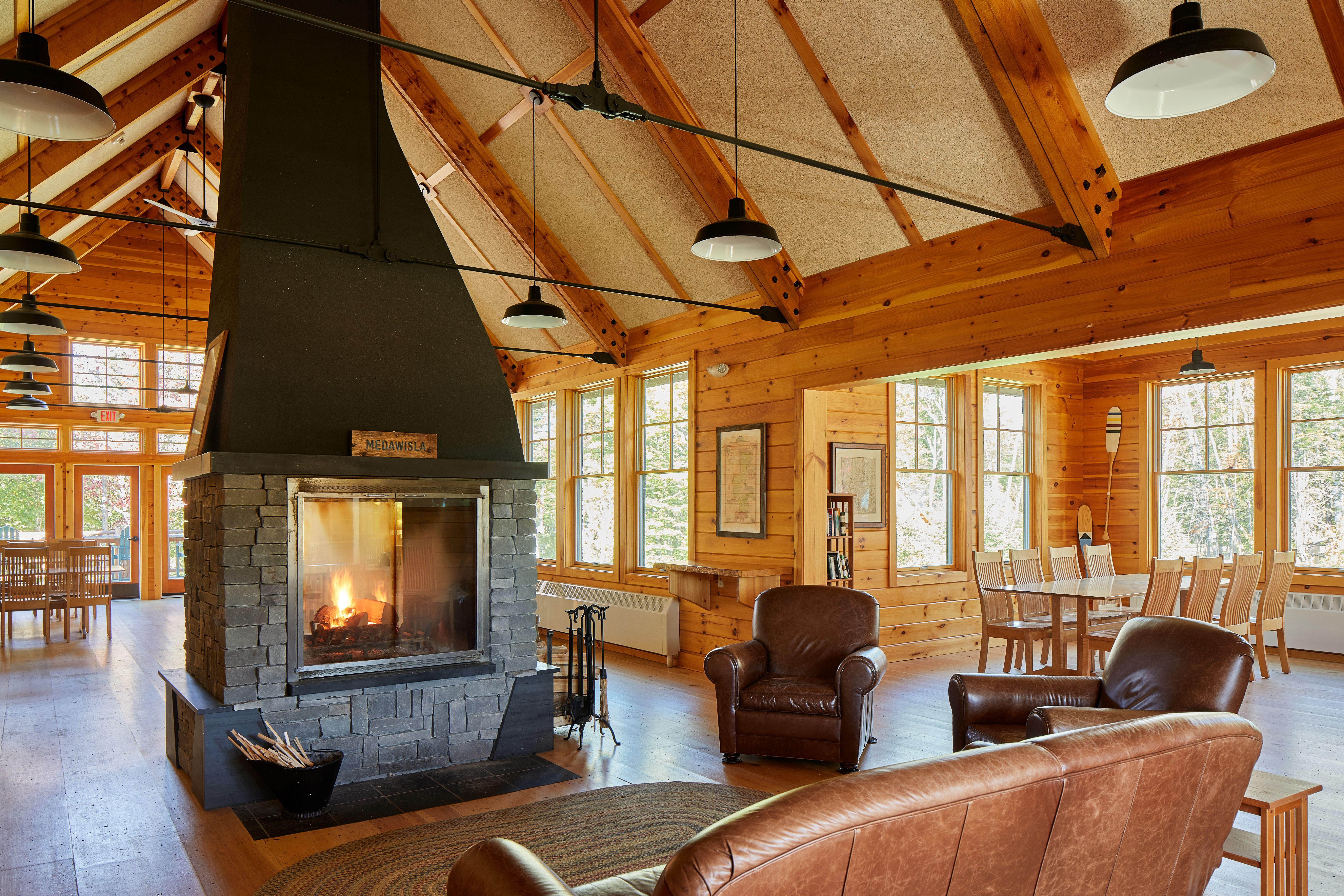 This space features a bright, sunlit dining room with a high timber-framed ceiling and a central wood-stove perfect for cozy gatherings. The dining room opens onto a deck with views of Second Roach Pond - perfect for cocktail our. Guests can also enjoy a co-ed wood-fired sauna, wheelchair-accessible bathrooms, and a separate downstairs meeting space ideal for small-group slideshows or pre-wedding activities. Medawisla’s Main Lodge offers a perfect blend of rustic charm and modern amenities.