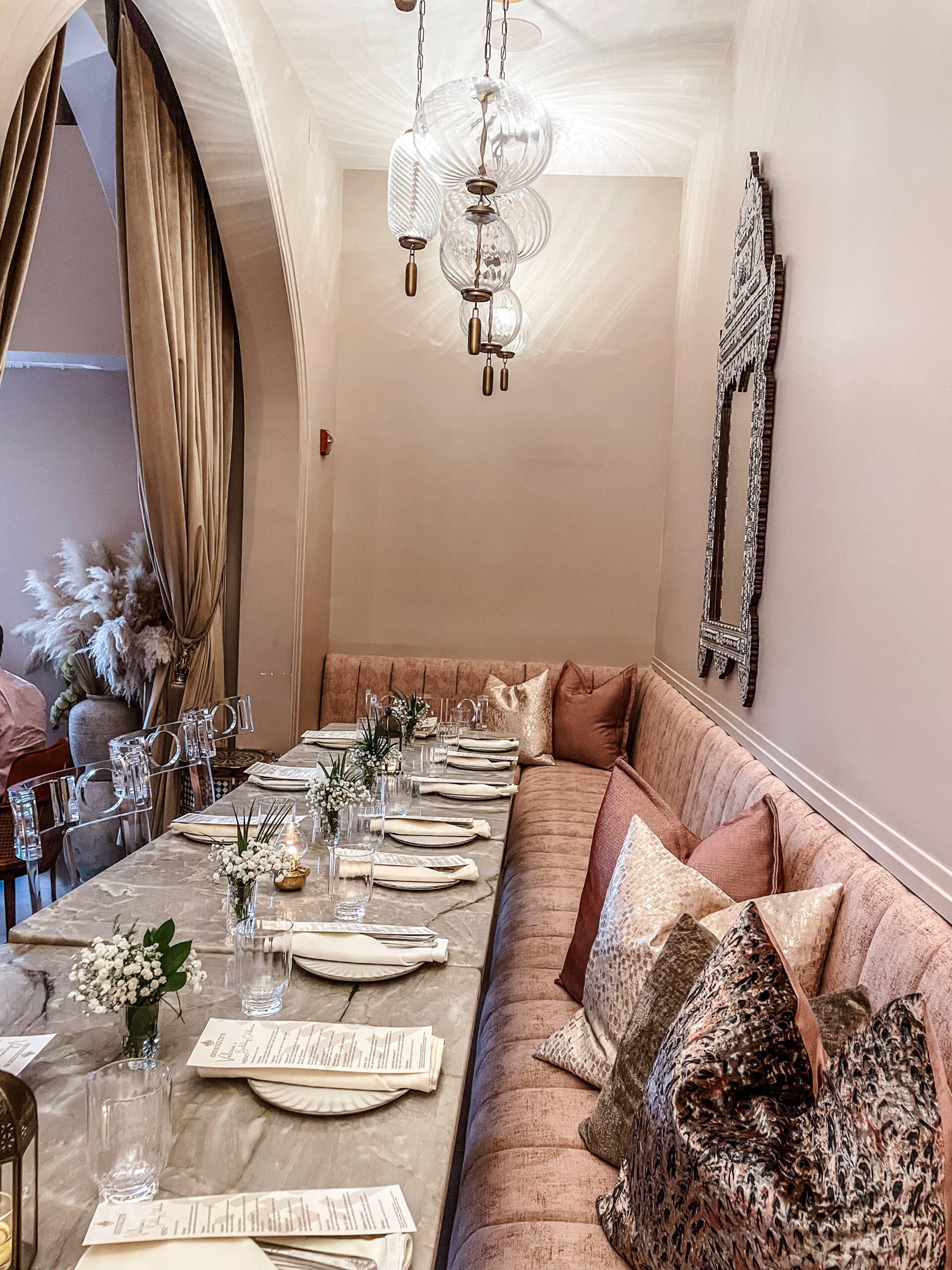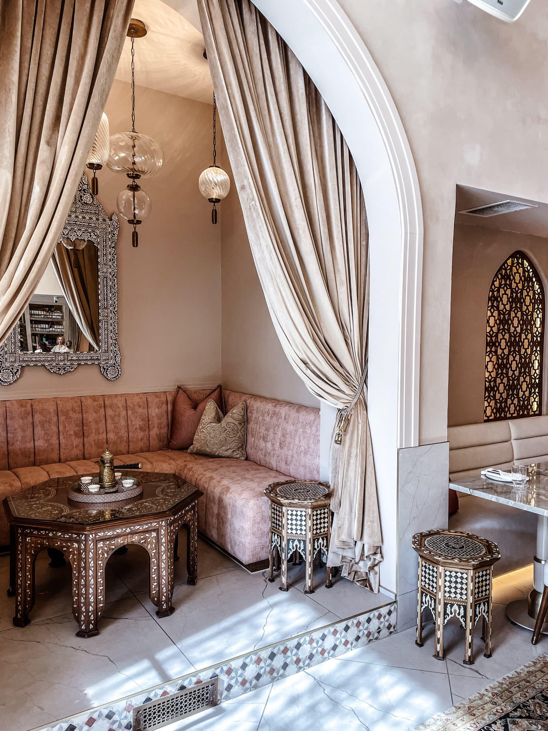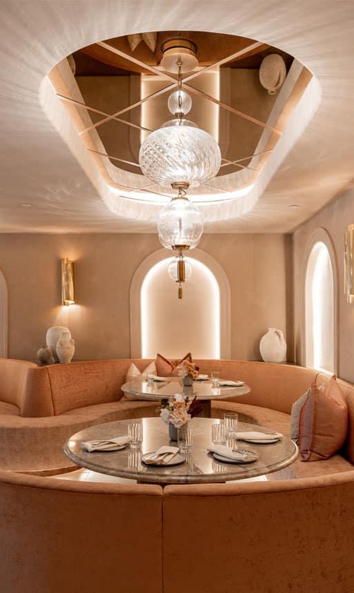 Embodying the essence of cohesion, this exclusive setting signifies the room located in a traditional Levantine home where family members and friends gather for feasts. A focal point, surrounded by the Damascene Dining Room. The Liwan is flanked by rich champagne velvet drapery, layered with ornate mosaic tiles, mother-of-pearl inlay vintage mirrors, dancing lights, and soft plush couches to evoke an experience all its own.