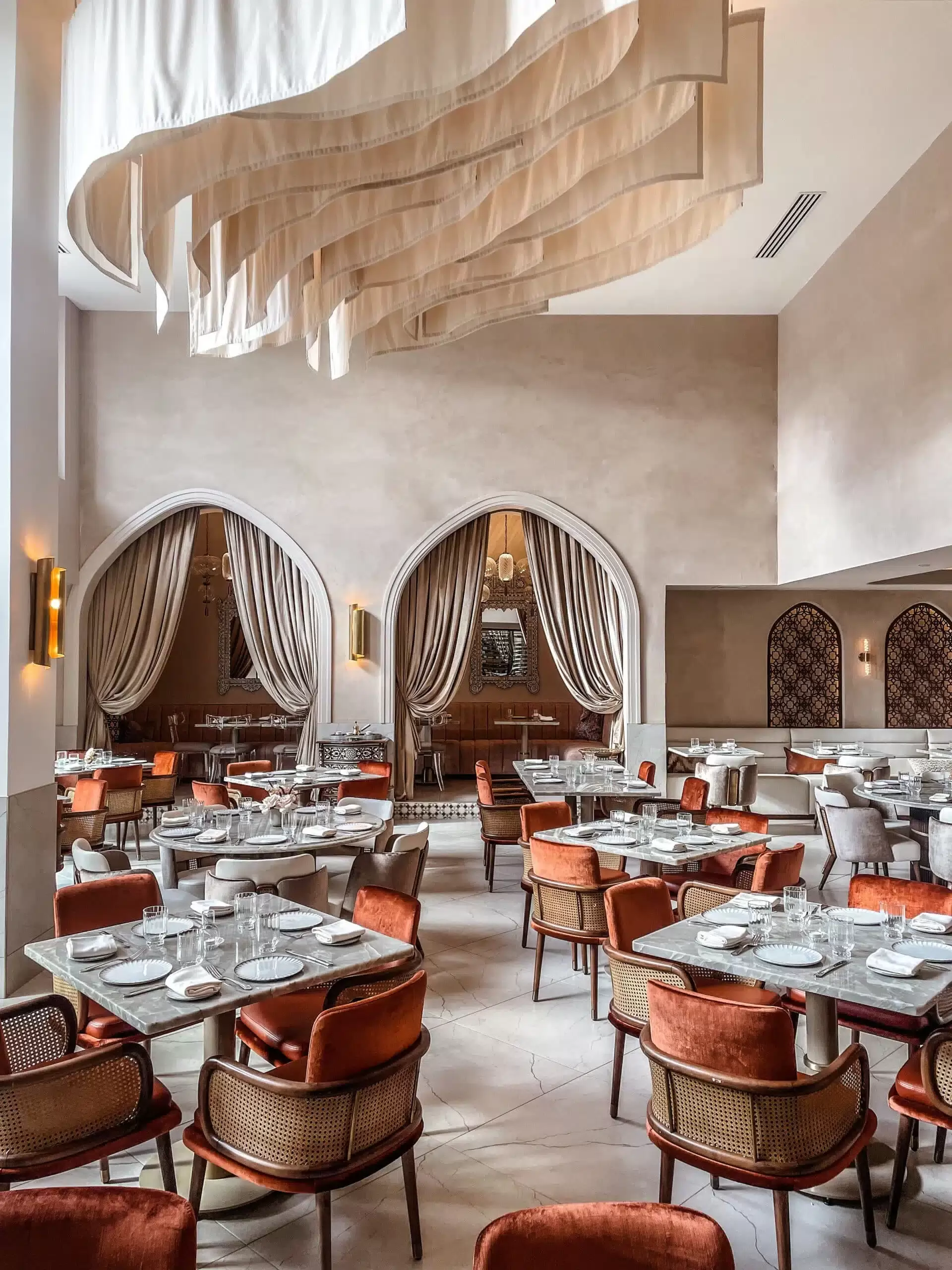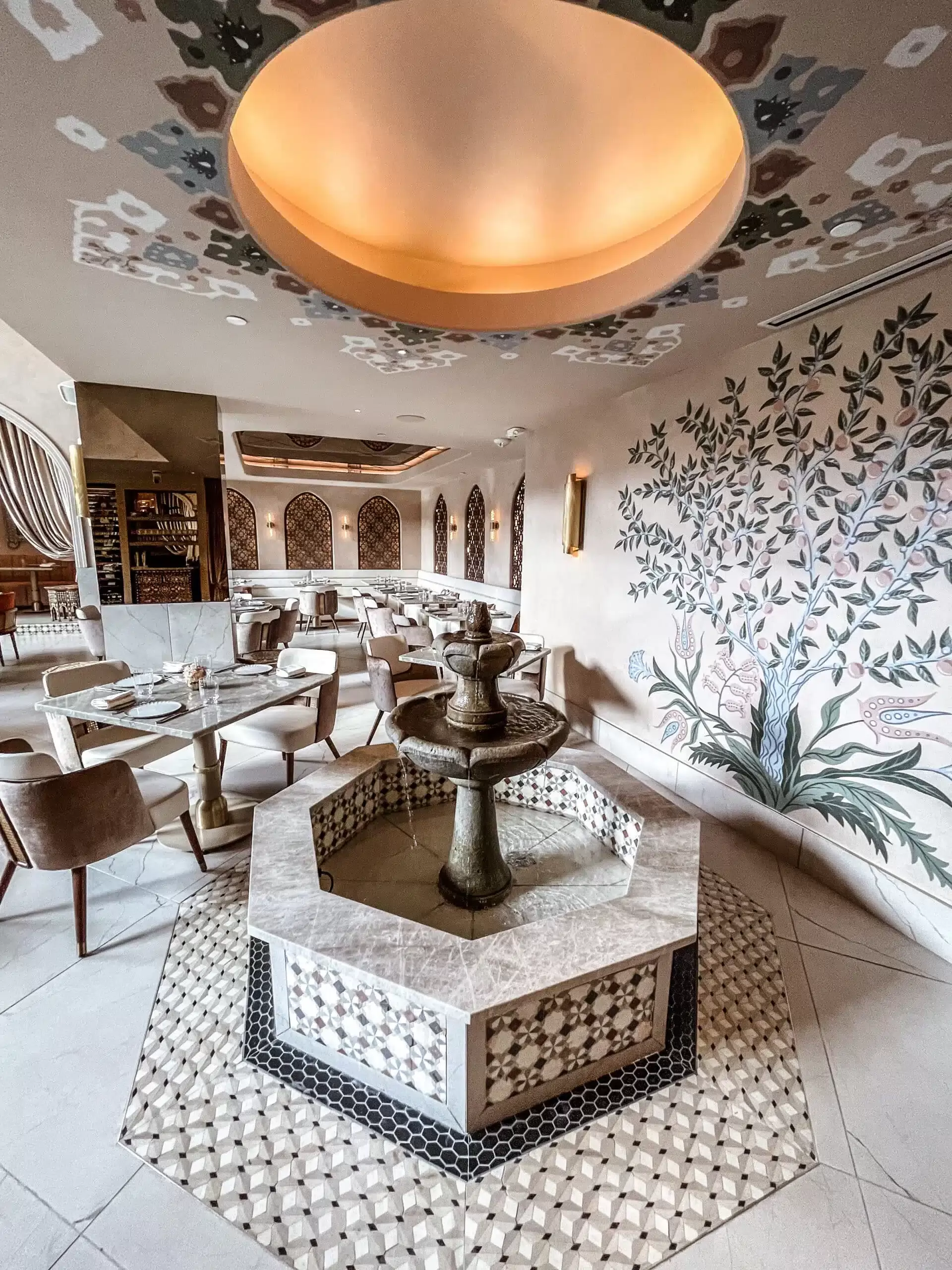 An elegant reflection of the Levant, the Damascene Dining Room embodies timeless Syrian design in modern opulence. Once inside rich and beautiful interiors welcome guests featuring flooring paved with marble, a handsome fountain in the entry embellished with bold oriental tiles, and dramatic accents cascading from the ceiling and each corner of the room.