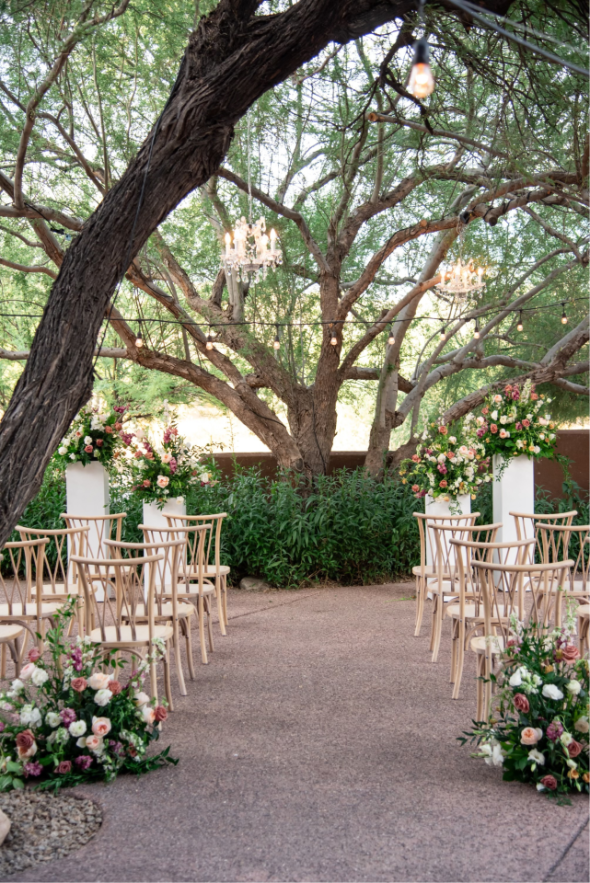 With the McDowell Mountains wrapping around the courtyard this romantic space it perfect for your ceremony or outdoor reception, bridal shower or rehearsal dinner.