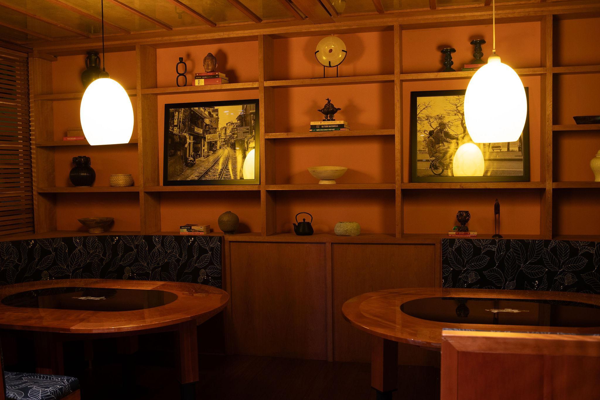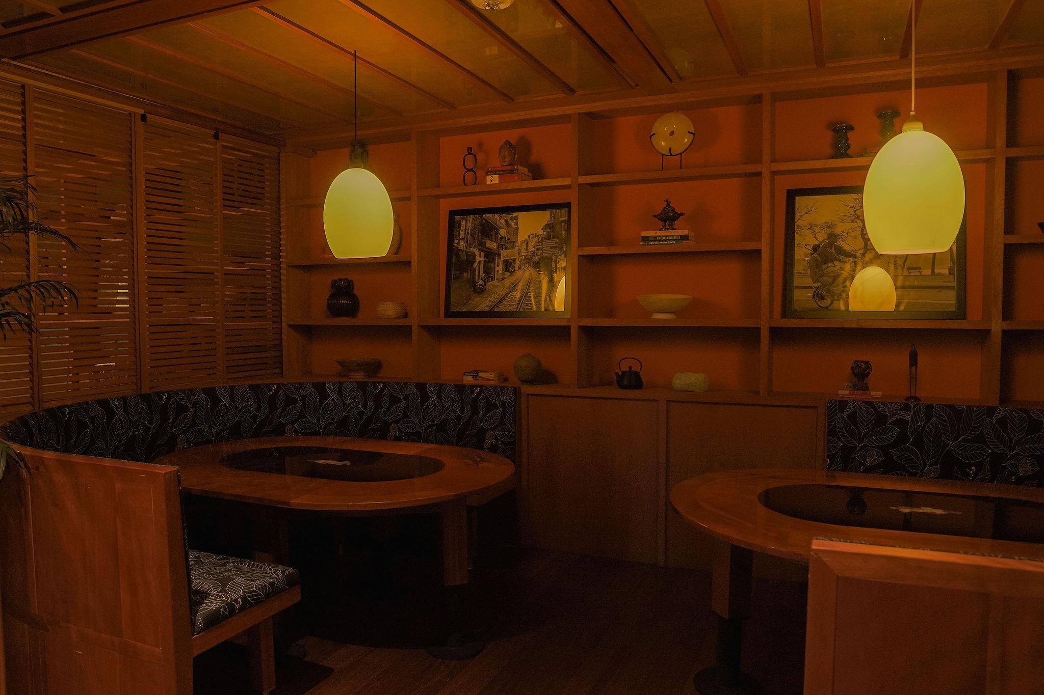 Hoi An Room is a cozy space with a hidden bookcase that opens to a secret wine cellar, ideal for private parties.