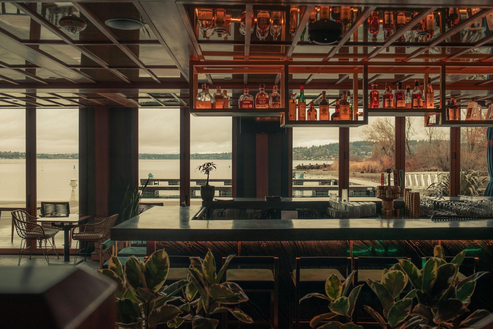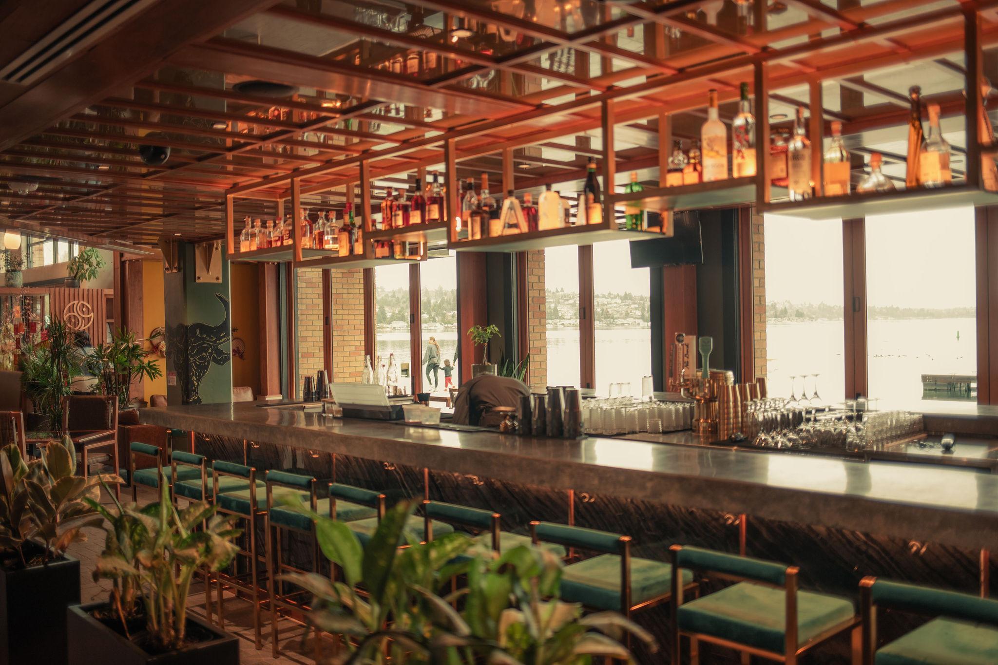 Our upstairs dining space features a mezzanine overlooking the restaurant space - perfect for people watching with a bird's eye view, and expansive windows that open up a stunning panoramic view of Lake Washington