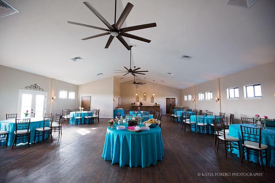 Our spacious, indoor reception area is perfect for dinner and dancing after saying "I Do!" Tables and chairs as well as set up and break down are included for your event. High ceilings, Texas sized ceiling fans, soft wall sconce lighting and a built-in bar help to make this space inviting, comfortable and fun!