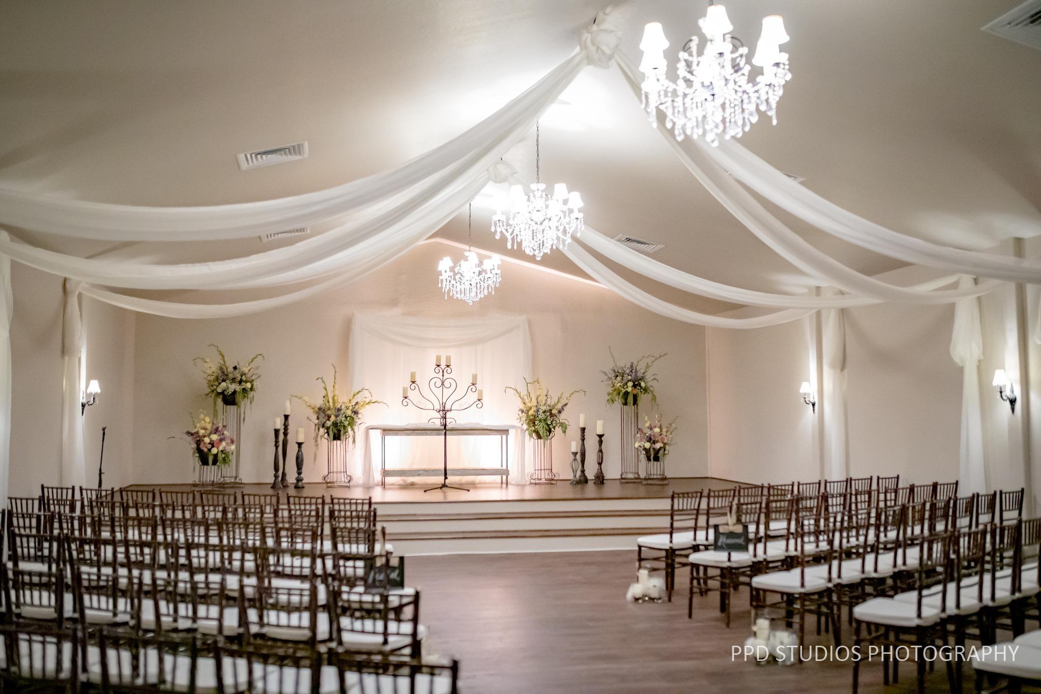 Our candlelit chapel area features beautiful chandeliers, floor to ceiling draping, a candlelit aisle and stage, with seating for up to 125. This is a beautiful spot to host your romantic ceremony especially with our crazy Texas weather!