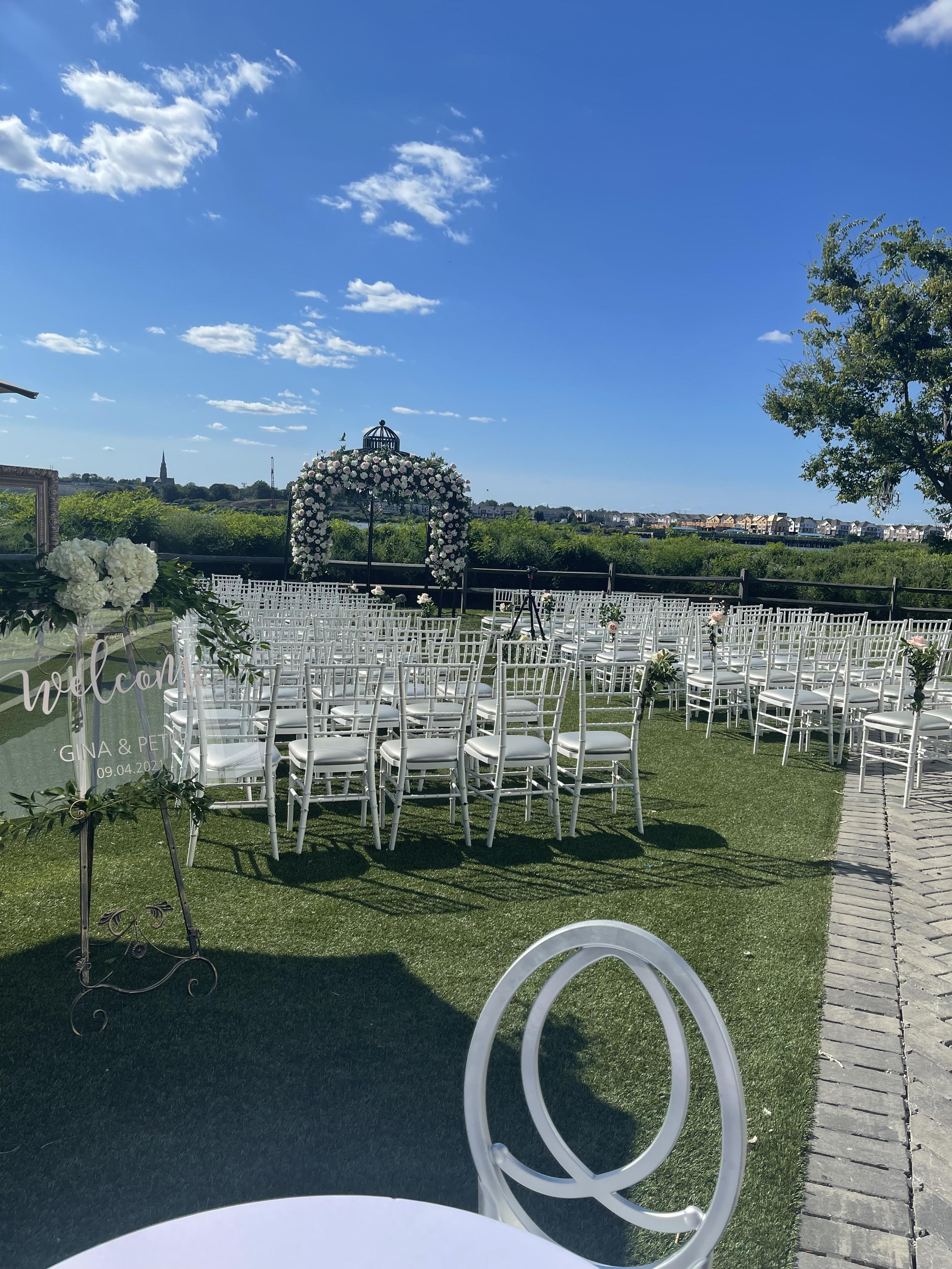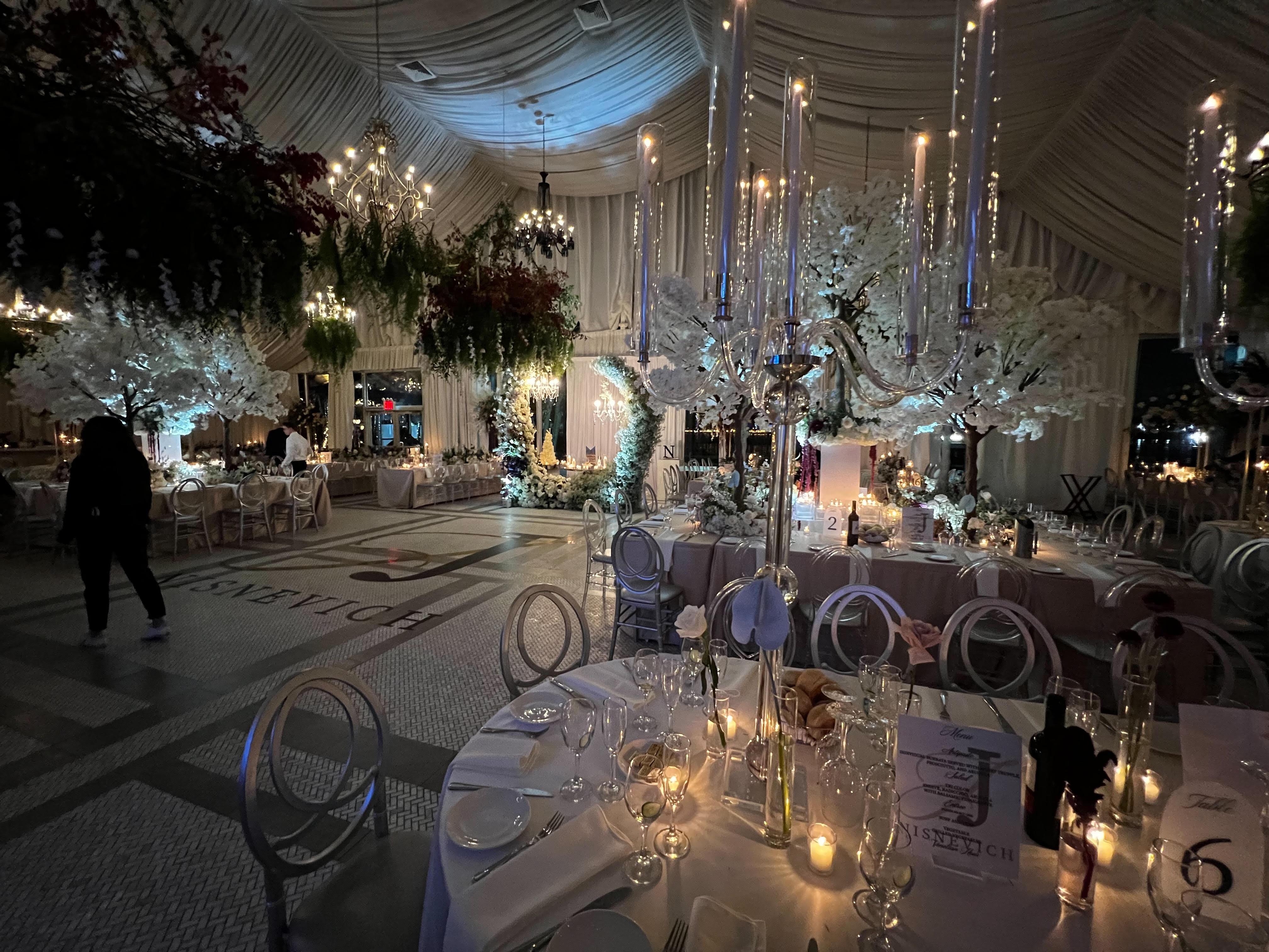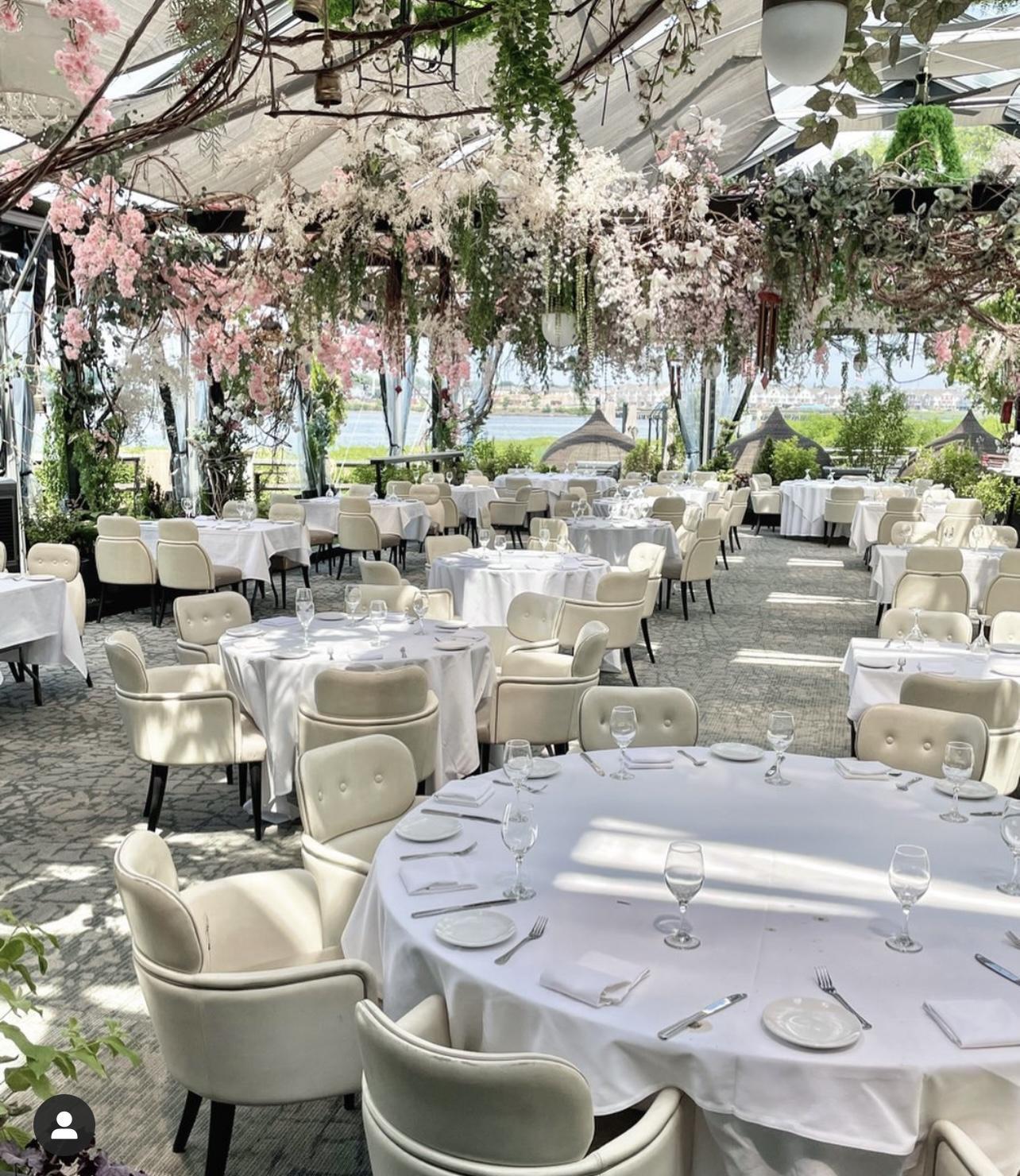 Our Bocce Garden is a Stunning fully decorated space covered in florals from ceilings to walls located right on the water.