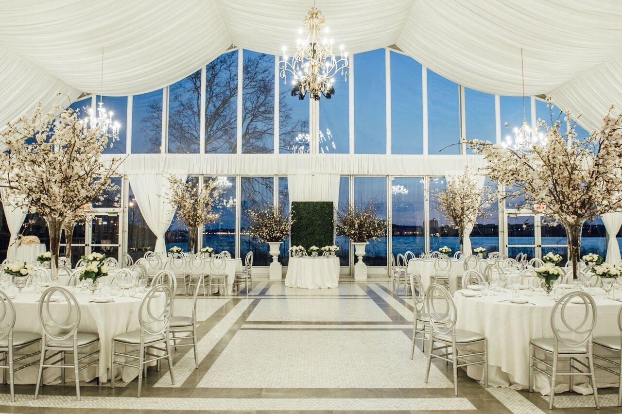 This space features all glass walls with white draping located right on the water with a private backyard. With the most breathtaking sunset views.