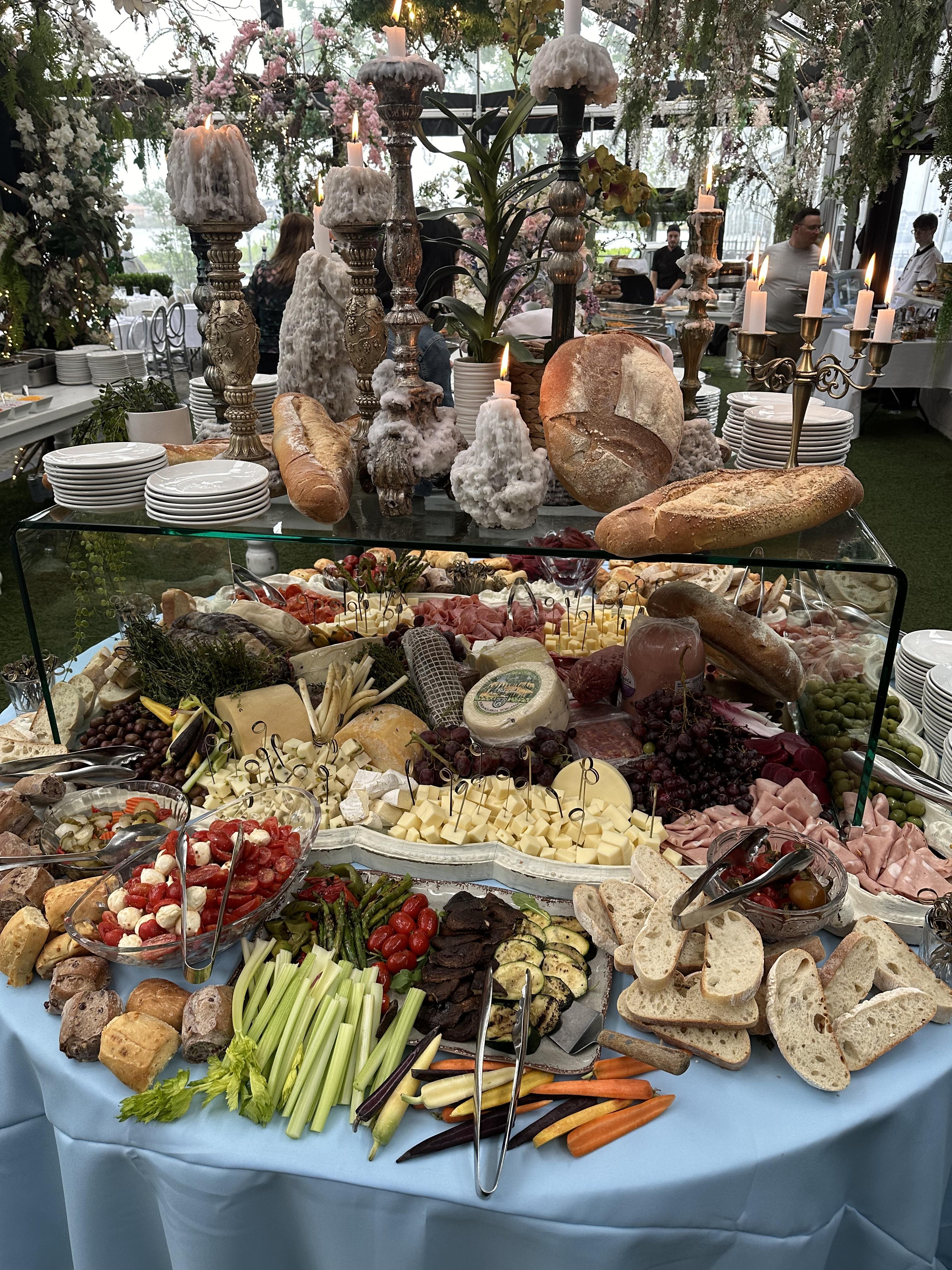 Cocktail Hour and half -choice of 5 passed hors d'oeuvres -Raw bar seafood station -Tuskin table -2 working pasta stations -Focaccia station -carving station Reception Menu -Antipasto -Salad course -Main Entree (pick 3 from different Entree choices) Venetian Hour -Two Stations included -Platters on the table