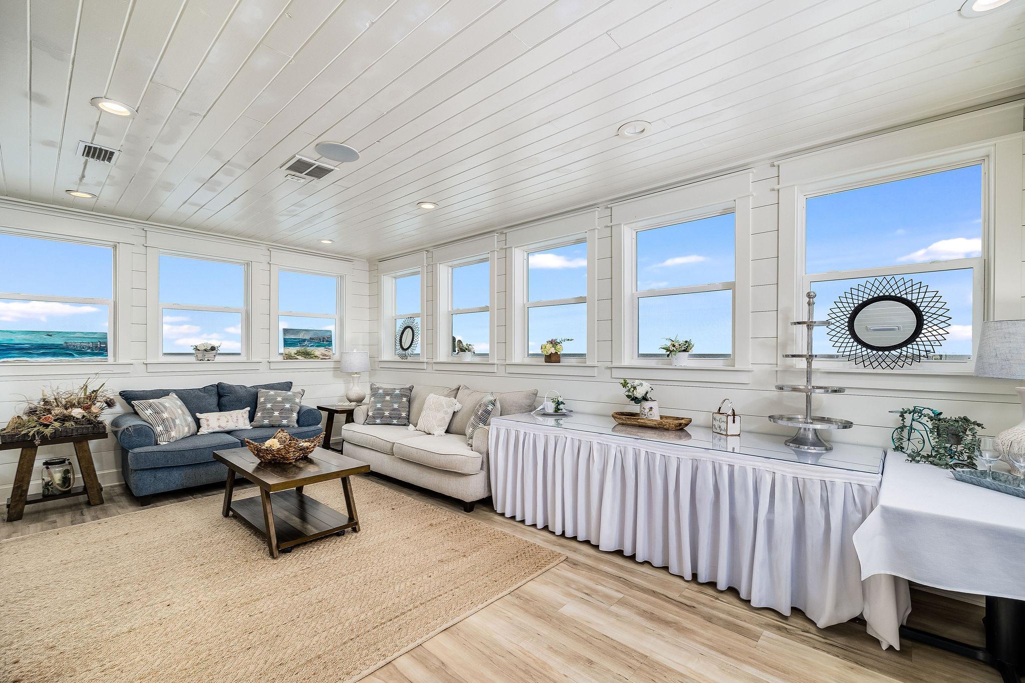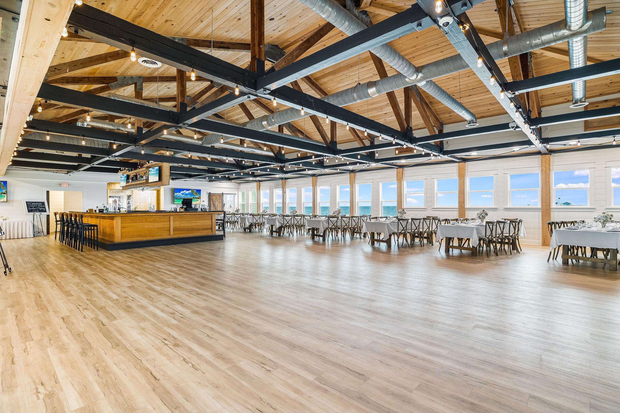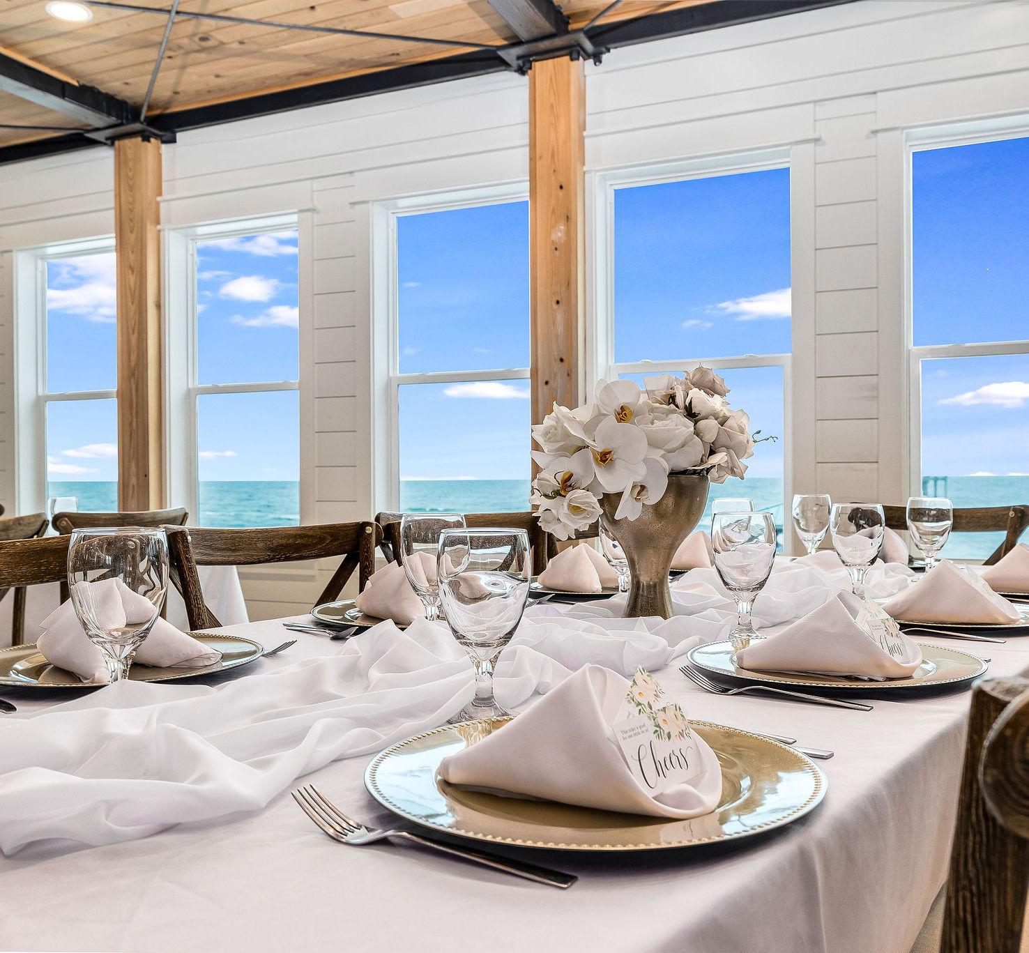 Stunning 4,000-square-foot, top-floor private venue overlooking the emerald waters of the Gulf Coast of Mexico. Our venue features vaulted 22-foot ceilings with stained cypress tongue and groove, large wood beams, wood flooring, and garden lighting. It seamlessly blends rustic charm with coastal elegance, earning it the nickname "Farmhouse Style Barn on the Beach."