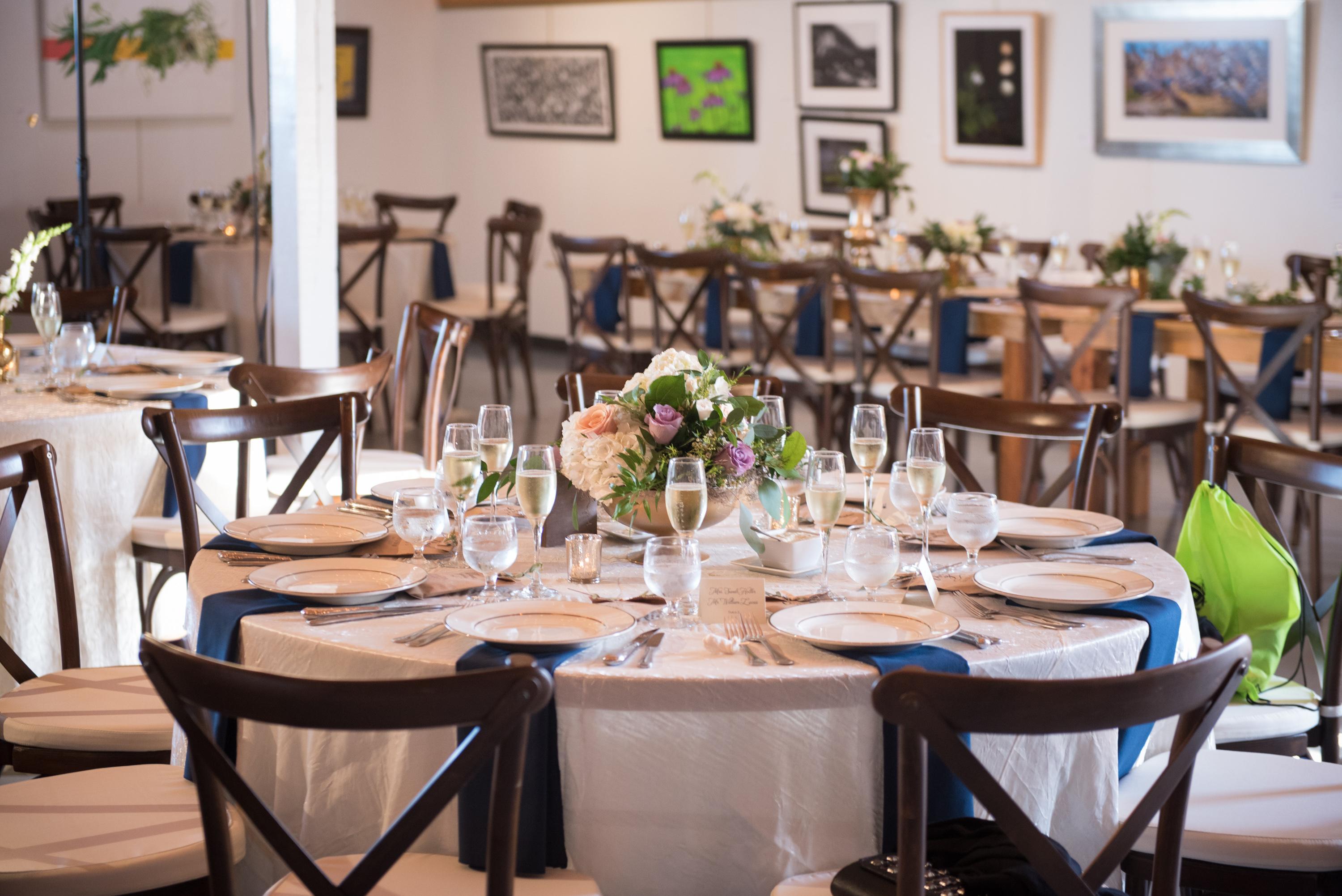 The 2,500 sq ft Bay Room is an industrial style space with concrete floor and exposed ductwork, complimented by ceiling-mounted string lights and white paper lanterns. We feature oversized Bay-themed portraiture by renowned local photographer Jay Fleming. The house lighting is all dimmable, and there are glass double doors that allow access to the Museum and the Waterfront Deck.