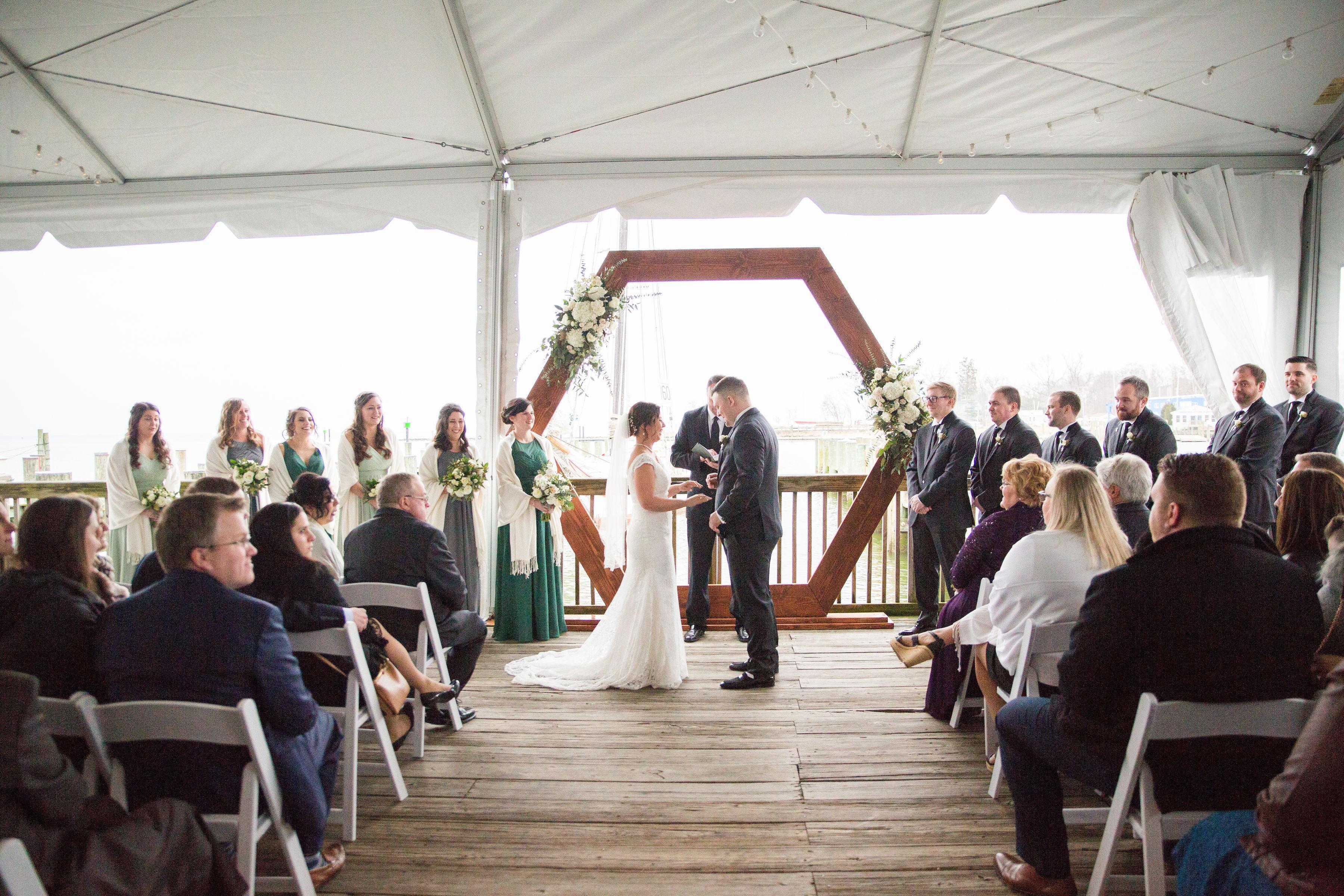 - Custom built tent 11' at perimeter and 17' at peak - String lights below the tent roof - Clear vinyl panels that can be pulled shut during inclement weather - Access to (3) 120' piers for photo ops or for guests to bring boats