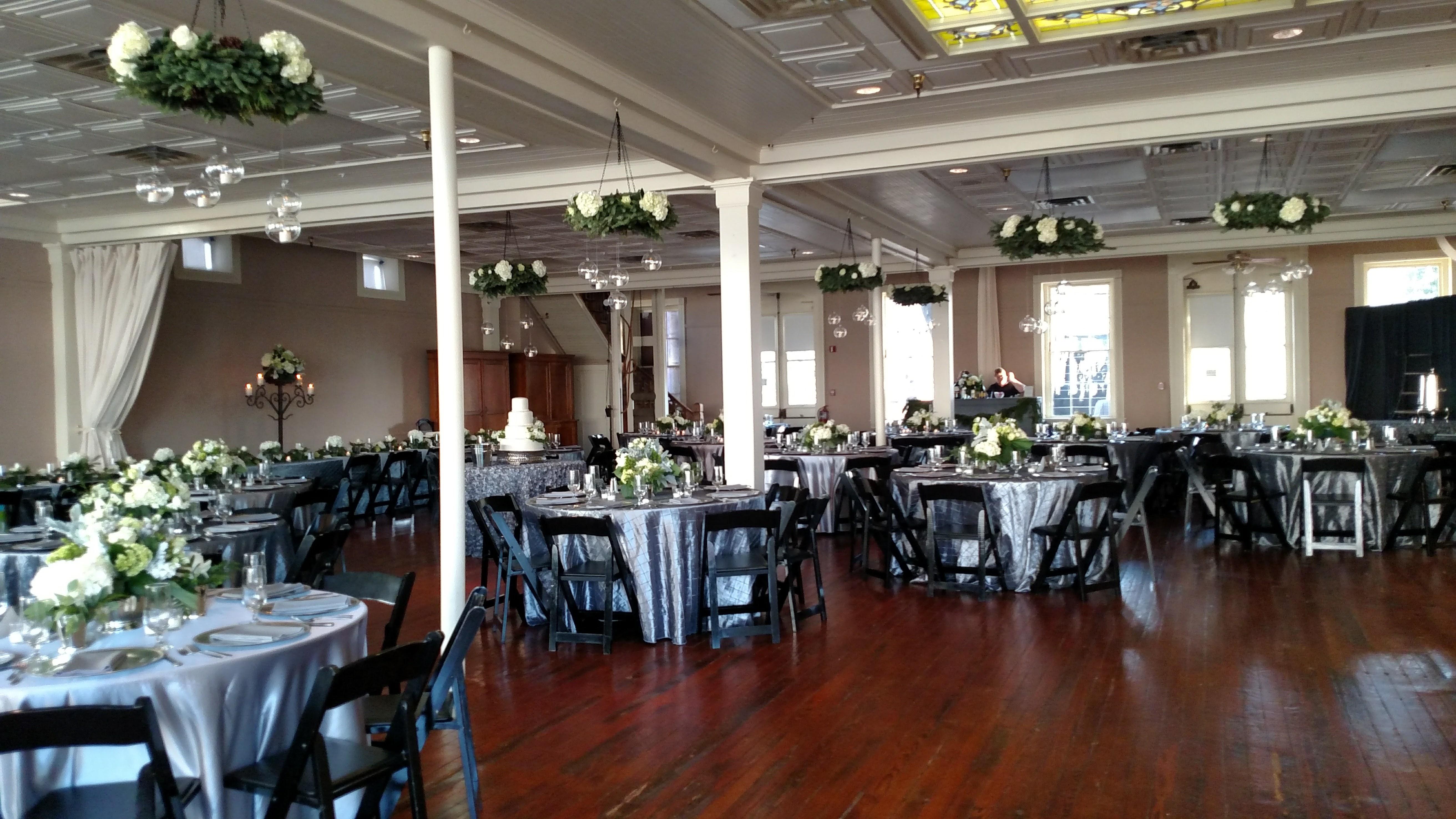 Our ballroom features a stained glass dome from the late 1800's and sets the mood for a reception or small ceremony. Neutral wall colors and large windows work with any color scheme or style! Doors from the ballroom open to the large veranda and garden which are included with any ballroom rental! The adjacent catering prep kitchen makes serving your guests dinner, appetizers or cake easy and convienant for all your vendors. All our packages include some round and rectangular tables.