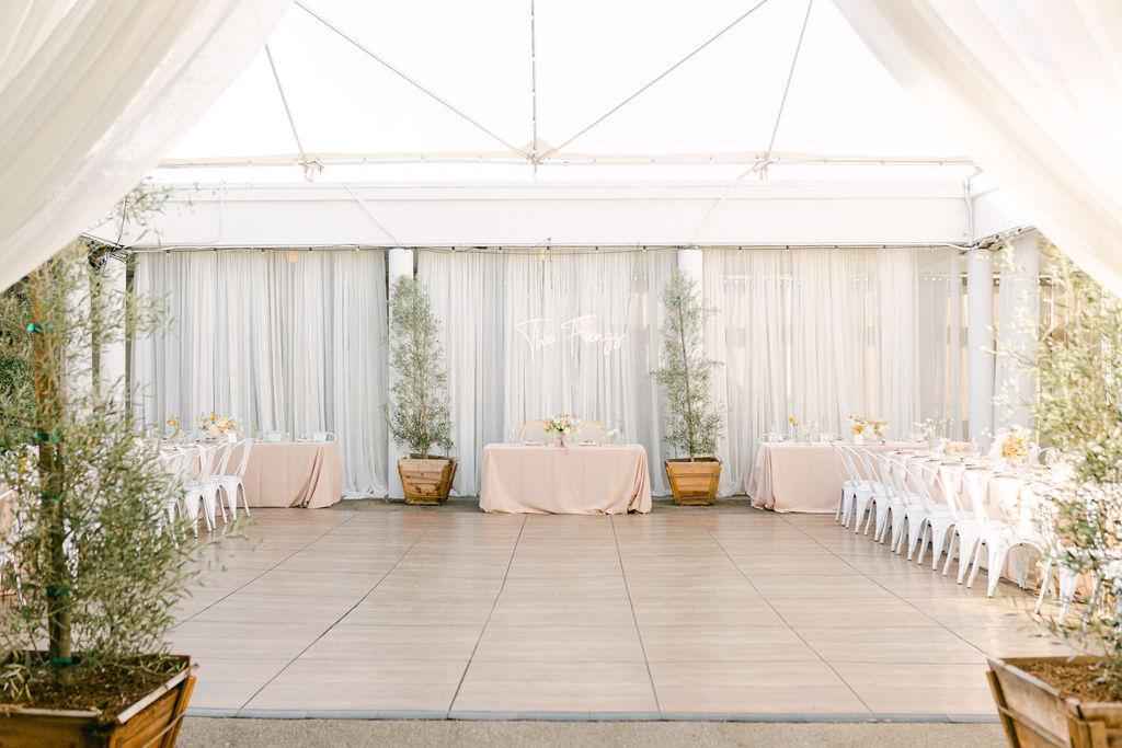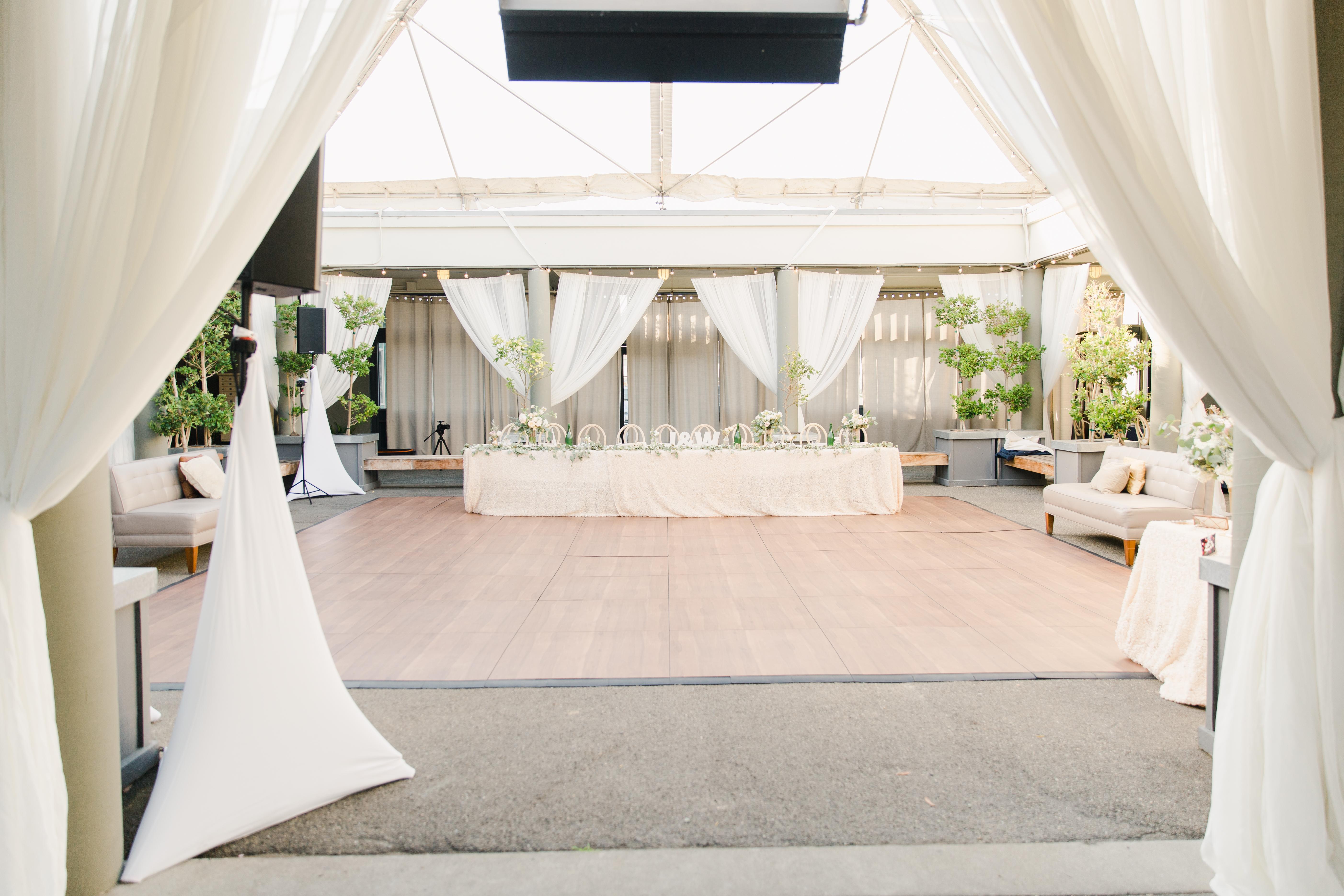 This is a large space, ideal for large dinners, dancing and more. Includes white drapes, string lighting, clear tent, dance floor and more.