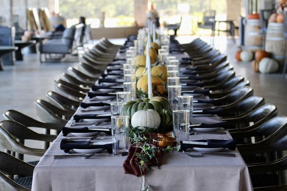 With a light and airy feel, the Garden Room is adorned with lush hanging plants that bring the beauty of the outdoors inside. Large windows and a stone accent wall connect the space to the resort's natural surroundings. Long communal tables and a modern bar area provide a perfect setting for a lively rehearsal dinner or a welcome party. This vibrant and earthy space feels both expansive and intimate, creating a fresh, relaxed environment for your guests.