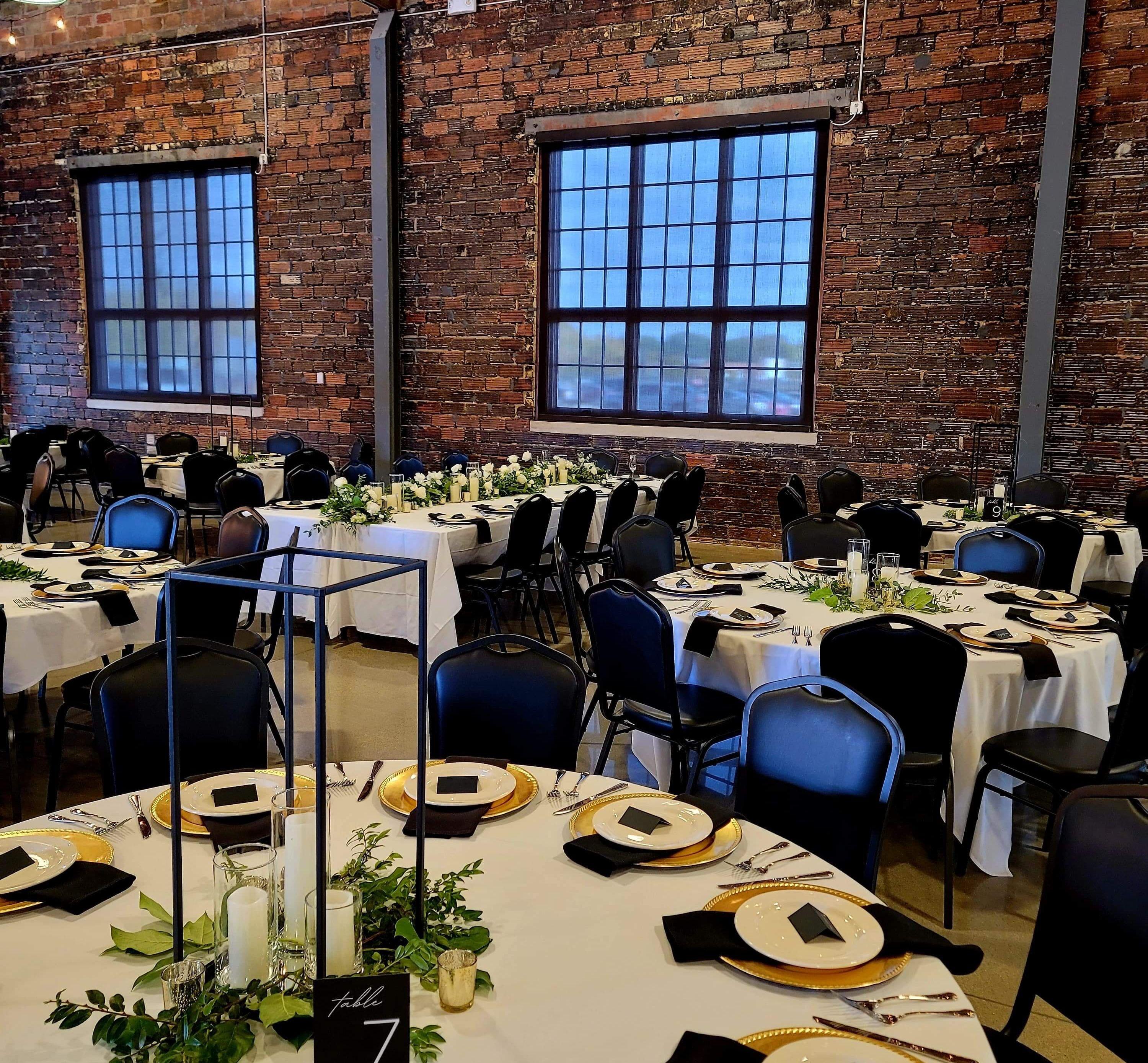 •Two dressing rooms/bridal suites •White or black linen tablecloths and linen napkins •Round or rectangular table options •Black banquet chairs •Skirted tables •Wireless microphones •TVs, projector, and screen for slideshow •Free Wi-Fi •Ample parking for guests •Use of the entire building •Flexible layout options •Caterer and bartender on-site •Communication with Armory staff to assist in planning