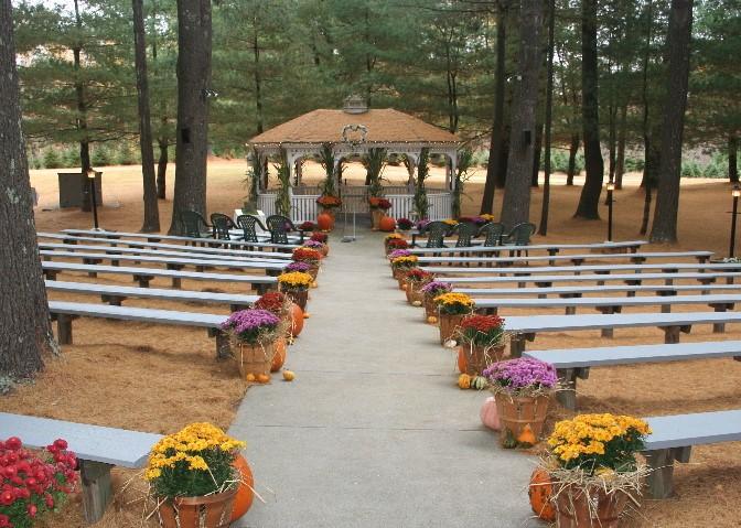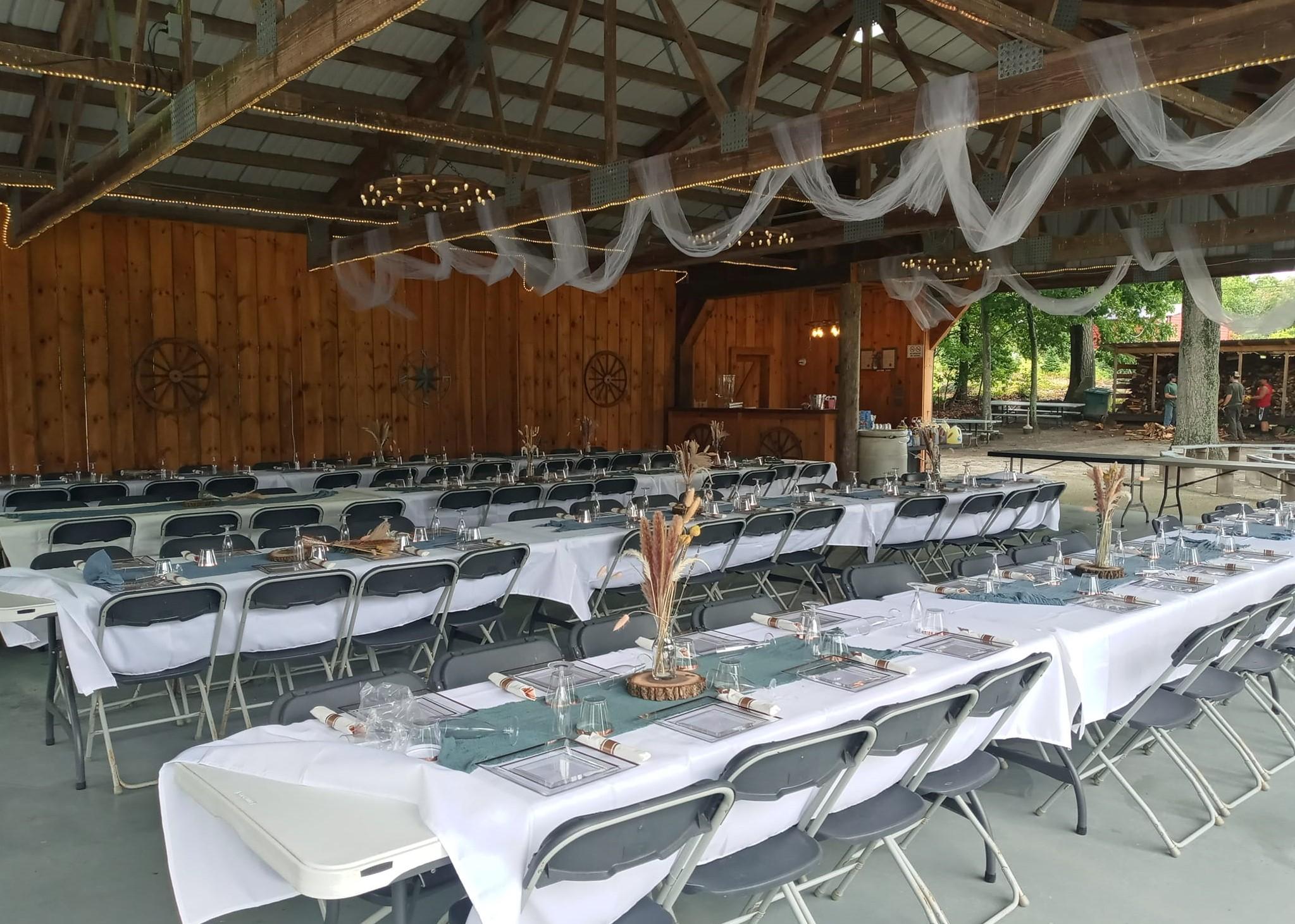 What could be more romantic than exchanging vows under the pines? This delightful area will make your wedding ceremony unforgettable. Lighting is provided for twilight ceremonies. After the ceremony, enjoy your wedding dinner in our Banquet Room or our Rustic Country Barn Area. Includes coordinator services, seating capacity for up to 350 guests, music and PA/sound system with DJ, restrooms.
