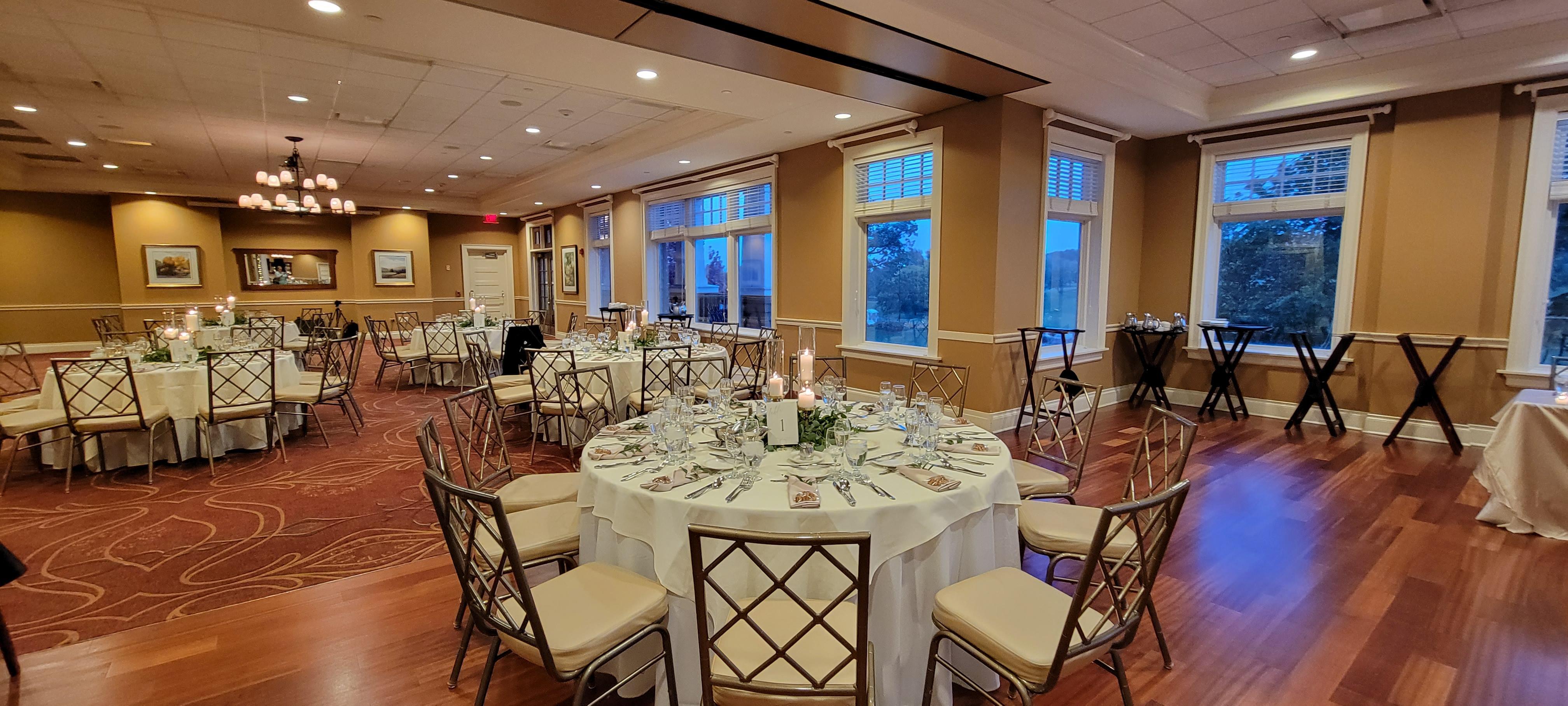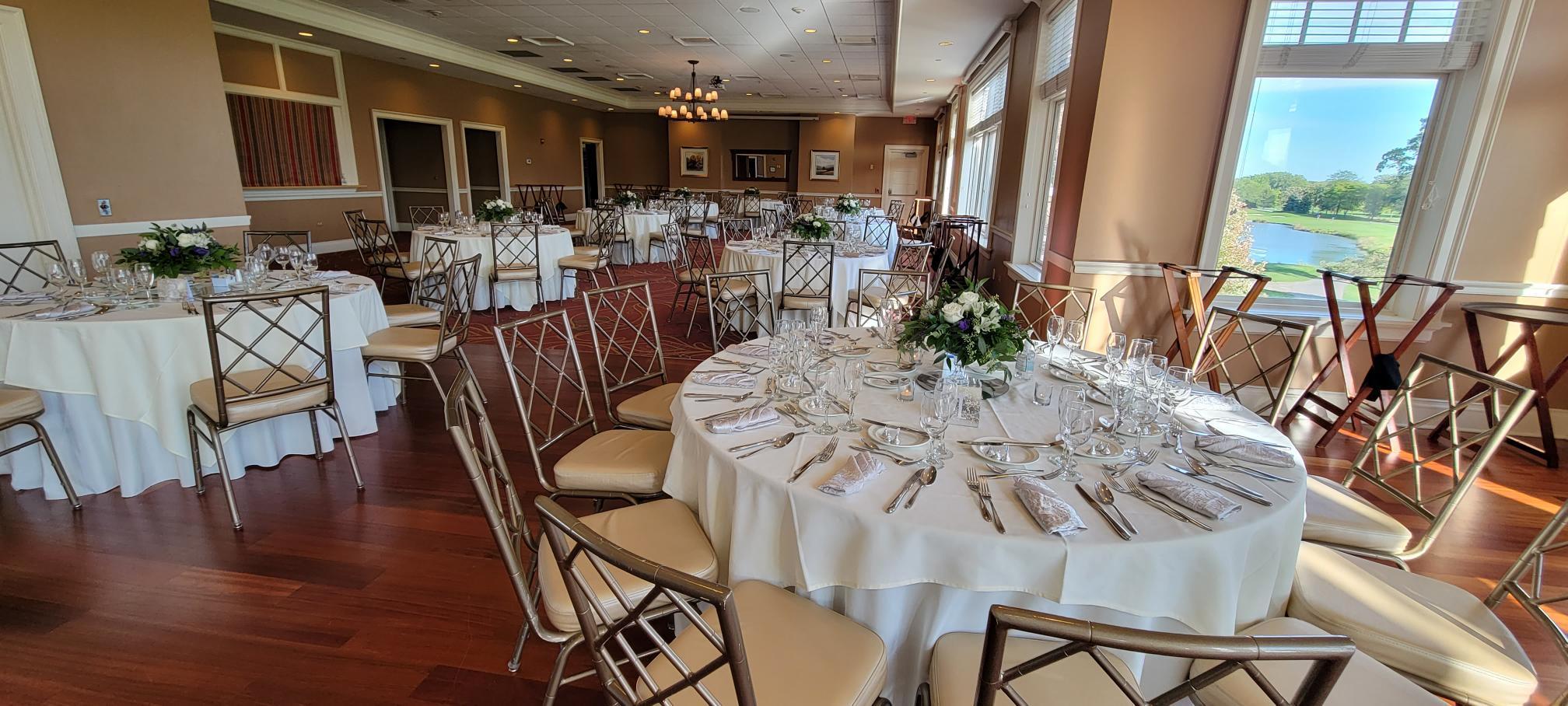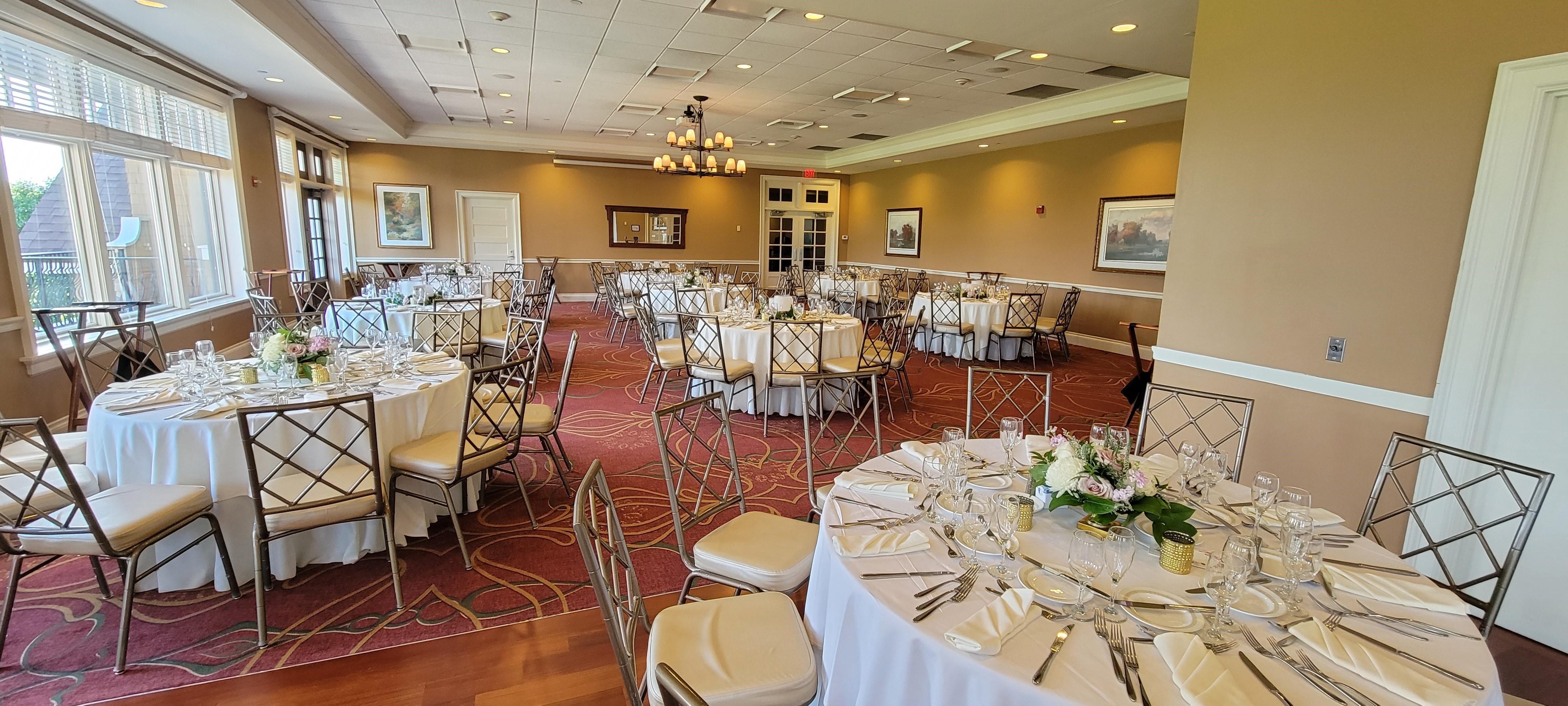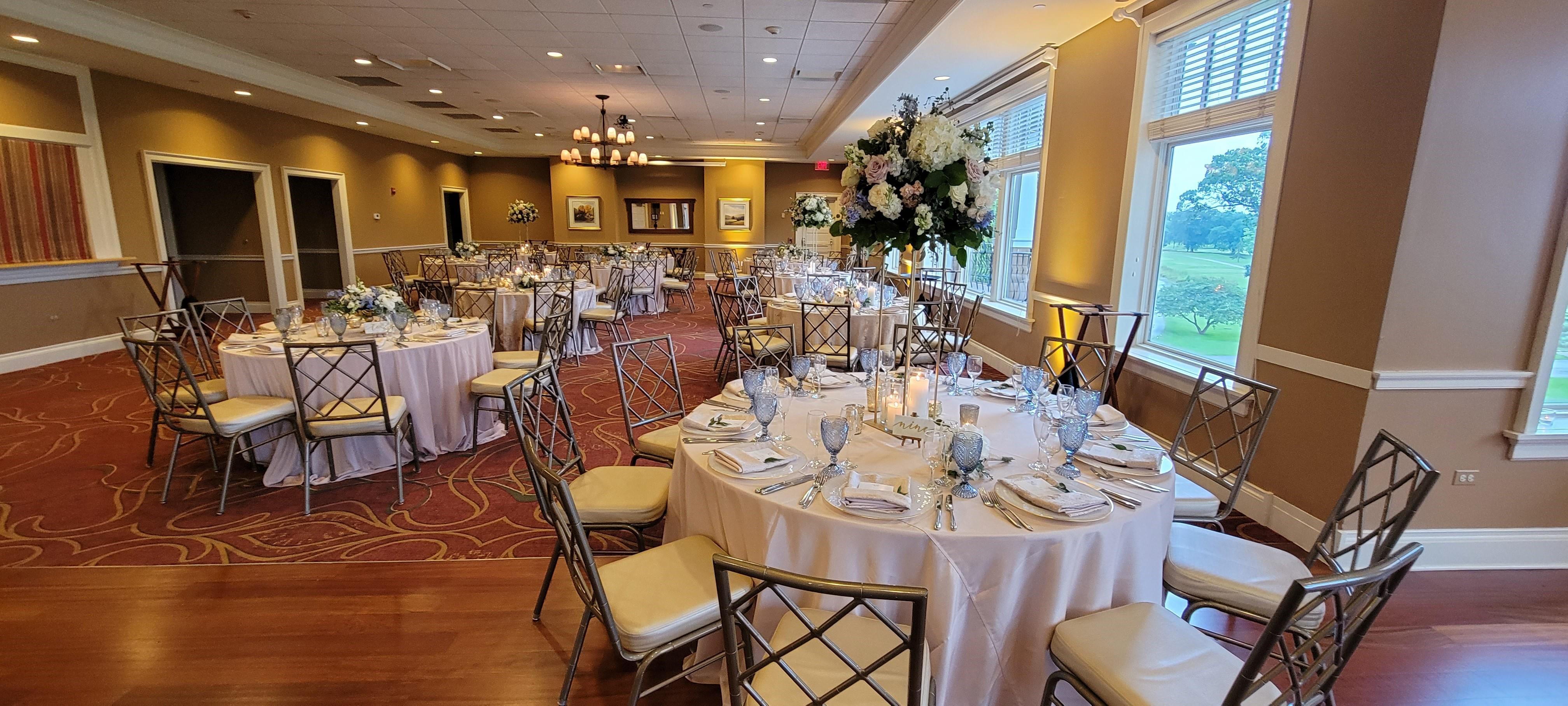 A beautiful ballroom overlooking meticulously kept golf greens with three private balconies.