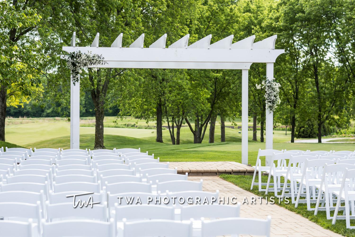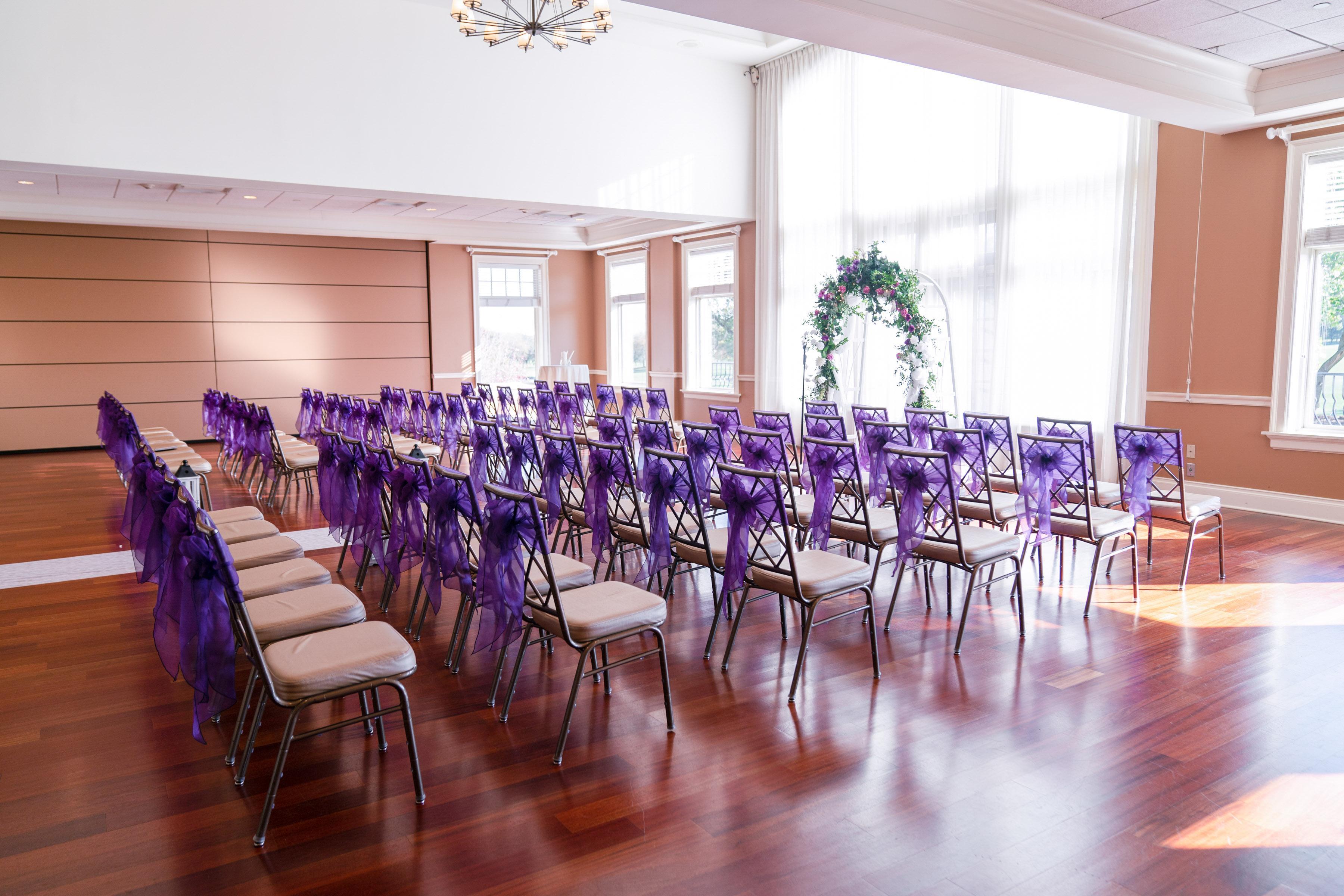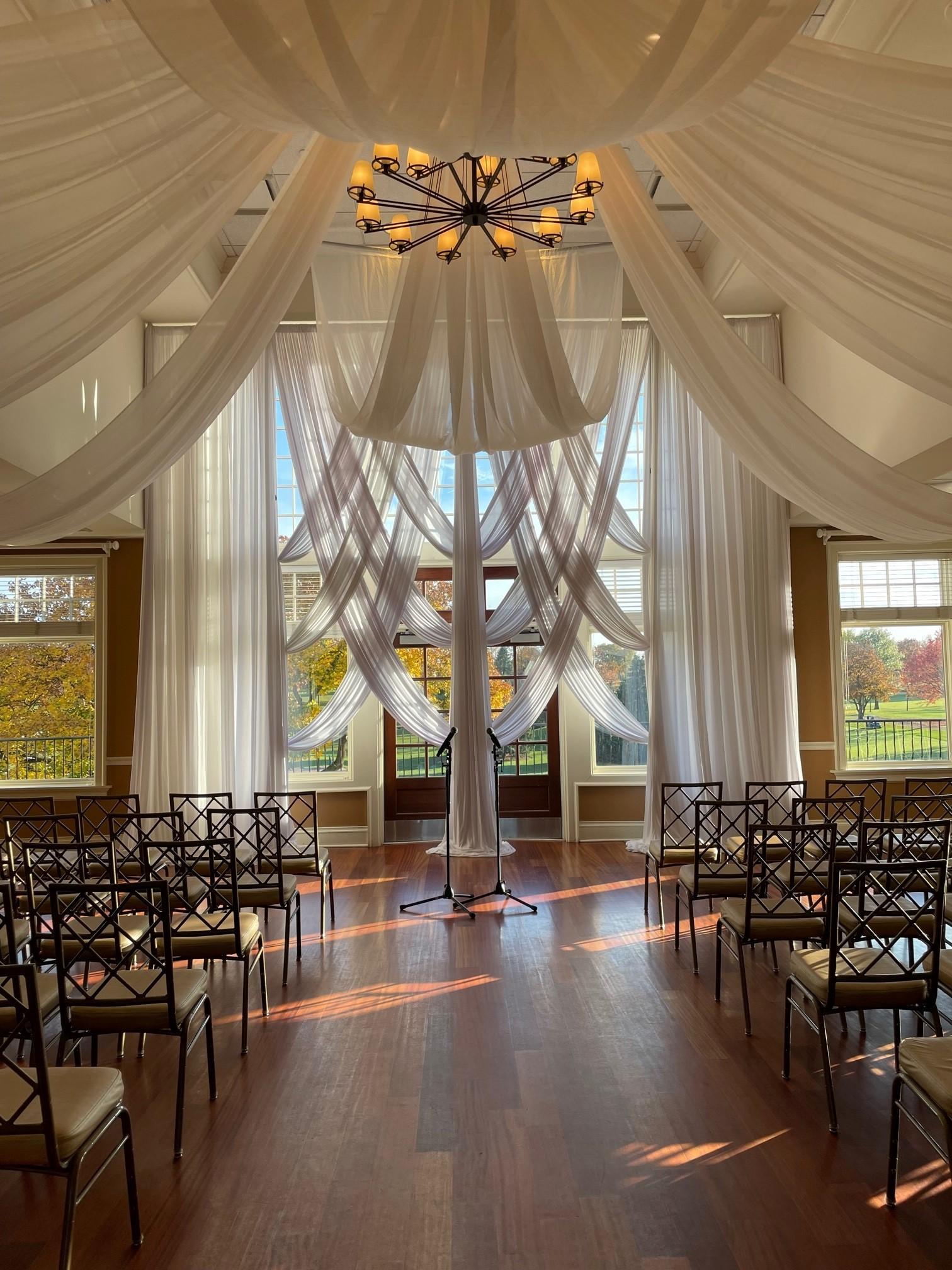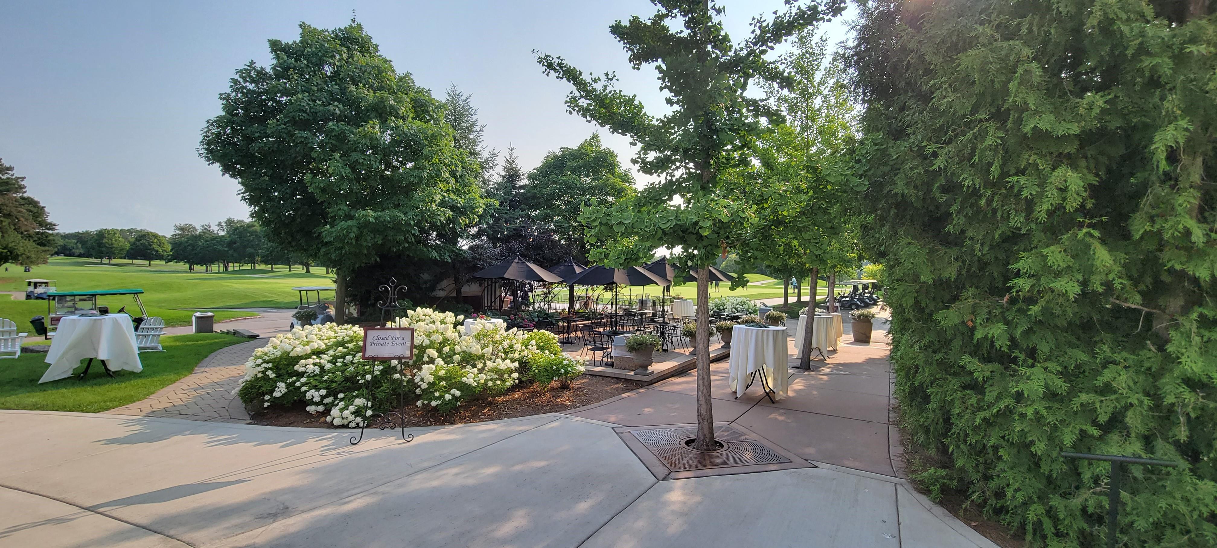 The outdoor ceremony site is tucked away just off the golf course with a private entrance for guests. There is a white pergola that can be decorated by a florist and the space can accommodate up to 150 white folding chairs.