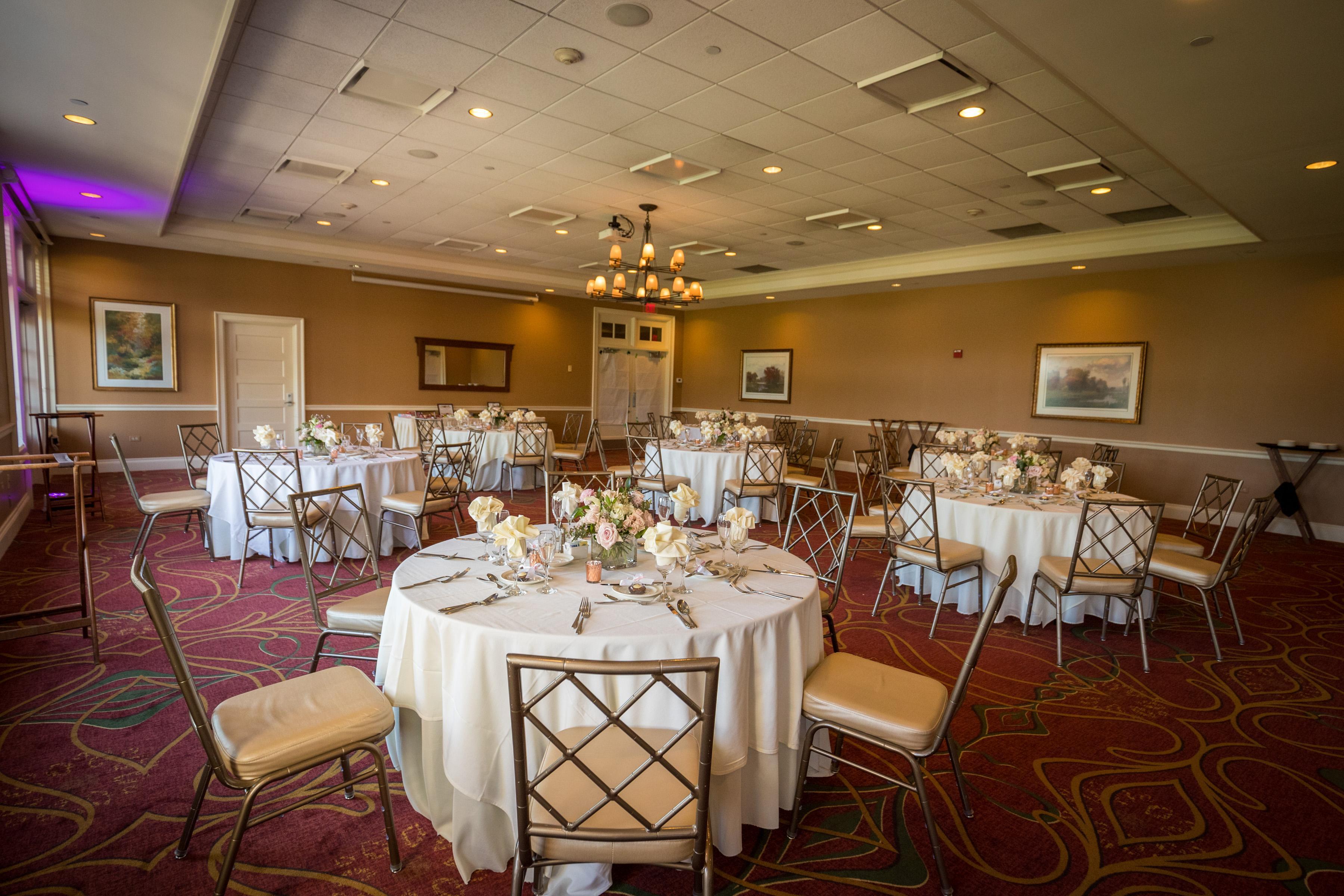 The Center Ballroom can be used as an indoor ceremony option and reset for reception, or can be used for smaller wedding receptions, wedding showers, rehearsal dinners, cocktail parties and other social events. Floor to ceiling windows overlook the golf course and a private balcony allows guests to step outside at any time. The Center Ballroom can open up with the East Ballroom to accommodate a slightly larger group, or can open up into the Grand Ballroom for weddings of over 100 guests.