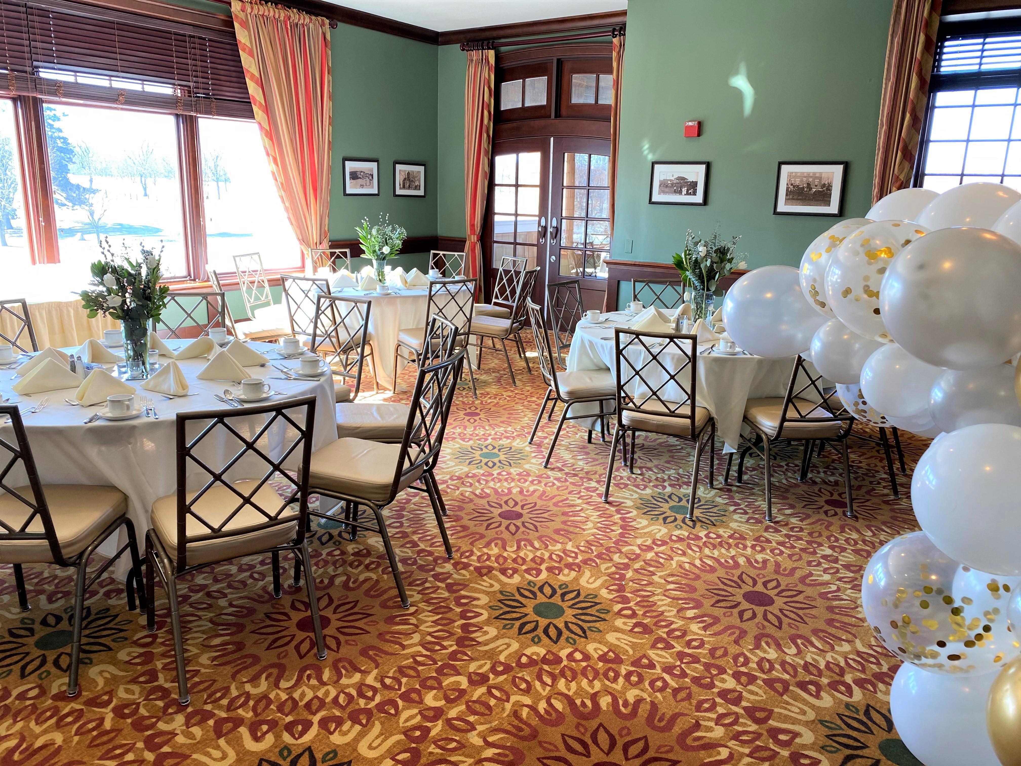 The Sun Room is a great space for smaller wedding dinners, wedding showers, rehearsal dinners and other social events. The bright room allows for a lot of natural light and the fireplace can be lit for winter evenings.