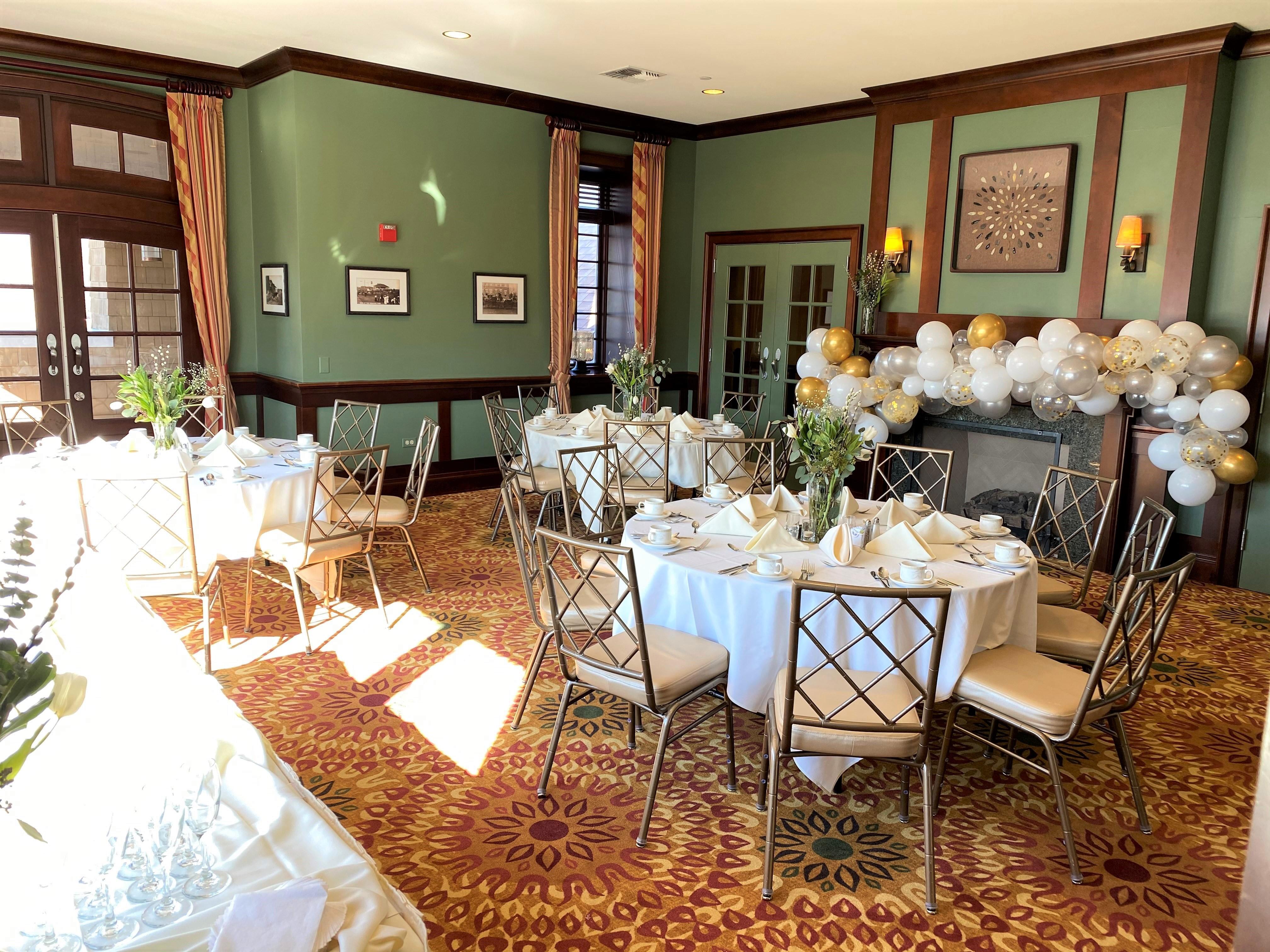 The Clock Tower Room is a favorite among many with its charm, private balcony and fireplace. It can accommodate up to 40 guests for a seated meal and is a great space for rehearsal dinners, wedding showers, small wedding dinners and other social events.