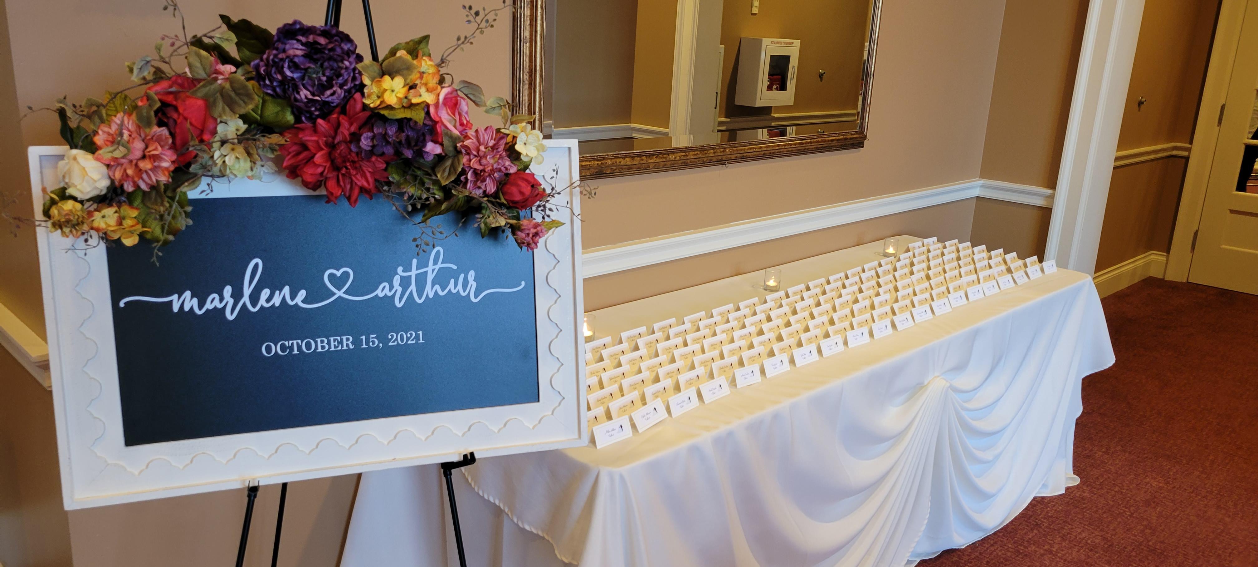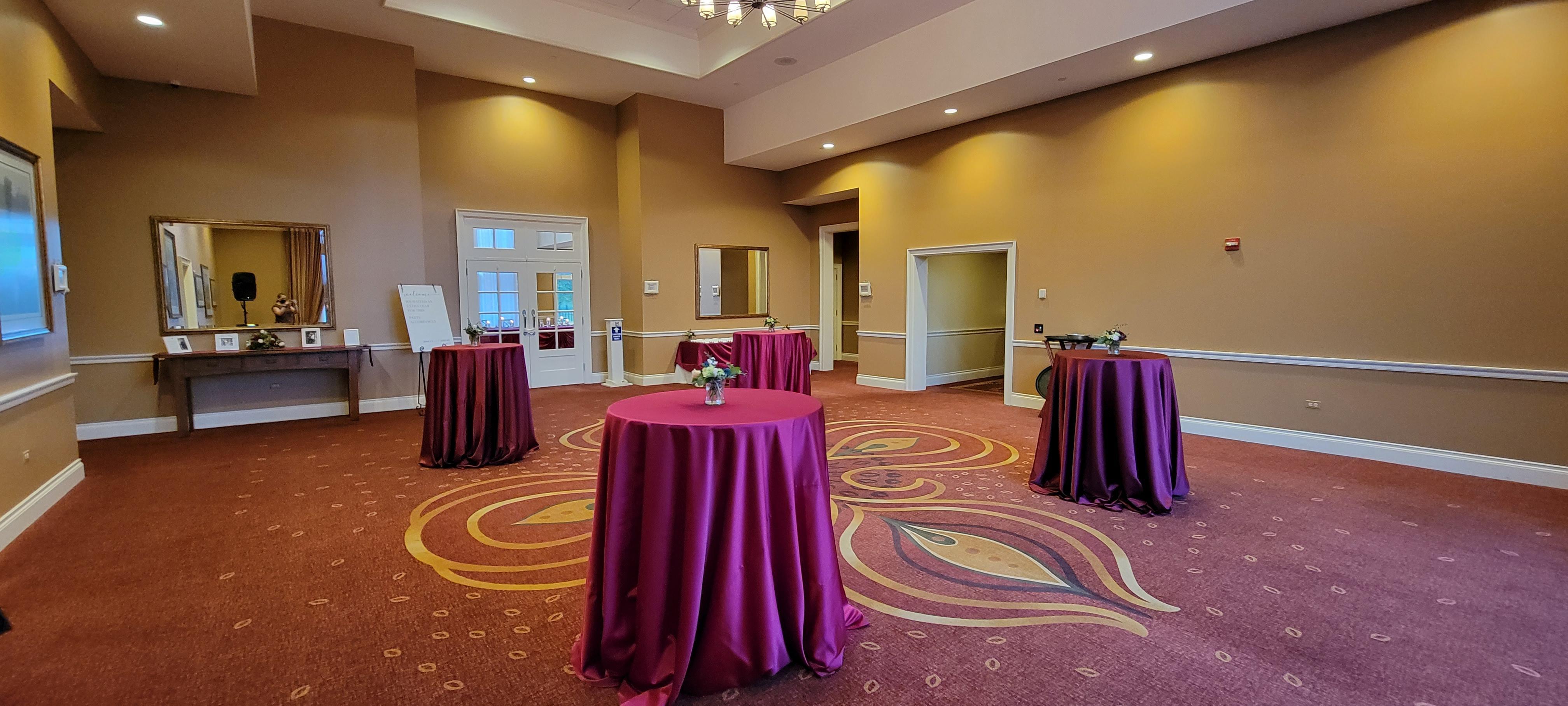 The Pre-Function Room is used most as the cocktail hour for wedding receptions, although it can also be used as an indoor ceremony space for weddings of 80 guests or less. It is a bonus space included when you host an event here at Arrowhead. This is a great place for a photo booth or back drop to be set up, or a late night snack. This is also where your place card table would be and your guest book.