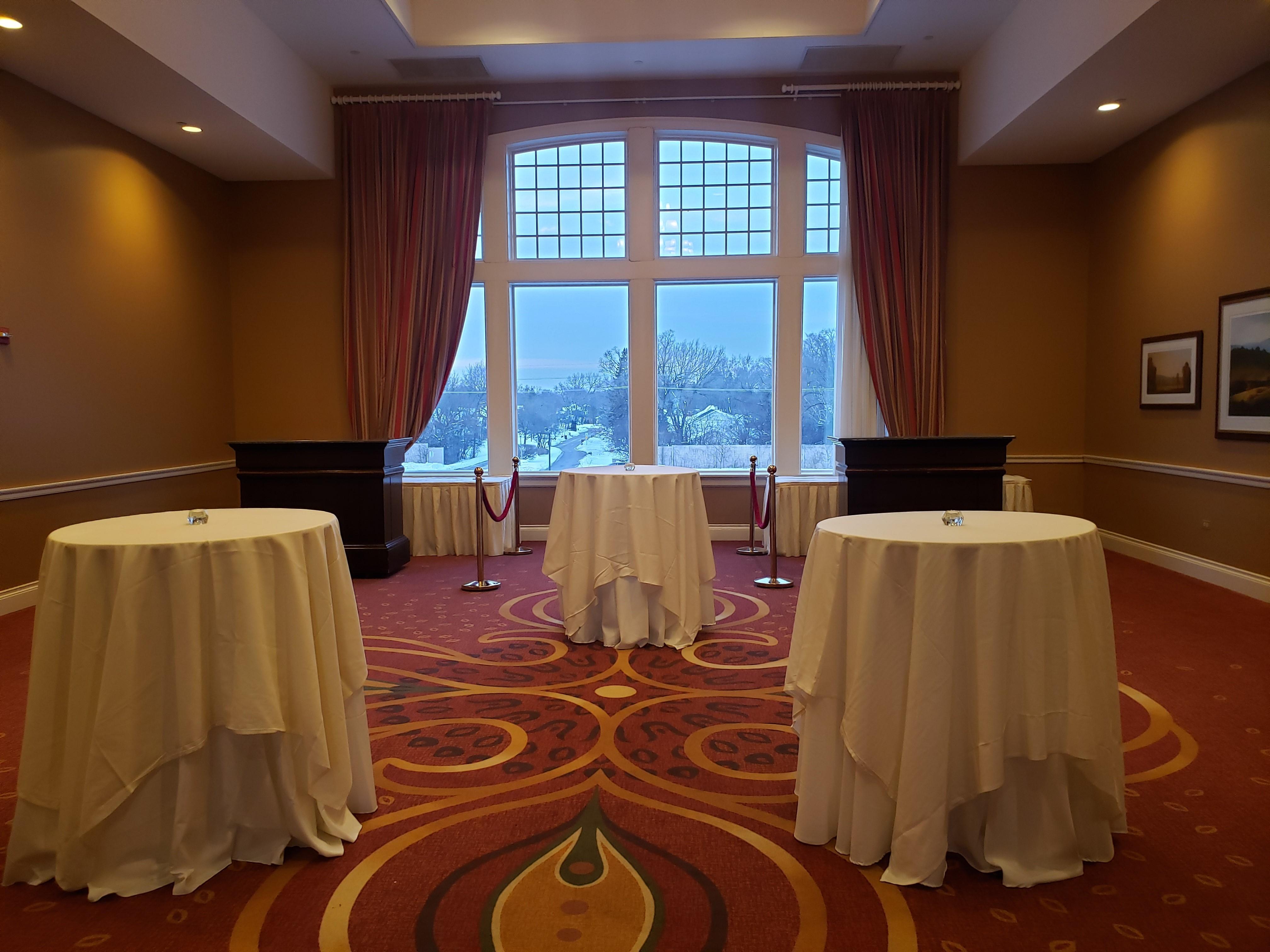 -All Tables and Diamond Back Chairs -Three Private Balconies -Vaulted Ceilings and Chandeliers -Pre-Function Room for Cocktail Hour