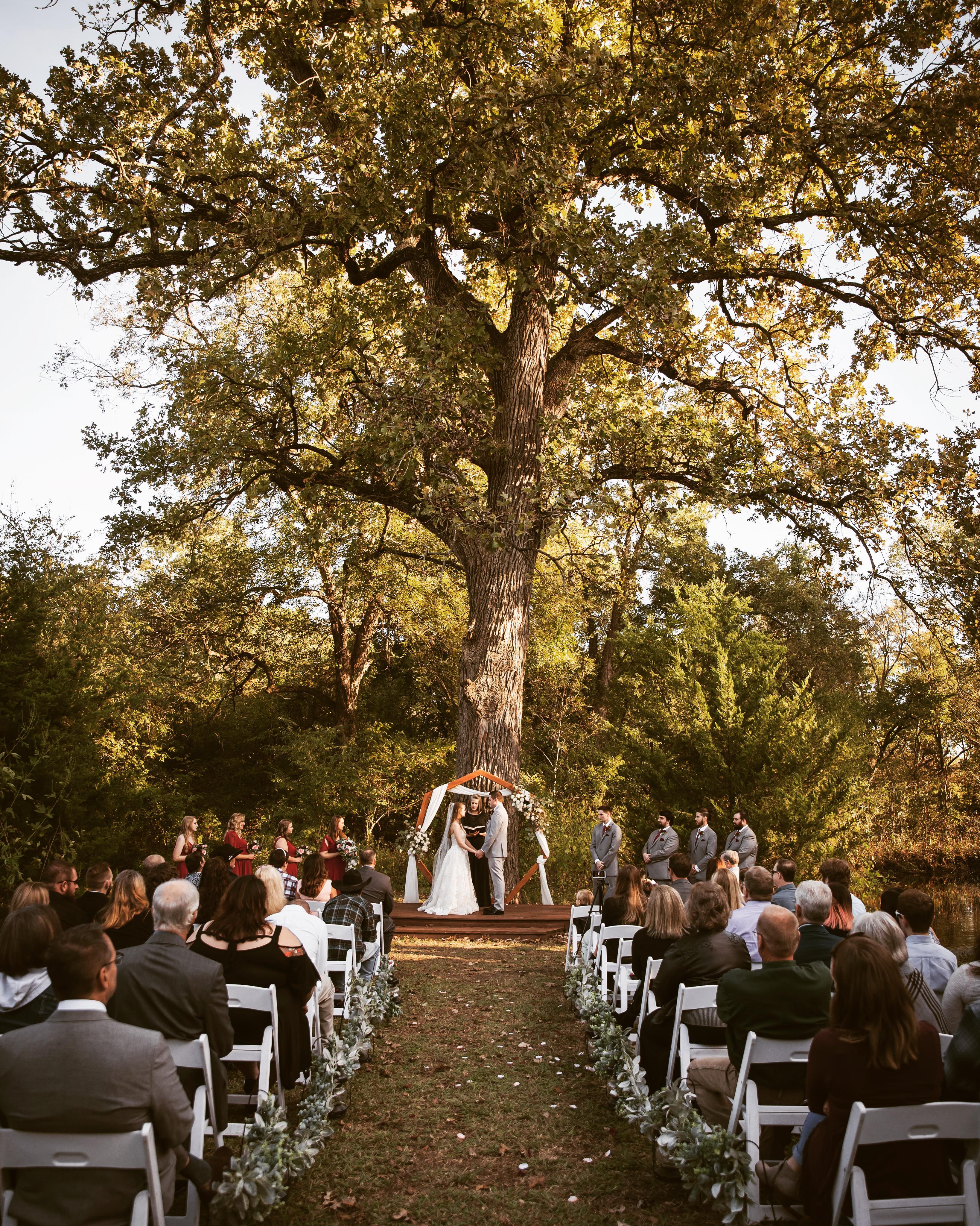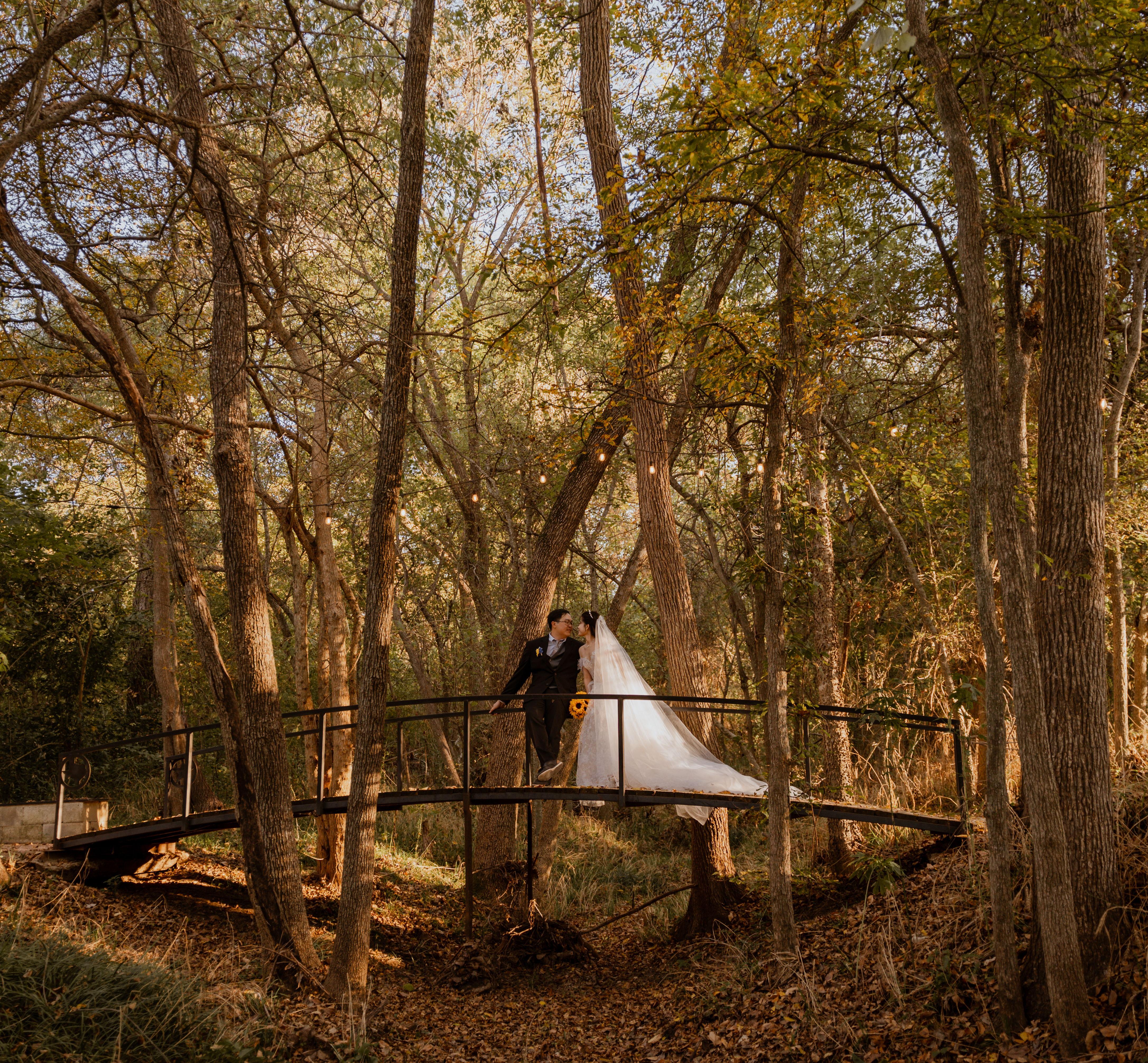 An affordable wedding venue located just 30 minutes south of Dallas. Our 10-acre, secluded, whimsical, wooded retreat offers a non-traditional venue with lush greenery, hundreds of mature trees, and tons of string lights, providing a modern rustic feel. Our space is pre-decorated with multiple ceremony backdrops, a hanging white floral dance floor, white drapes, and a photo wall (all included)! Perfect for those seeking a venue that is boho, dark romantic, or a forest setting for an intimate wedding. We even have resident wedding llamas and a beer burro to keep things fun and light-hearted! End the night with our convenient on-site lodging for your wedding party or guests!