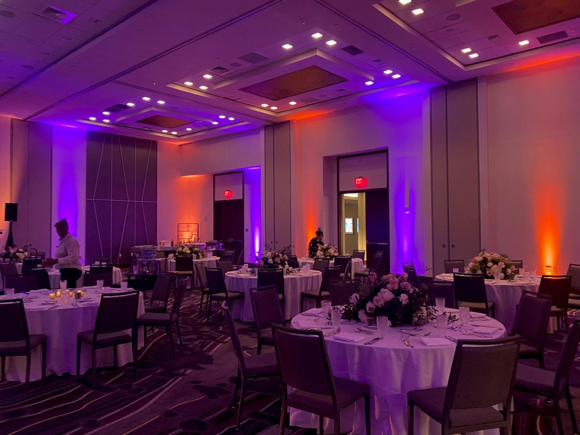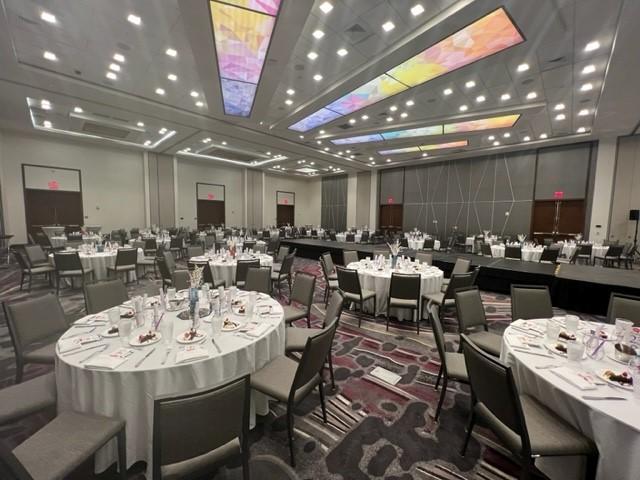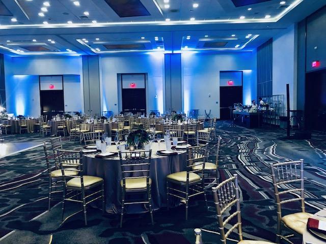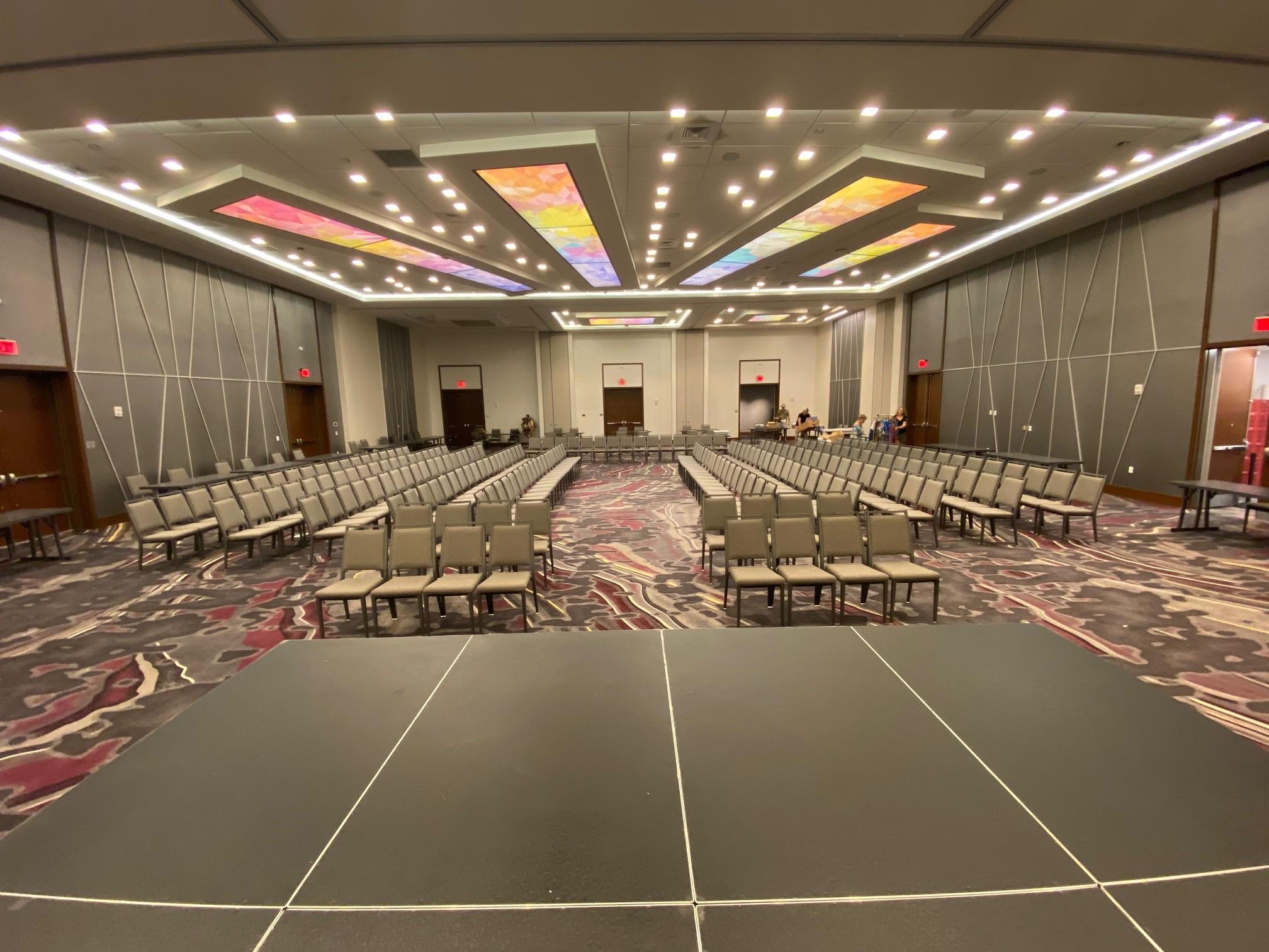 The Grand Crescendo Ballroom is located on the main level of the hotel and offers 6100 square feet of unobstructed space with 18 foot high ceilings and Mosaic lighting.