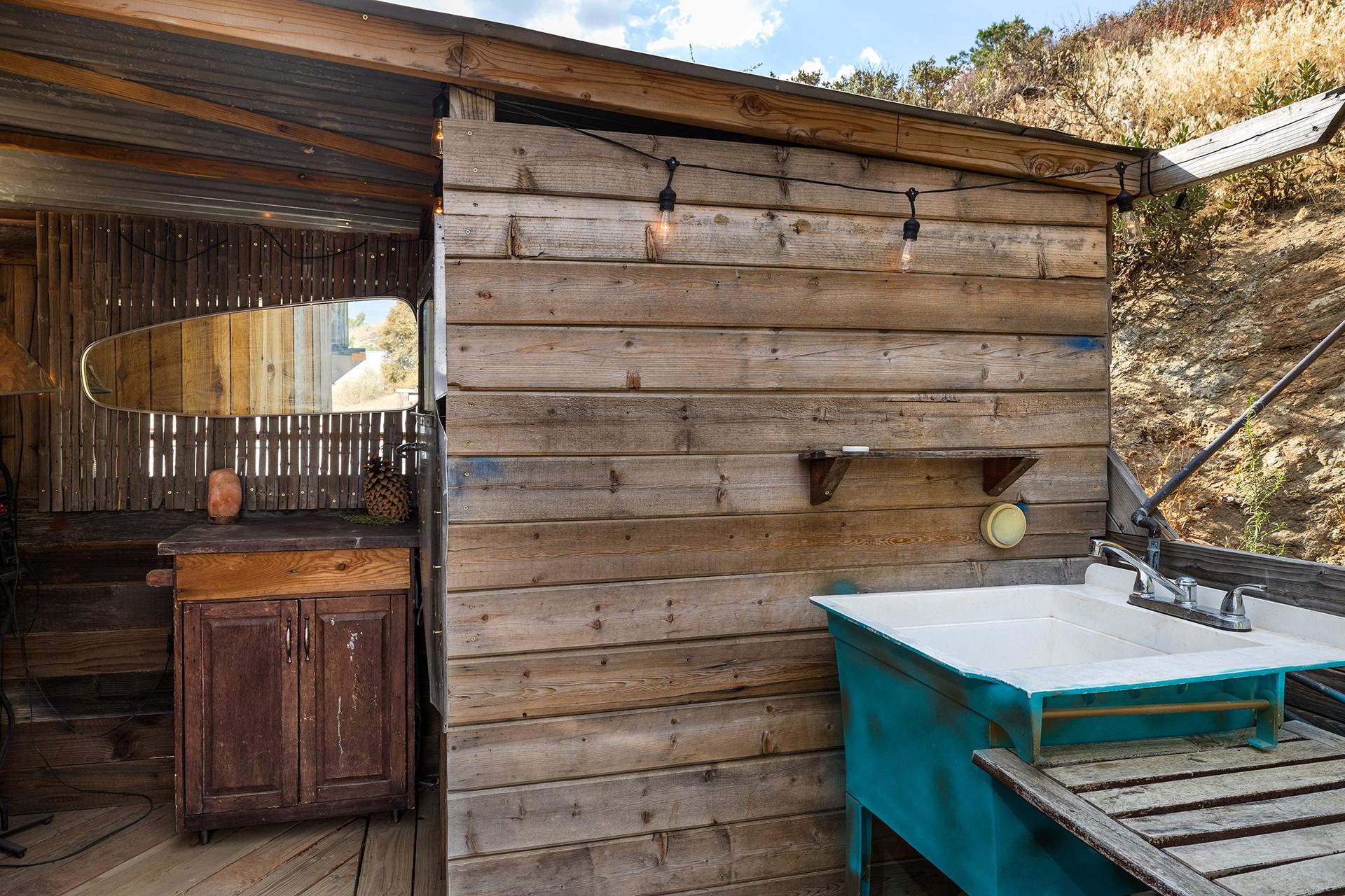 Our most popular glamping accommodation, the yurt was hand-crafted by our team of set construction/decorators. Includes a romantic king bed, couch, desk, and woodfire stove. Also has a private wraparound patio with seating and a covered outdoor vintage shower/bathroom.