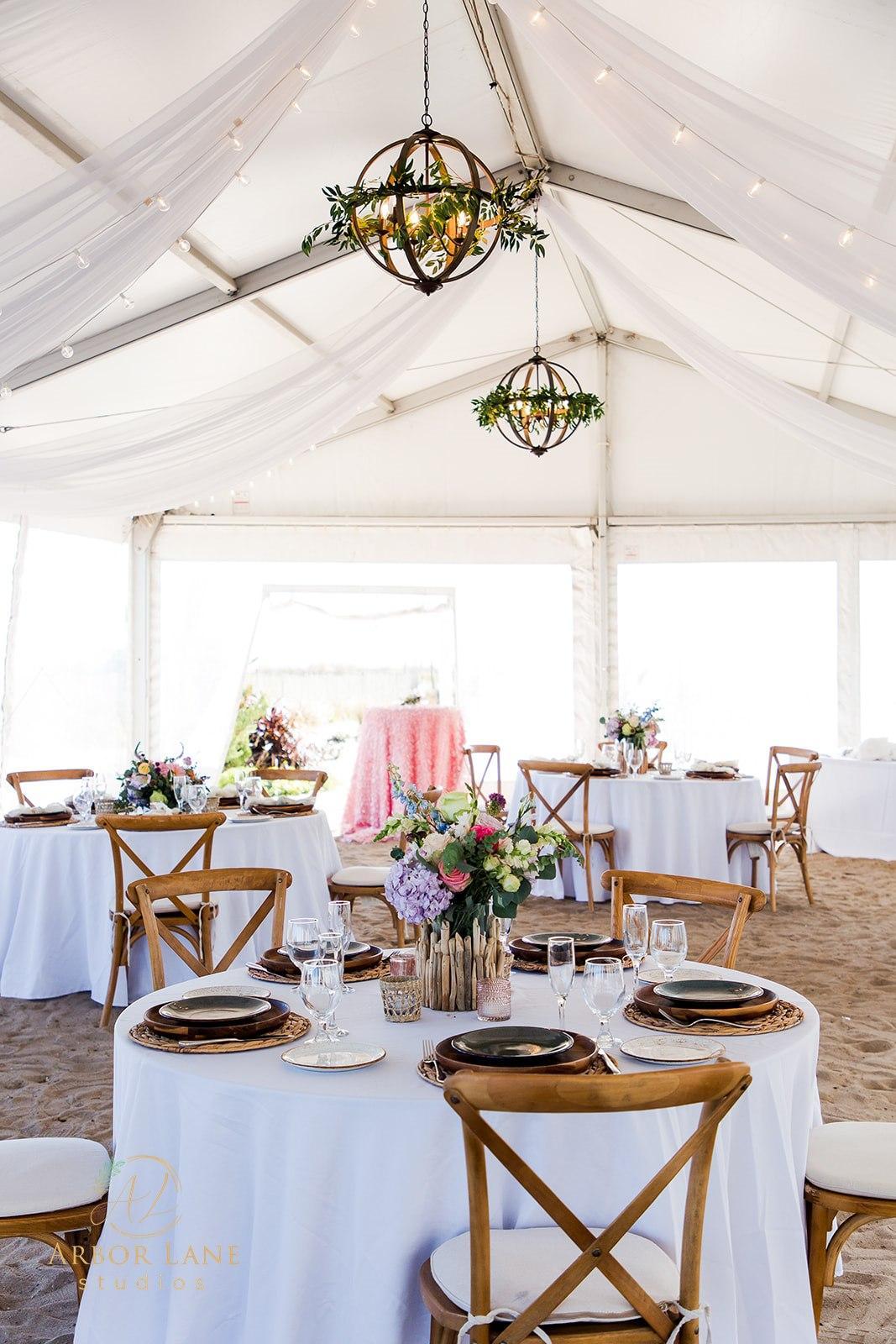 A plush and coastal chic space, boasting an adjacent outdoor space that has views of the Atlantic Ocean rendering it ideal for a reception style wedding celebration. Comfortable soft seating furniture staged with textured pillows make this setting one-of-a-kind on the Mid-Atlantic.