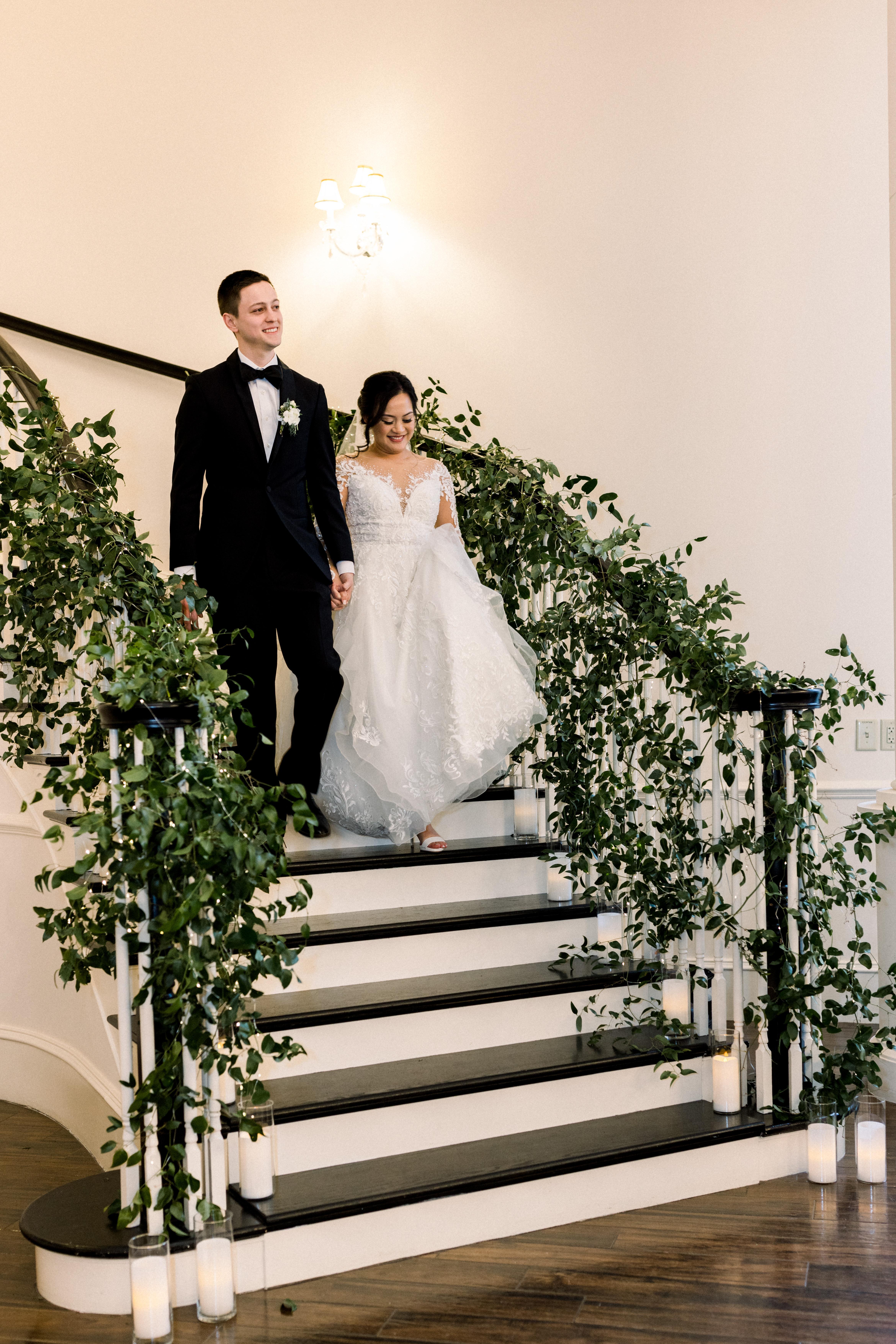 Walls of floor-to-ceiling windows welcome your guests into the expansive, airy ballroom, which overlooks the mature trees of the surrounding landscape. You’ll make a show-stopping entrance by way of the grand staircase before joining your nearest and dearest for a lavish meal created just for you by our seasoned catering team. Then, dance the night away under the crystal chandeliers as the sun sets on this most magical of days.