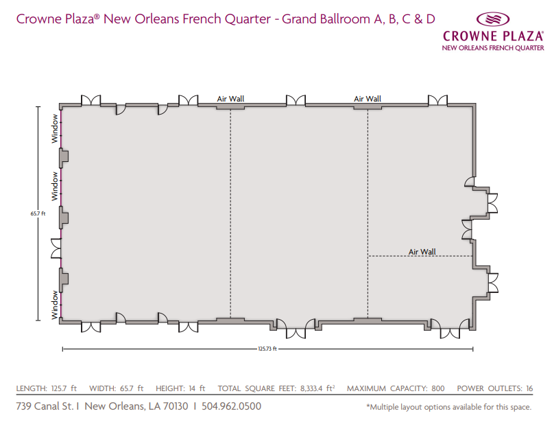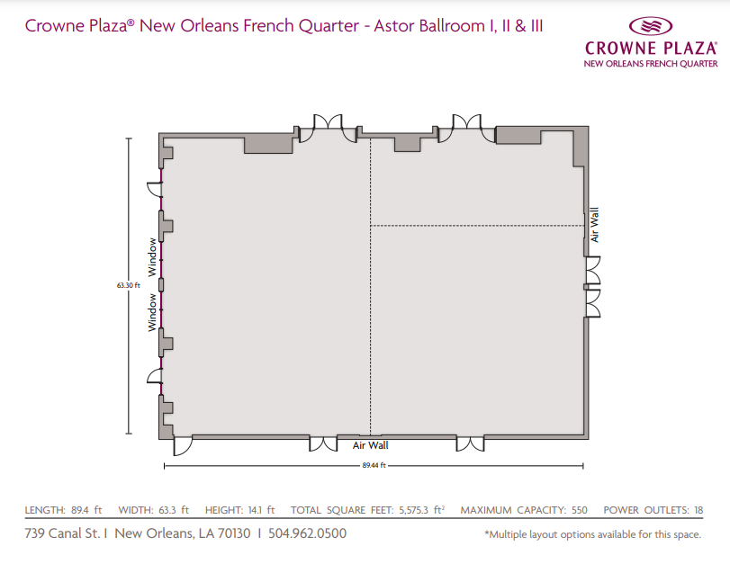 Located on the second floor of the hotel this is the largest ballroom, with Bourbon and Iberville balcony access.