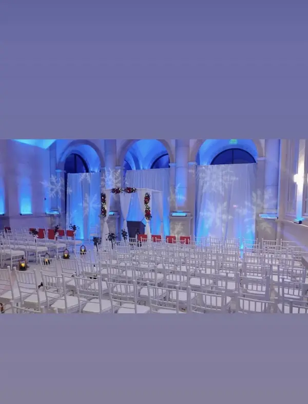 Customized colors for the chandelier, beautiful archways and outside up lighting.