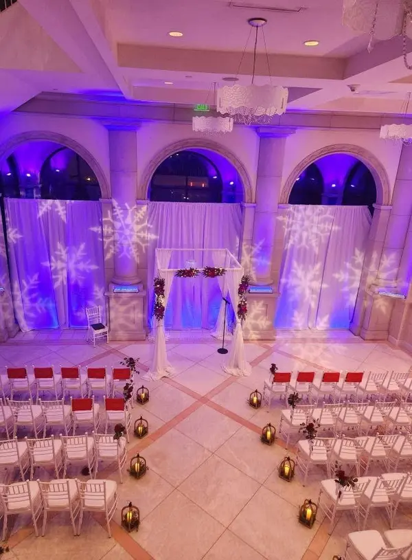 A dramatic three-story marble foyer with a stunning chandelier, floor-to-ceiling windows overlooking the marina, a classic wood dance floor, customizable lighting, and a private outdoor balcony for guests to enjoy.
