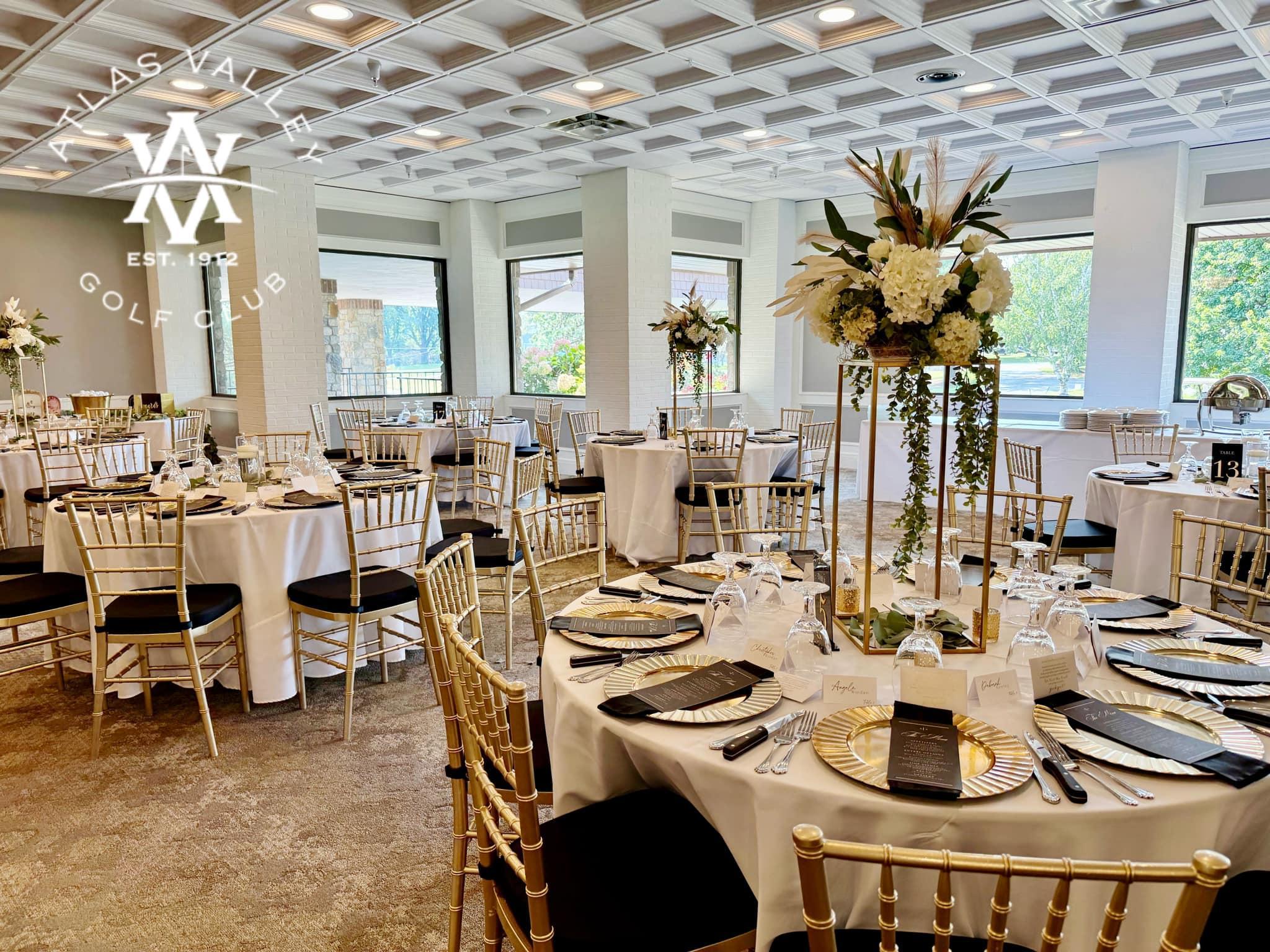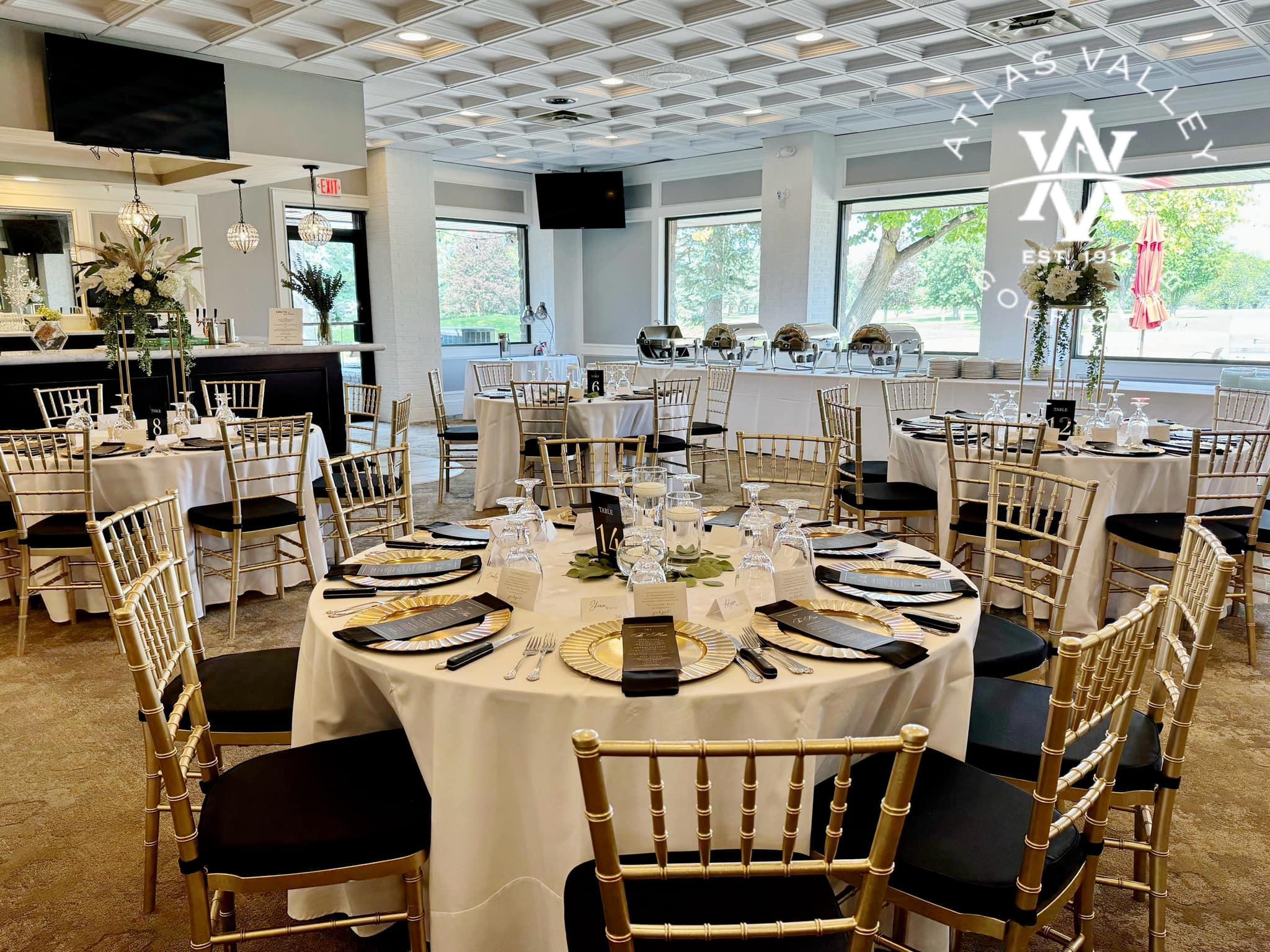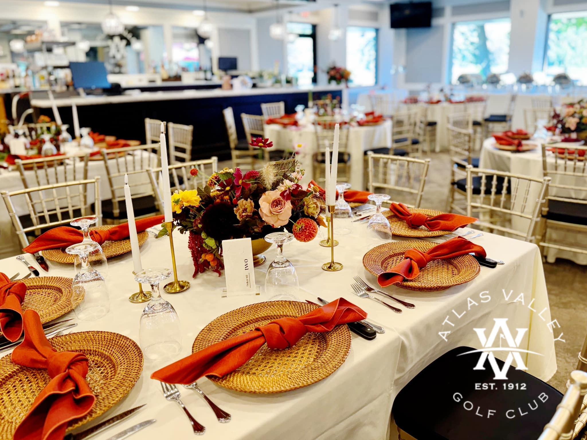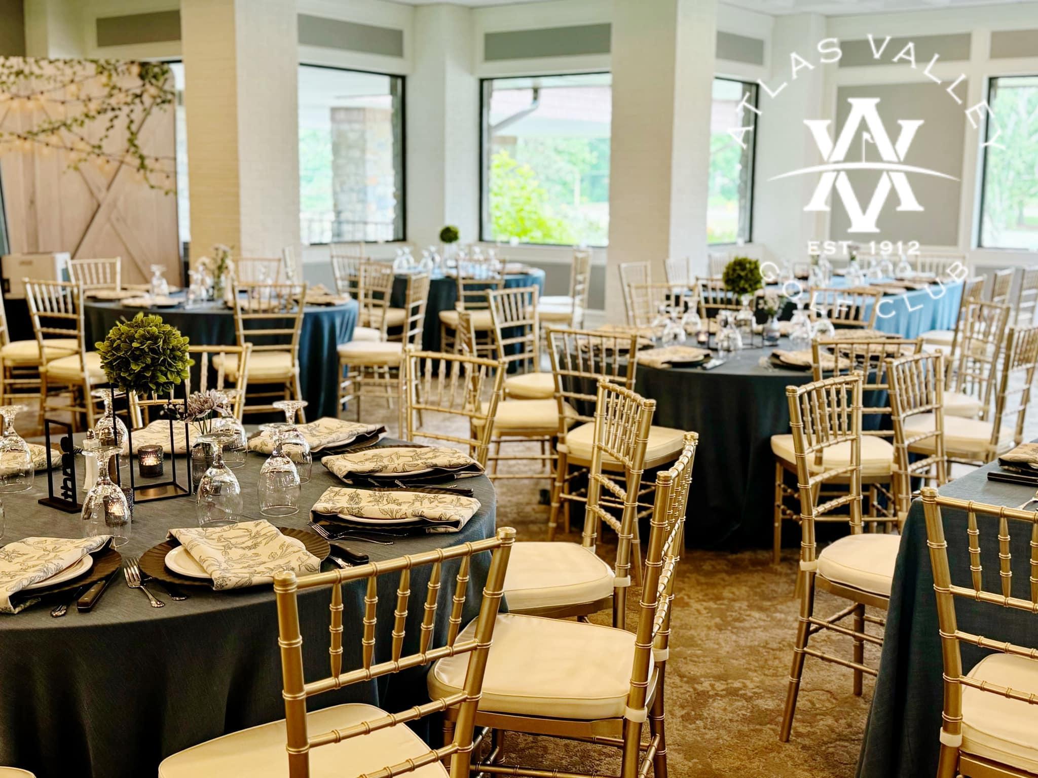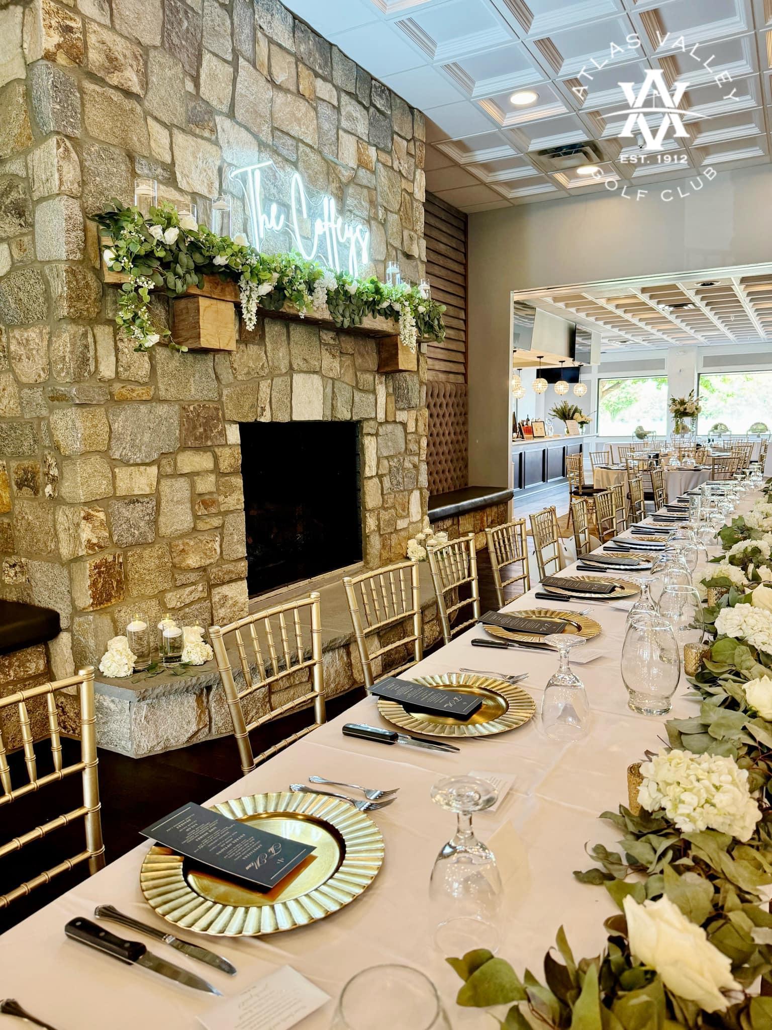 At Atlas Valley, we offer an elegant wedding venue surrounded by the lush beauty of our golf course. Our newly renovated space can comfortably accommodate up to 200 guests and includes a built-in dance floor, two built-in venue bars, and beautiful patio access perfect for a cocktail hour. We offer both outdoor and indoor accommodations for ceremonies, ensuring your wedding is exactly how you envision it.